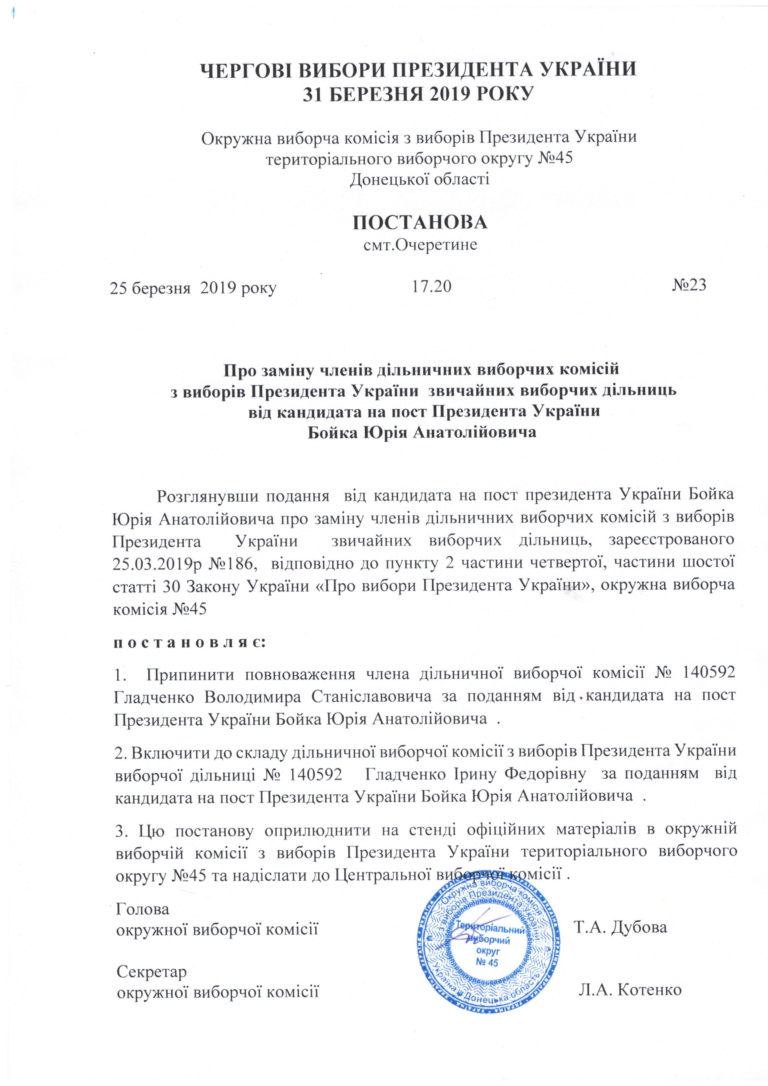 Про заміну членів дільничних виборчих комісій з виборів Президента України звичайних виборчих дільниць від кандидата на пост Президента України Бойка Юрія Анатолійовича |