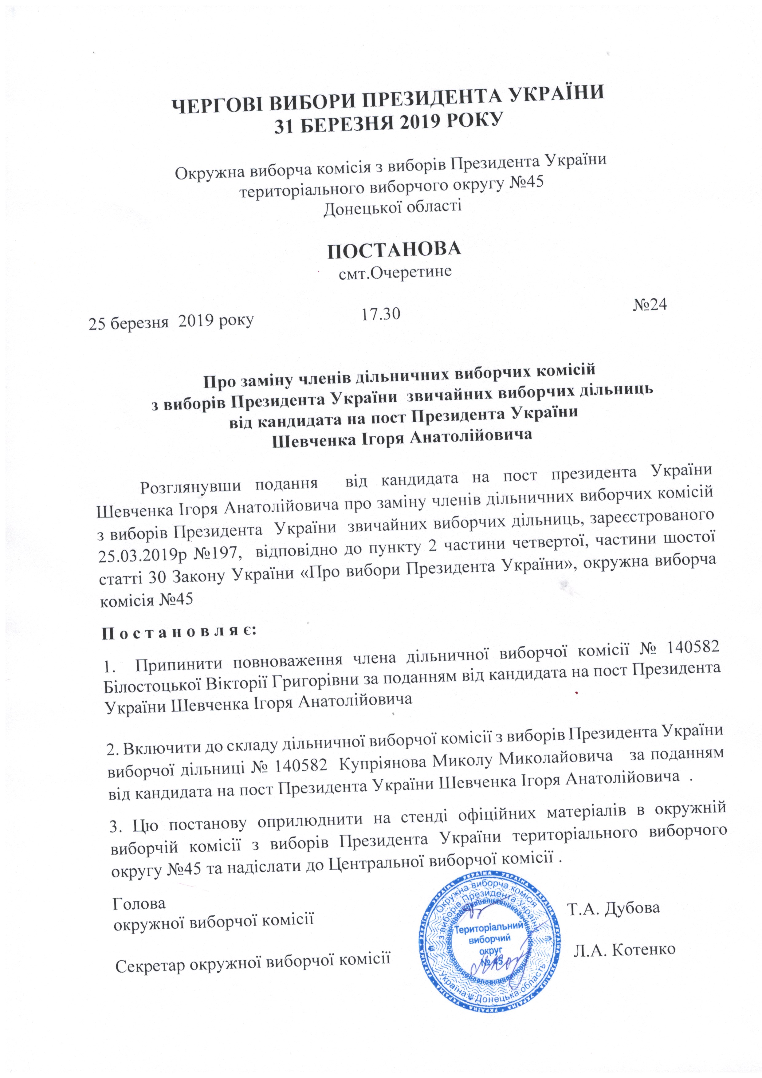 Про заміну членів дільничних виборчих комісій з виборів Президента України звичайних виборчих дільниць від кандидата на пост Президента України Шевченка Ігоря Анатолійовича |