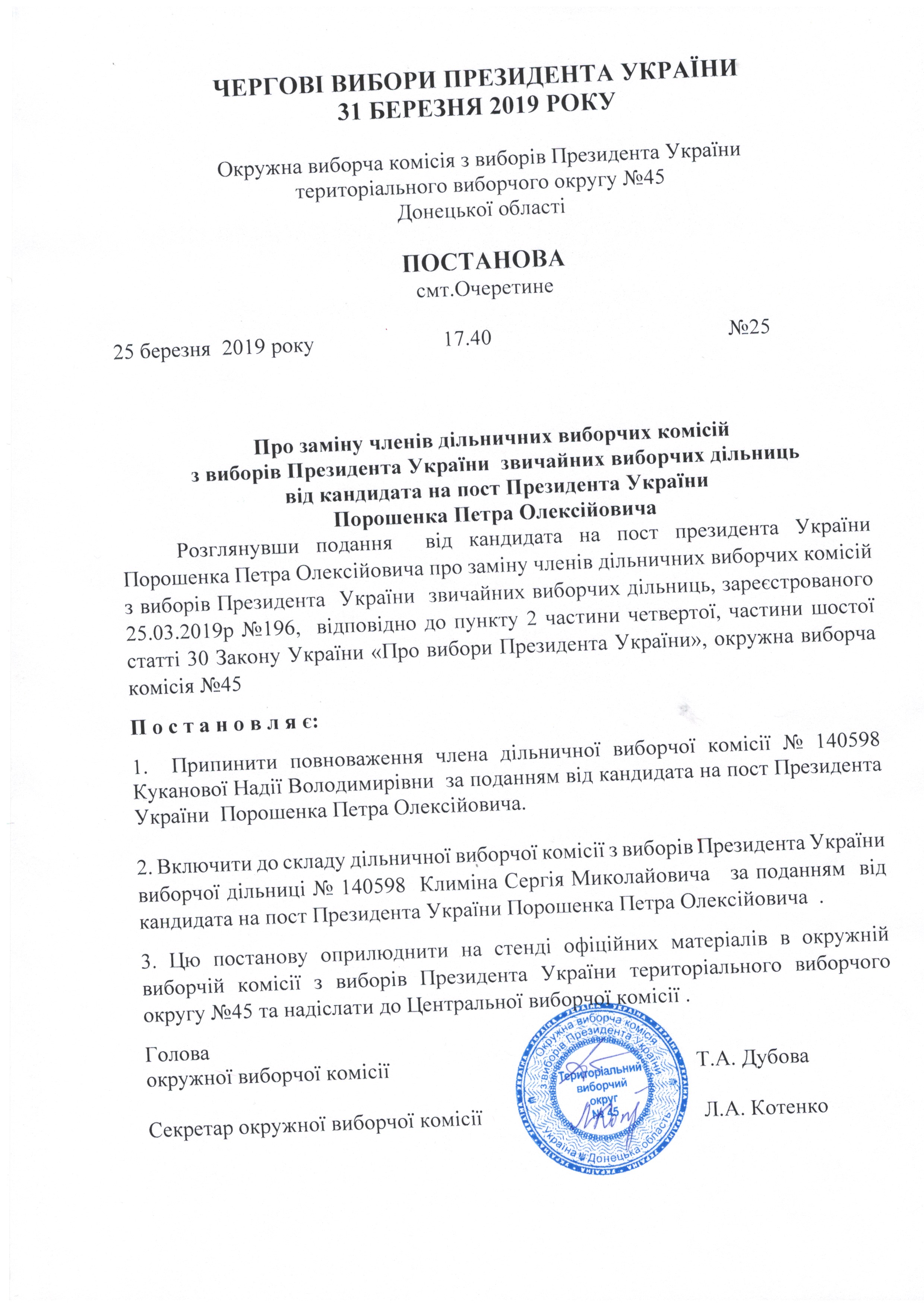 Про заміну членів дільничних виборчих комісій з виборів Президента України звичайних виборчих дільниць від кандидата на пост Президента України Зеленського Володимира Олександровича |