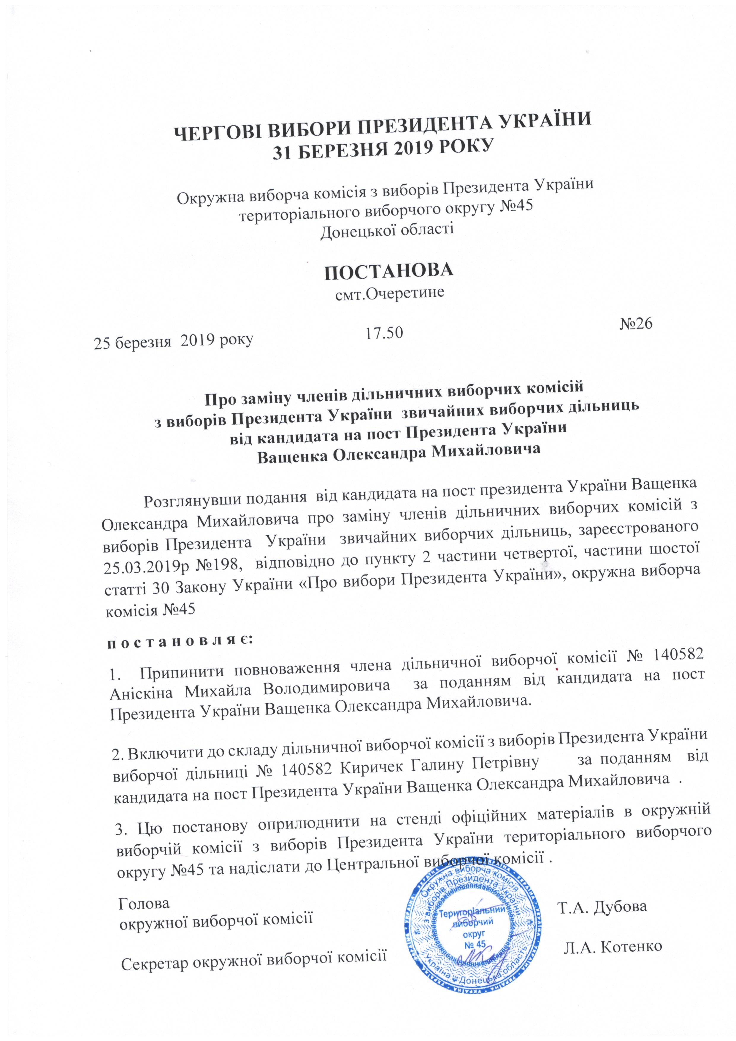 Про заміну членів дільничних виборчих комісій з виборів Президента України звичайних виборчих дільниць від кандидата на пост Президента України Ващенка Олександра Михайловича |