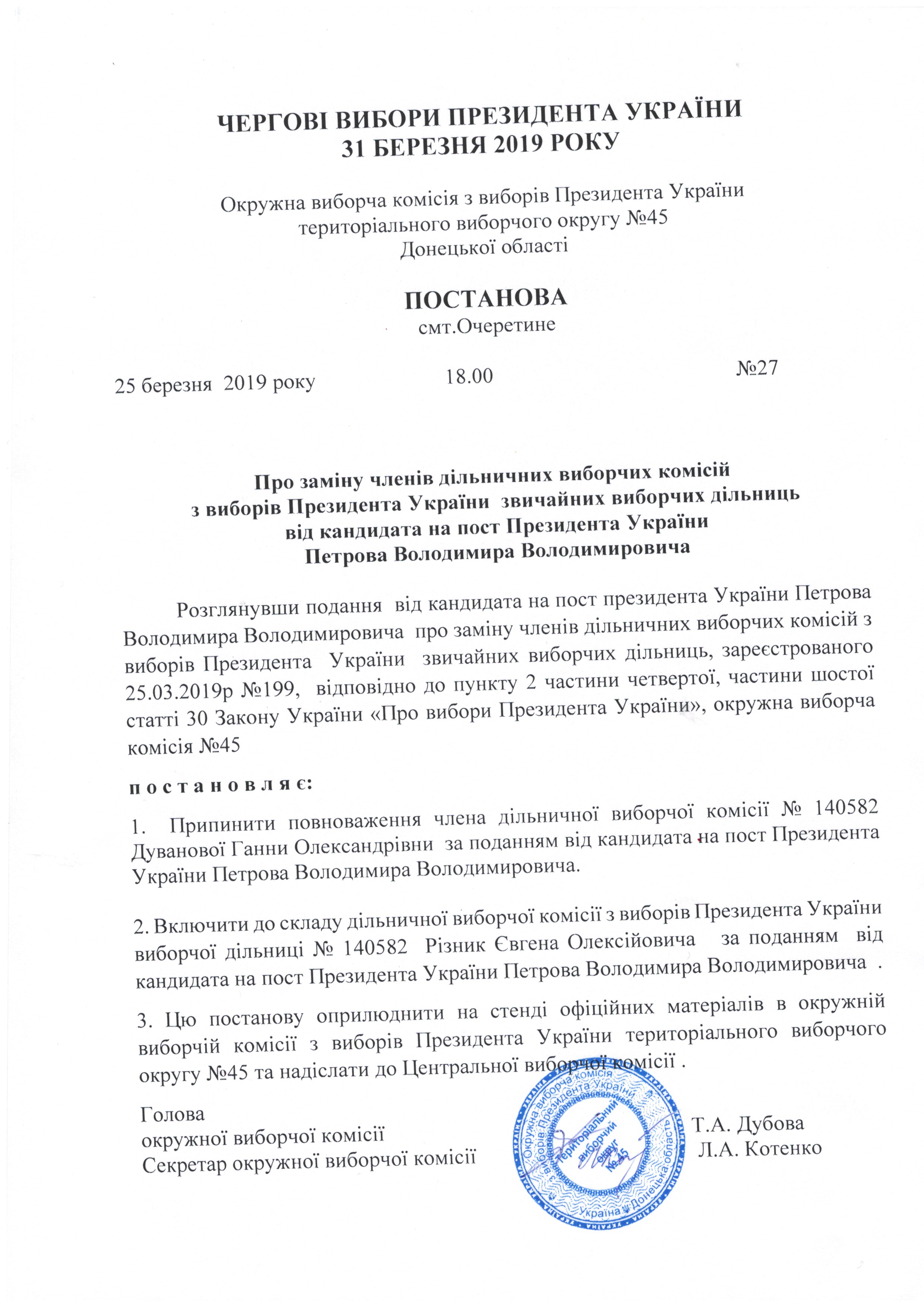 Про заміну членів дільничних виборчих комісій з виборів Президента України звичайних виборчих дільниць від кандидата на пост Президента України Петрова Володимира Володимировича |