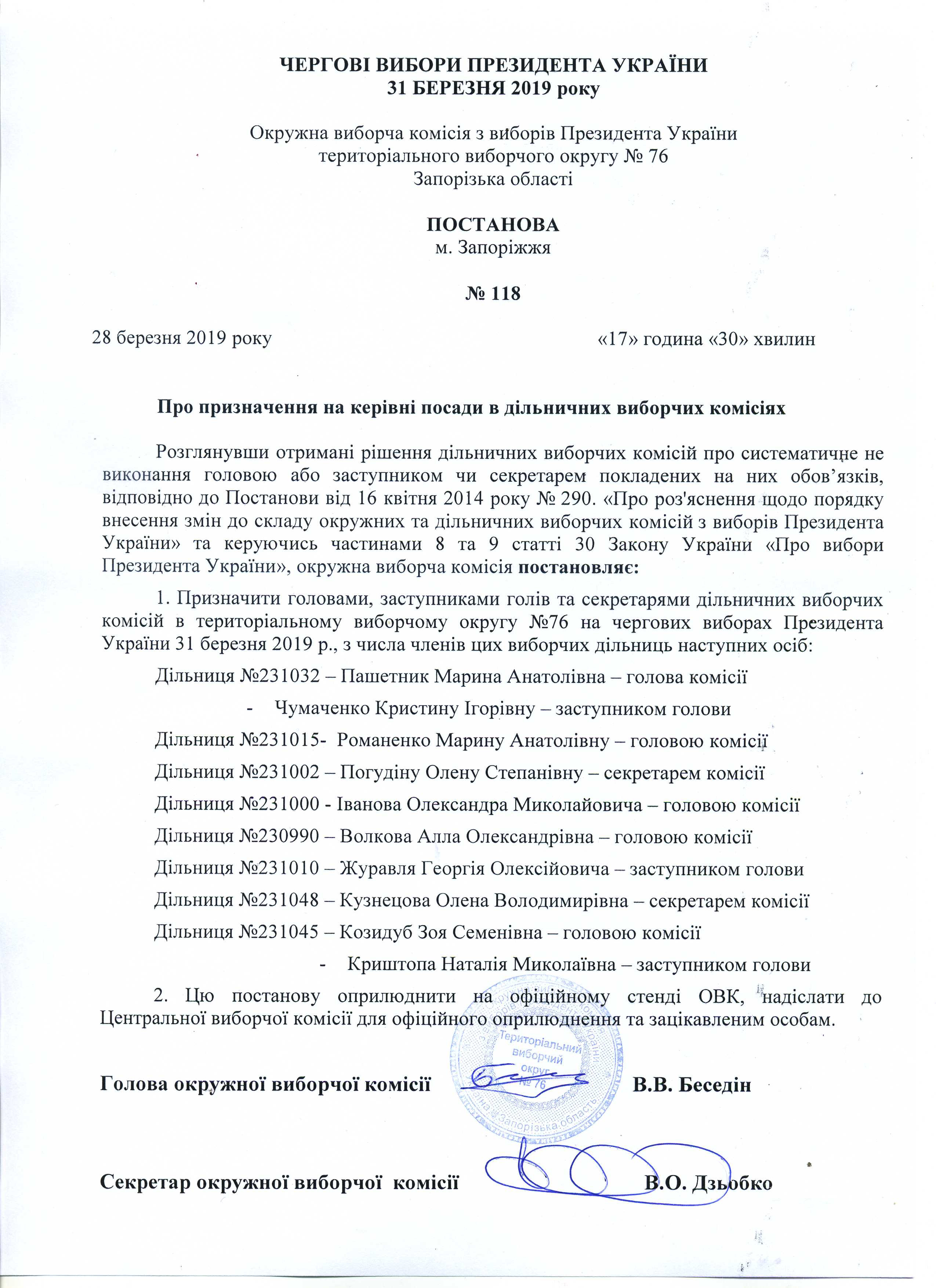 Про призначення на керівні посади в дільничних виборчих комісіях |