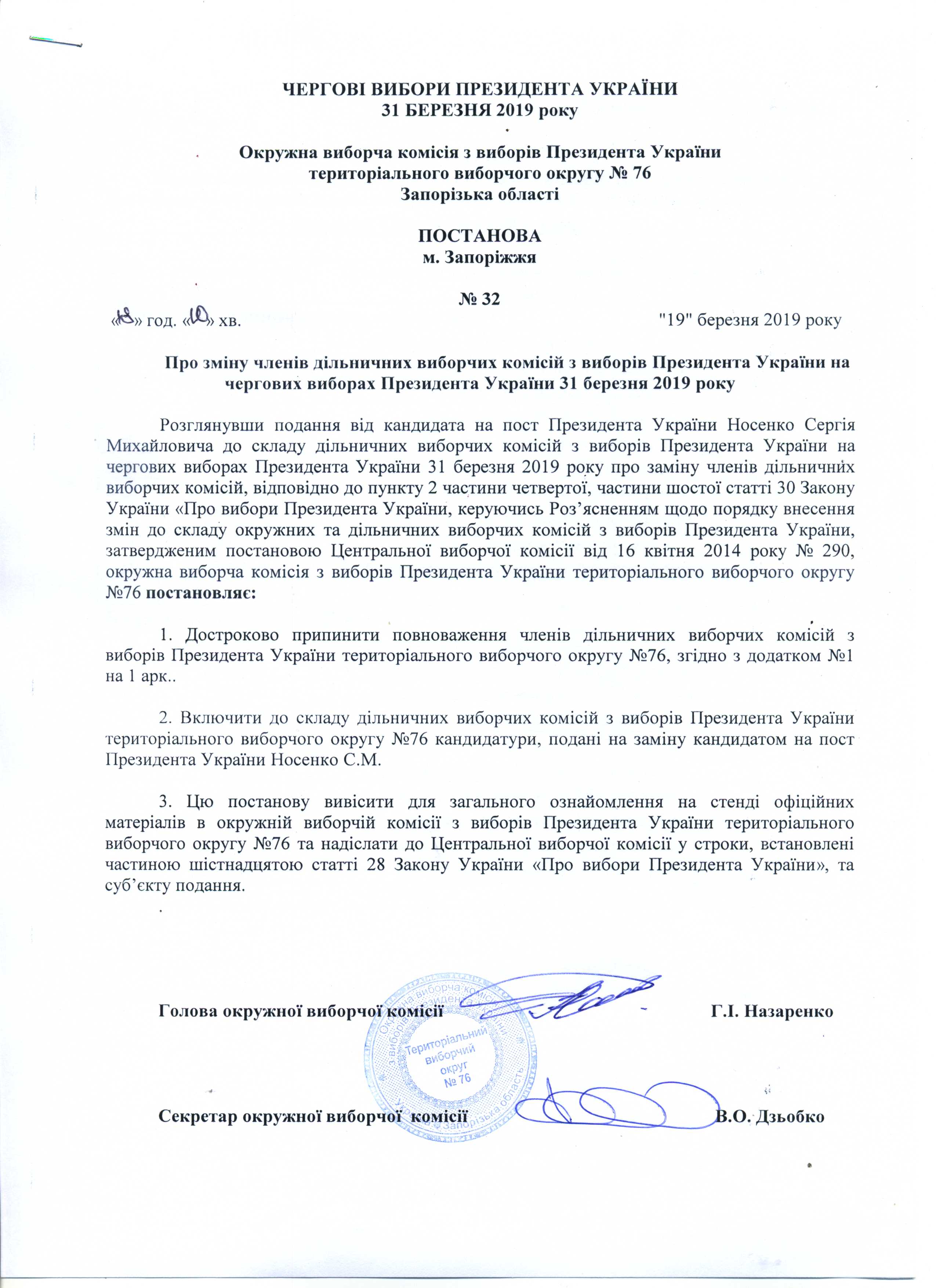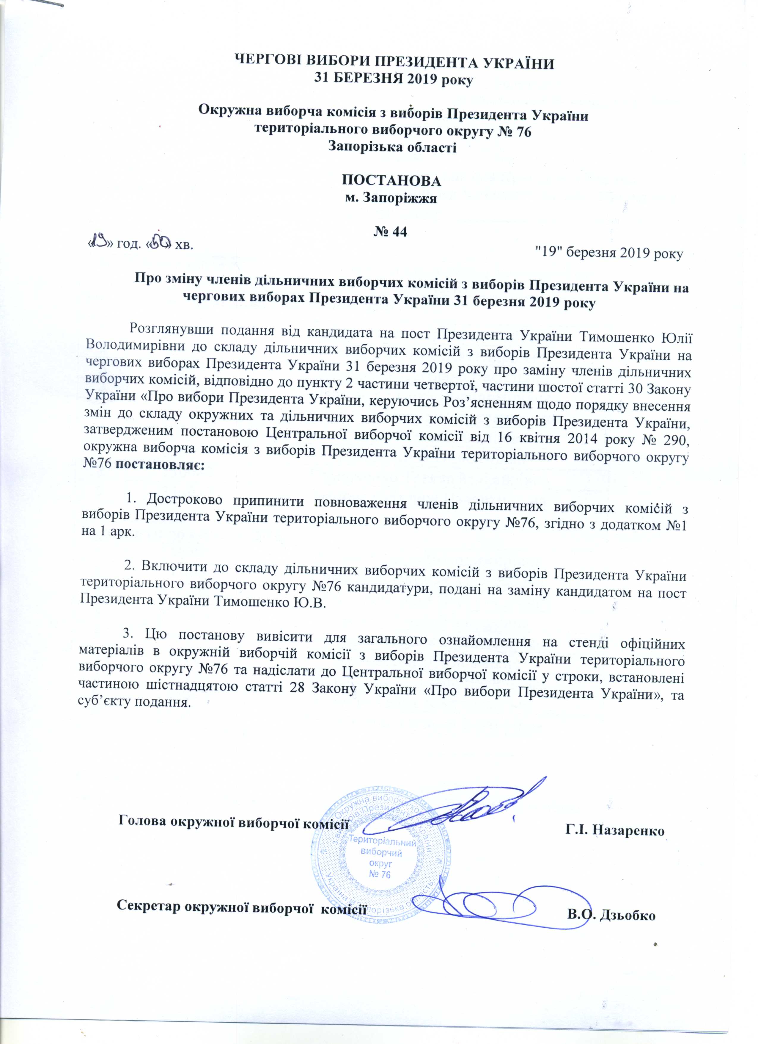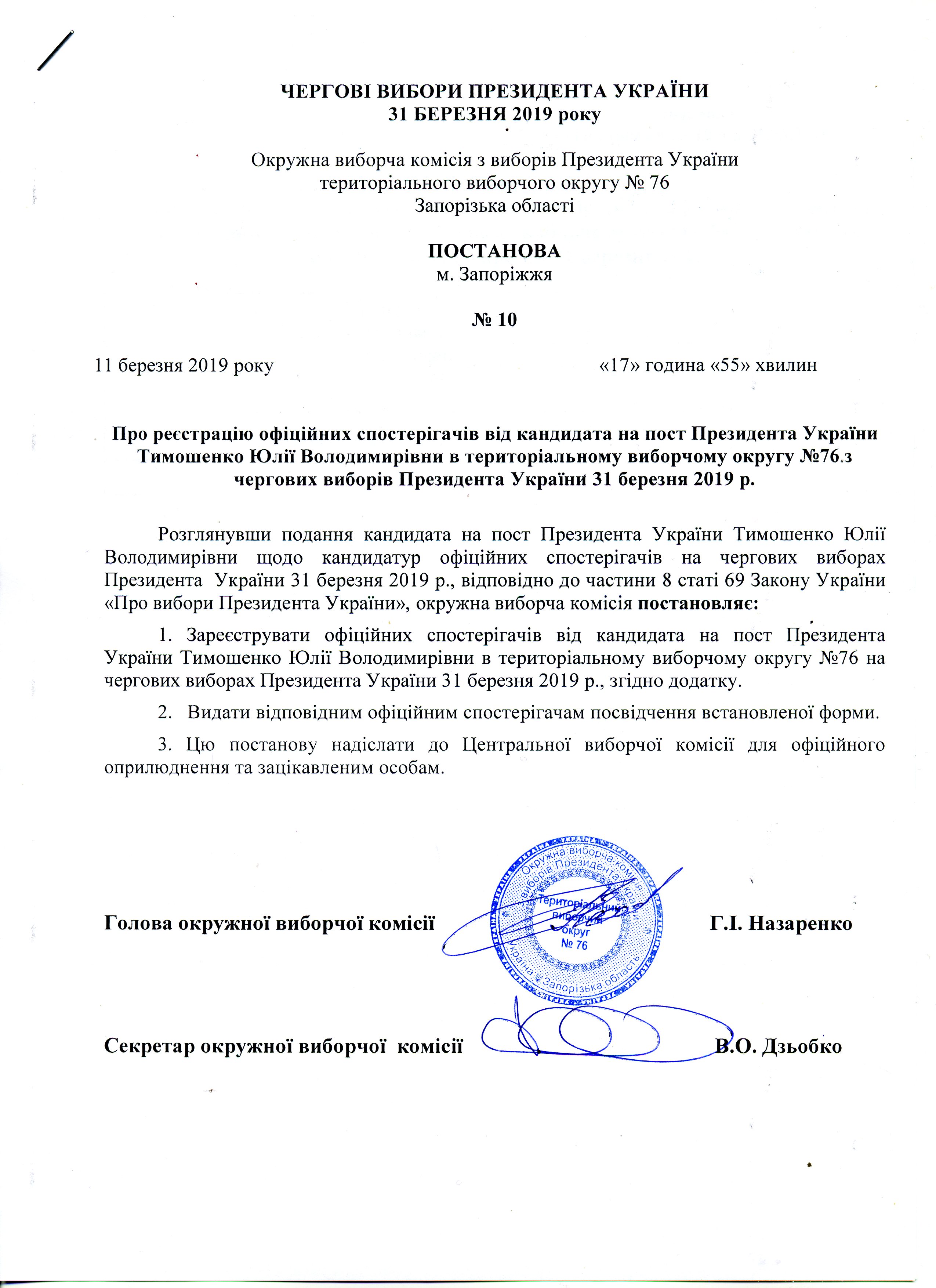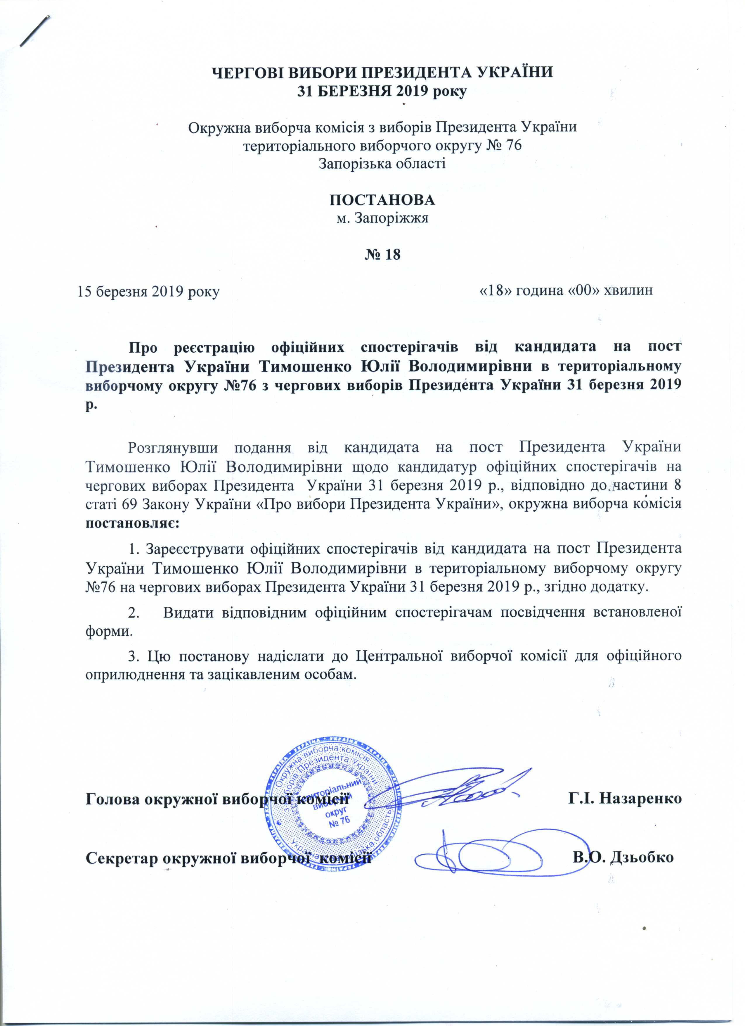 Про реєстрацію офіційних спостерігачів від кандидата на пост Президента України Тимошенко Юлії Володимирівни в територіальному виборчому округу №76 з чергових виборів Президента України 31 березня 2019 року |