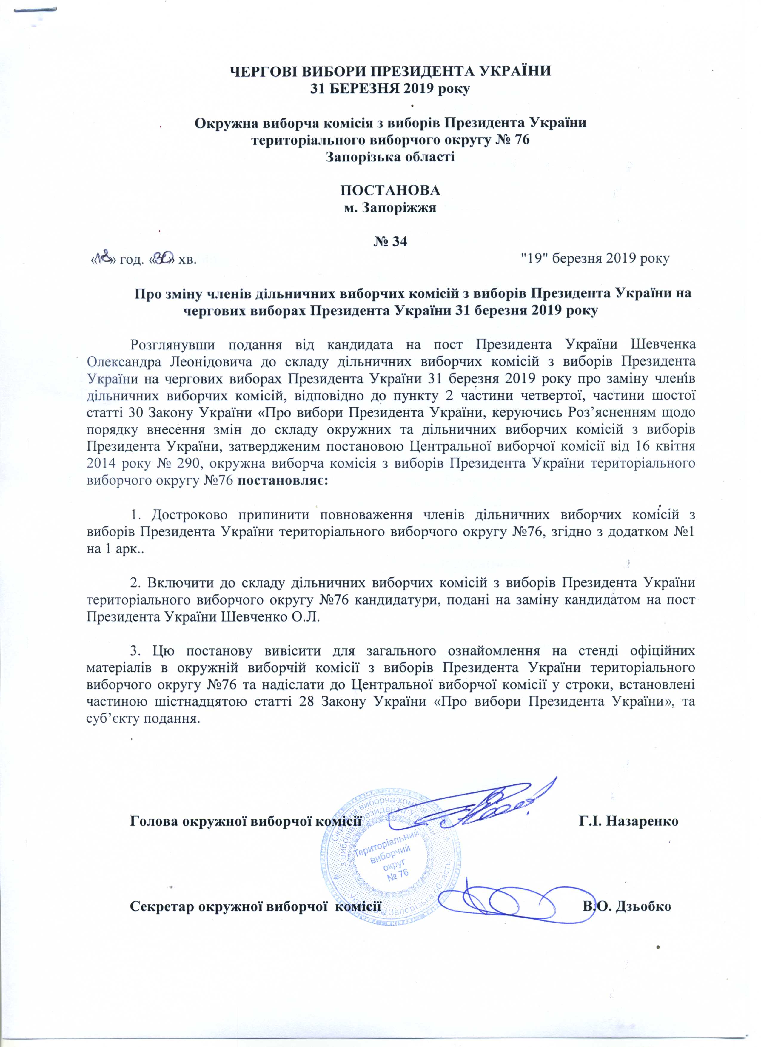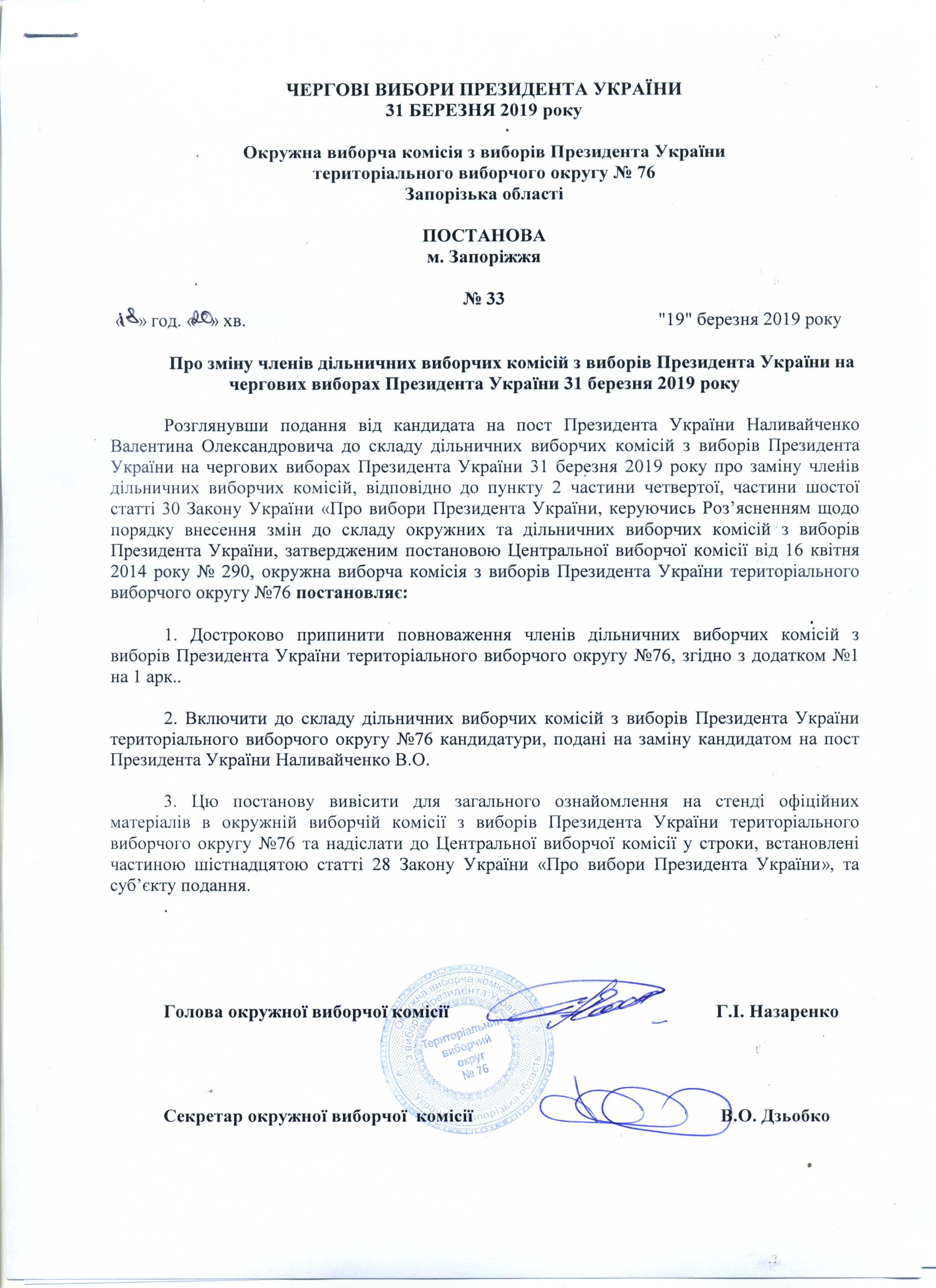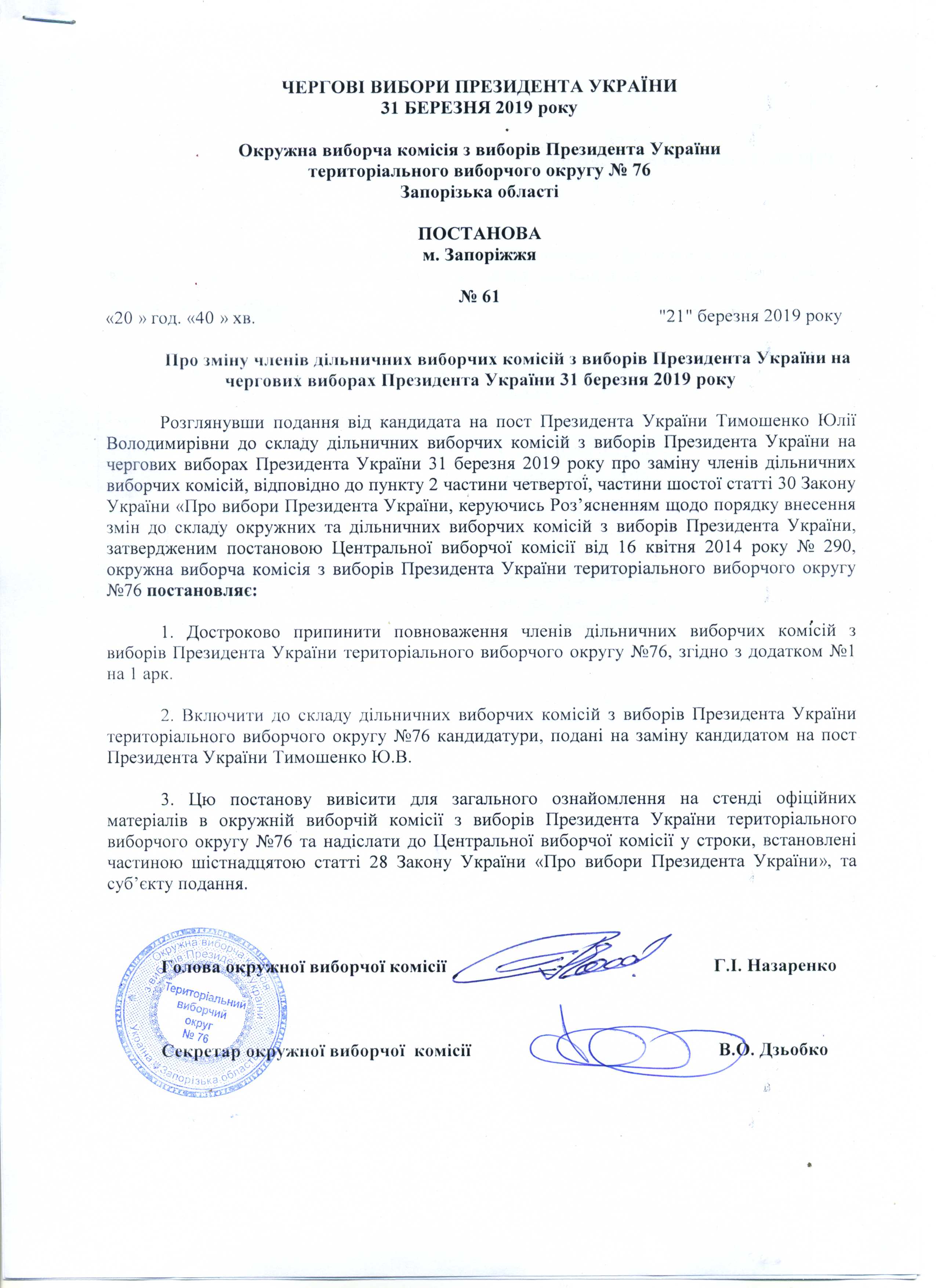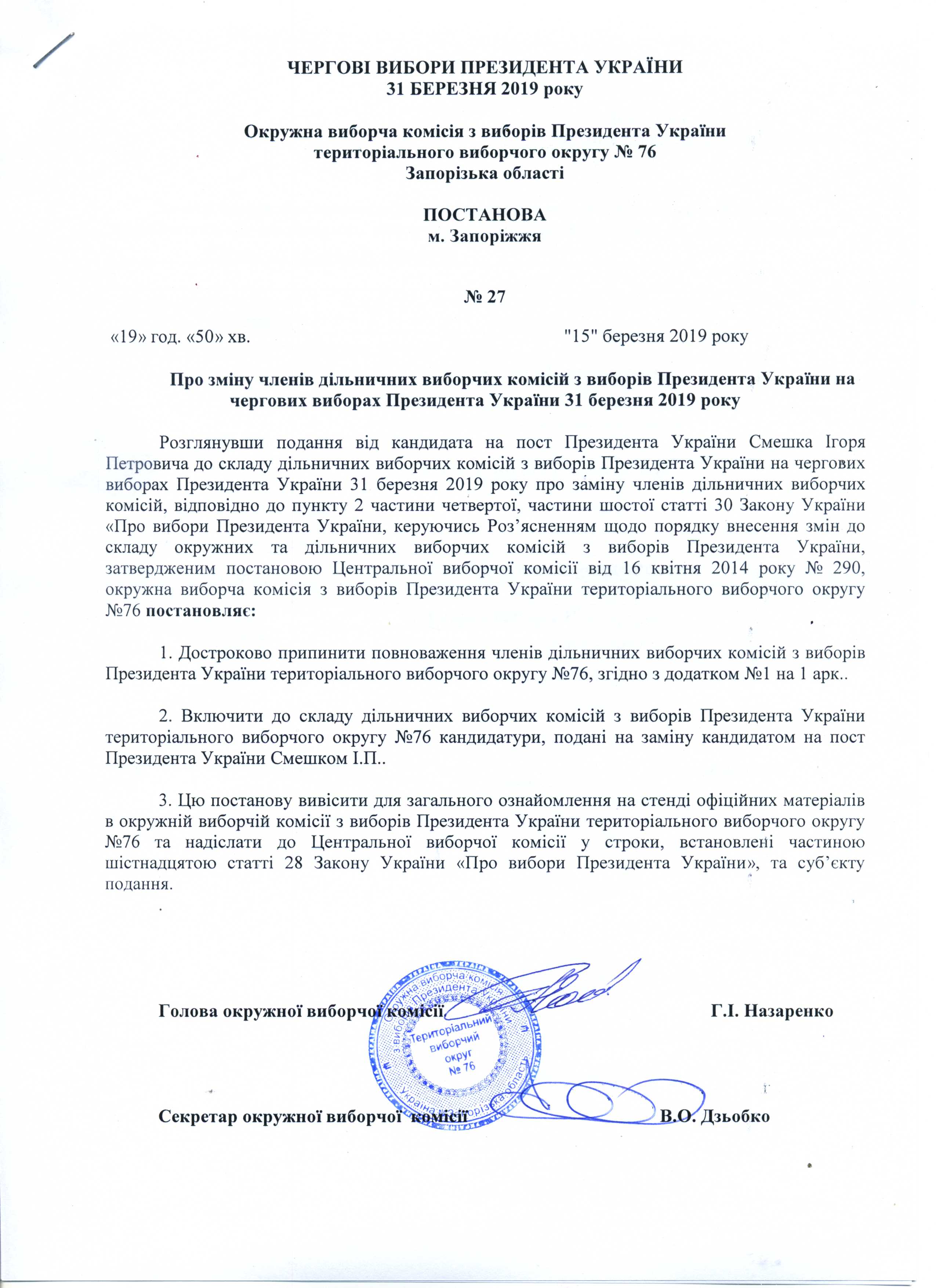 Про реєстрацію офіційних спостерігачів від кандидата на пост Президента України Тимошенко Юлії Володимирівни в територіальному виборчому округу №76 з чергових виборів Президента України 31 березня 2019 року |
