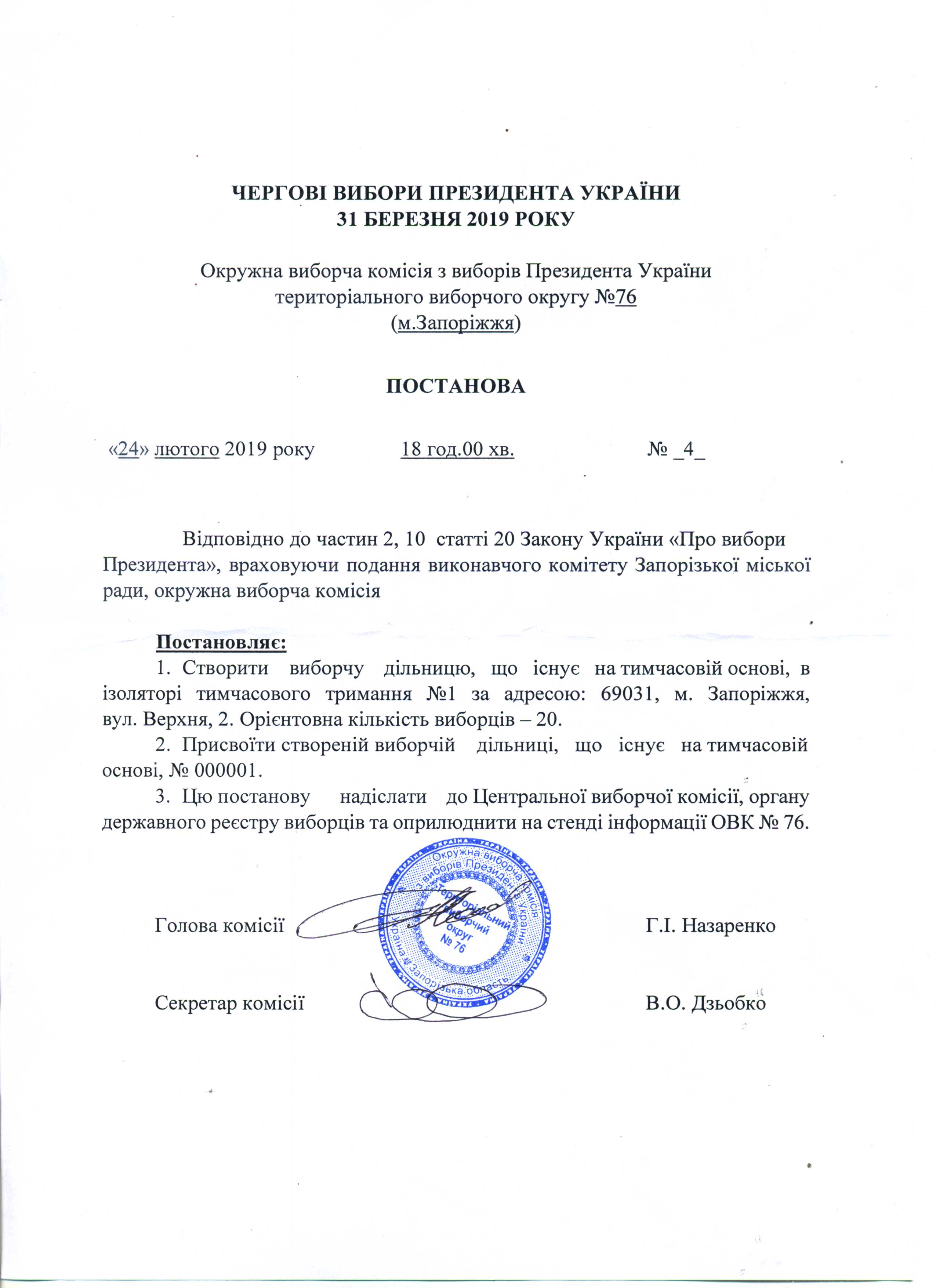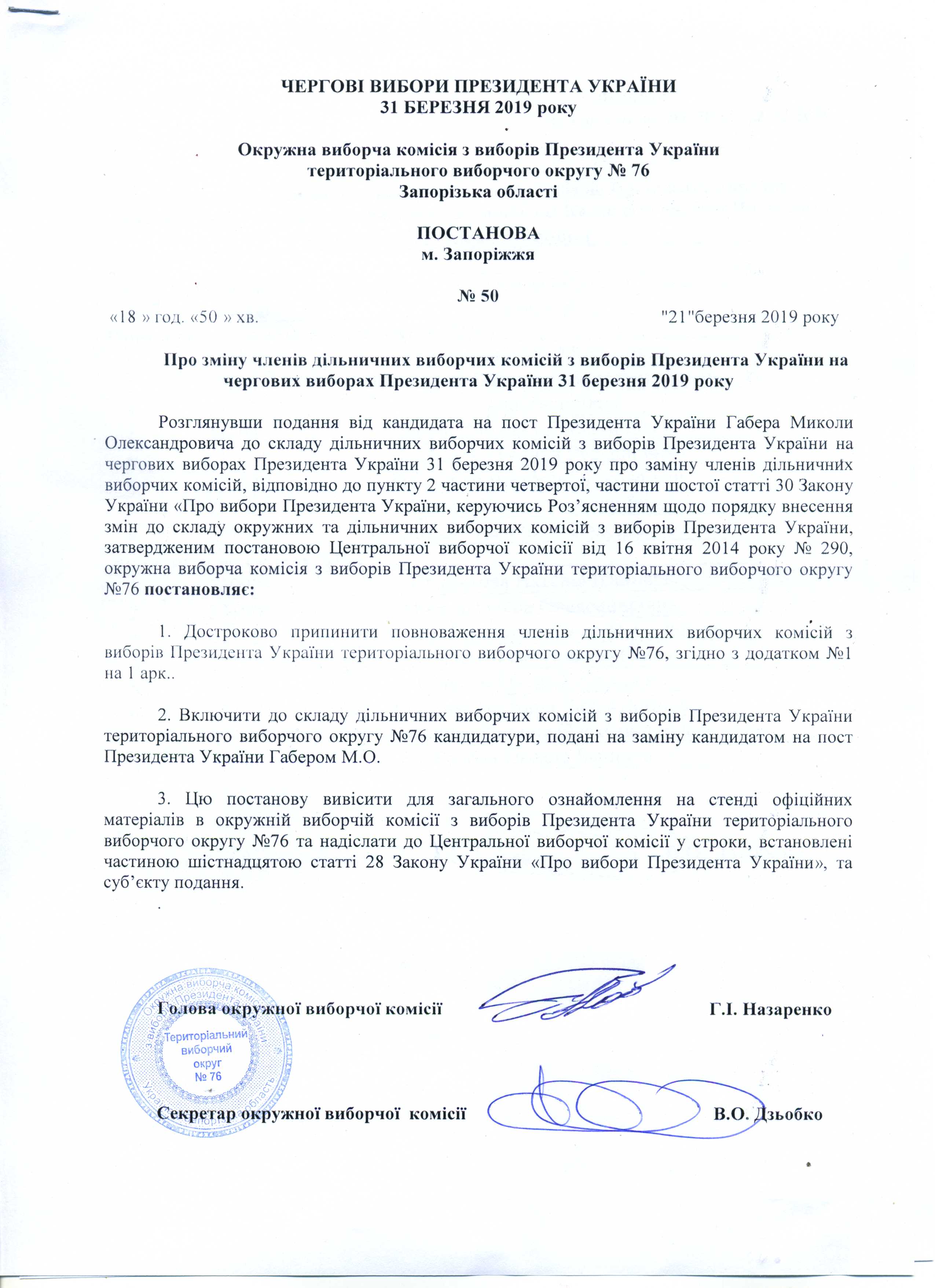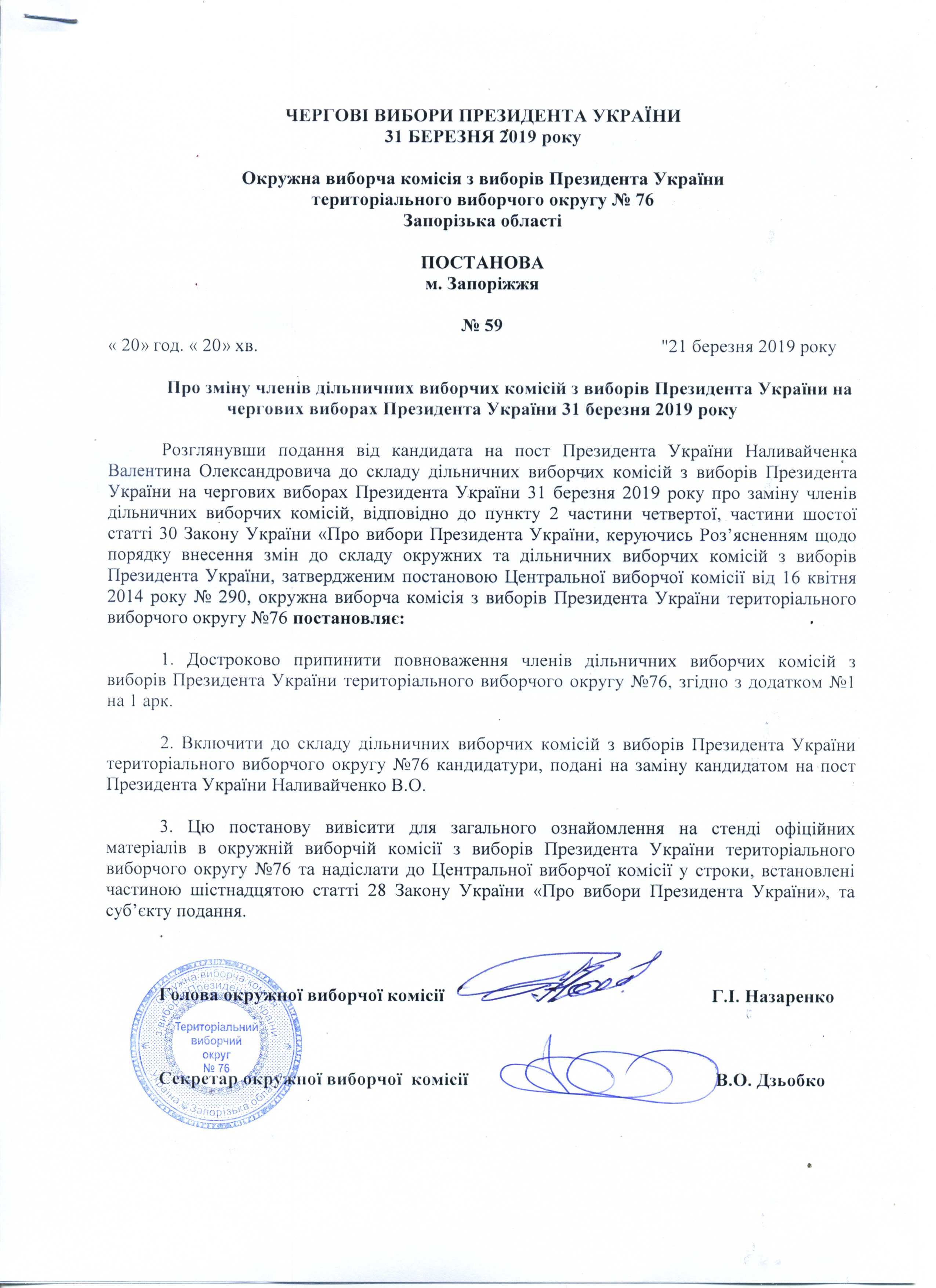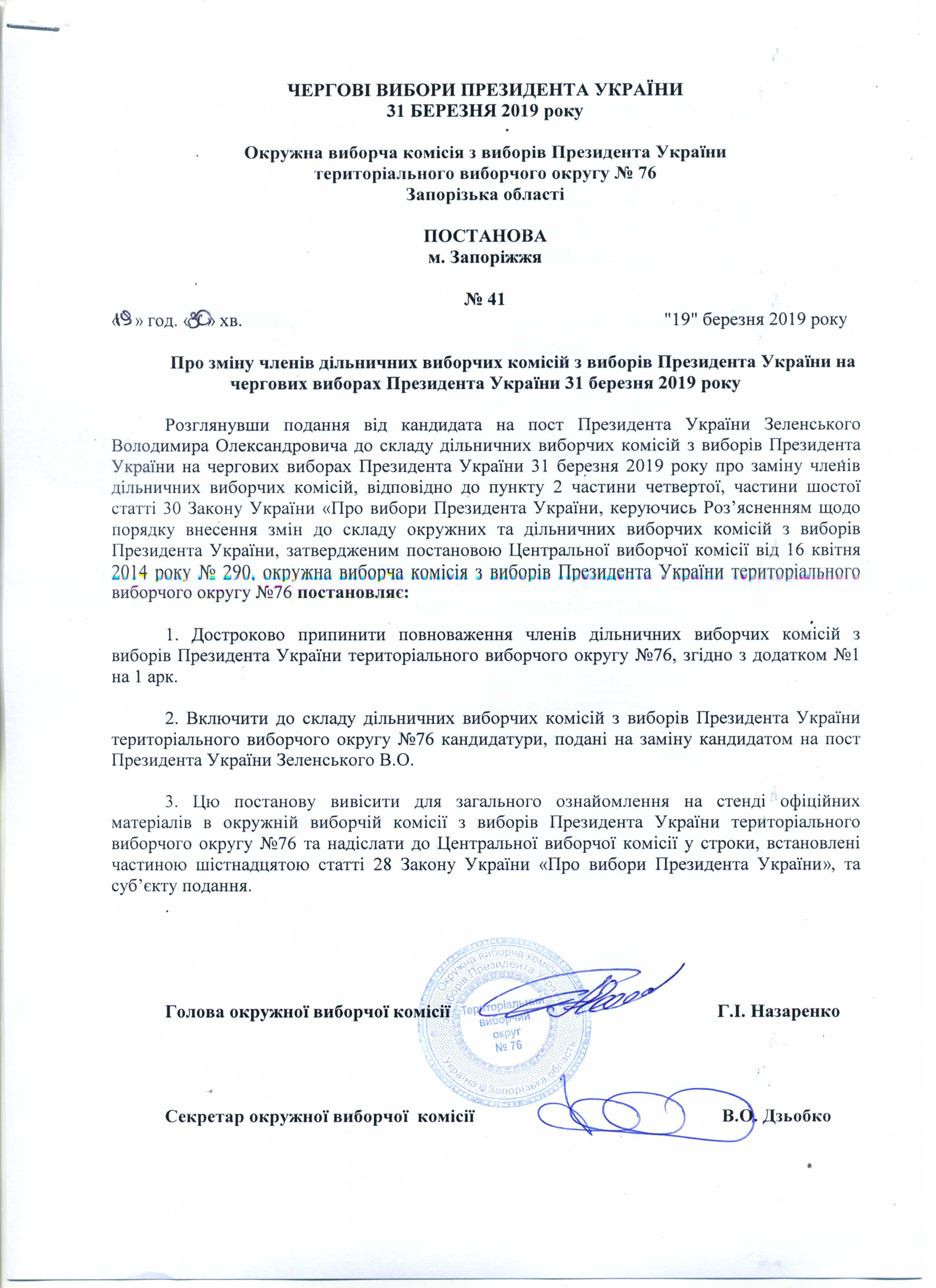 Про реєстрацію офіційних спостерігачів від кандидата на пост Президента України Тимошенко Юлії Володимирівни в територіальному виборчому округу №76 з чергових виборів Президента України 31 березня 2019 року |