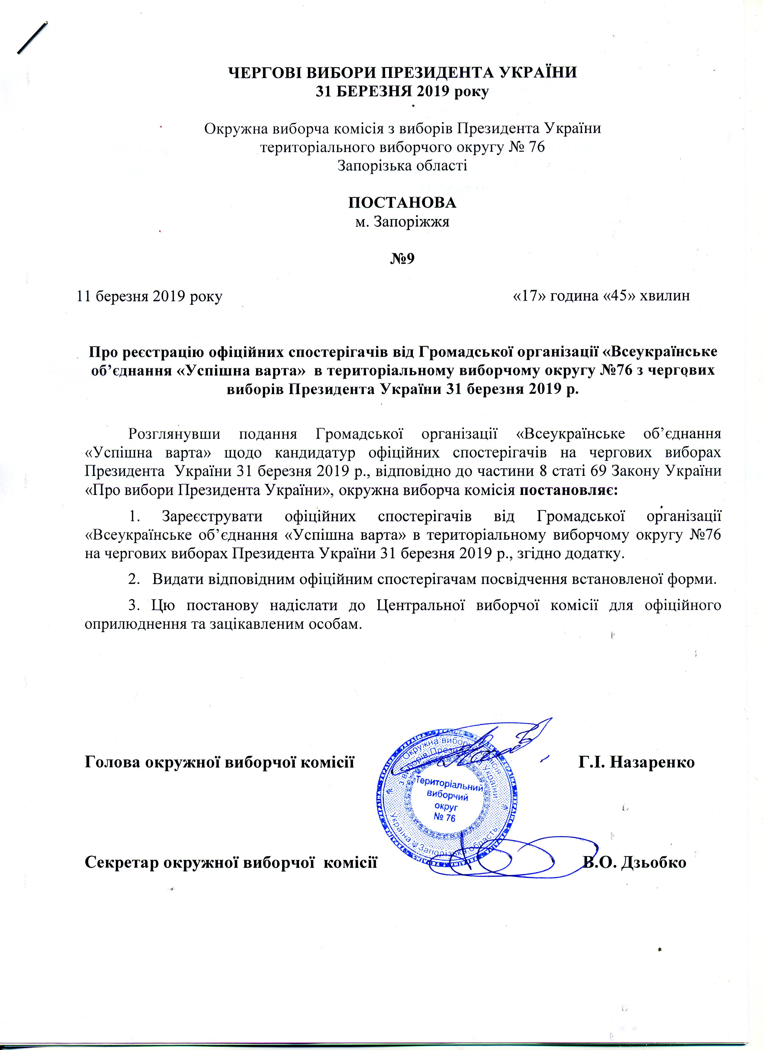 Про реєстрацію офіційних спостерігачів від громадської організації "Всеукраїнське об'єднання "Успішна варта" в територіальному виборчому округу №76 з чергових виборів Президента України 31 березня 2019 р. |