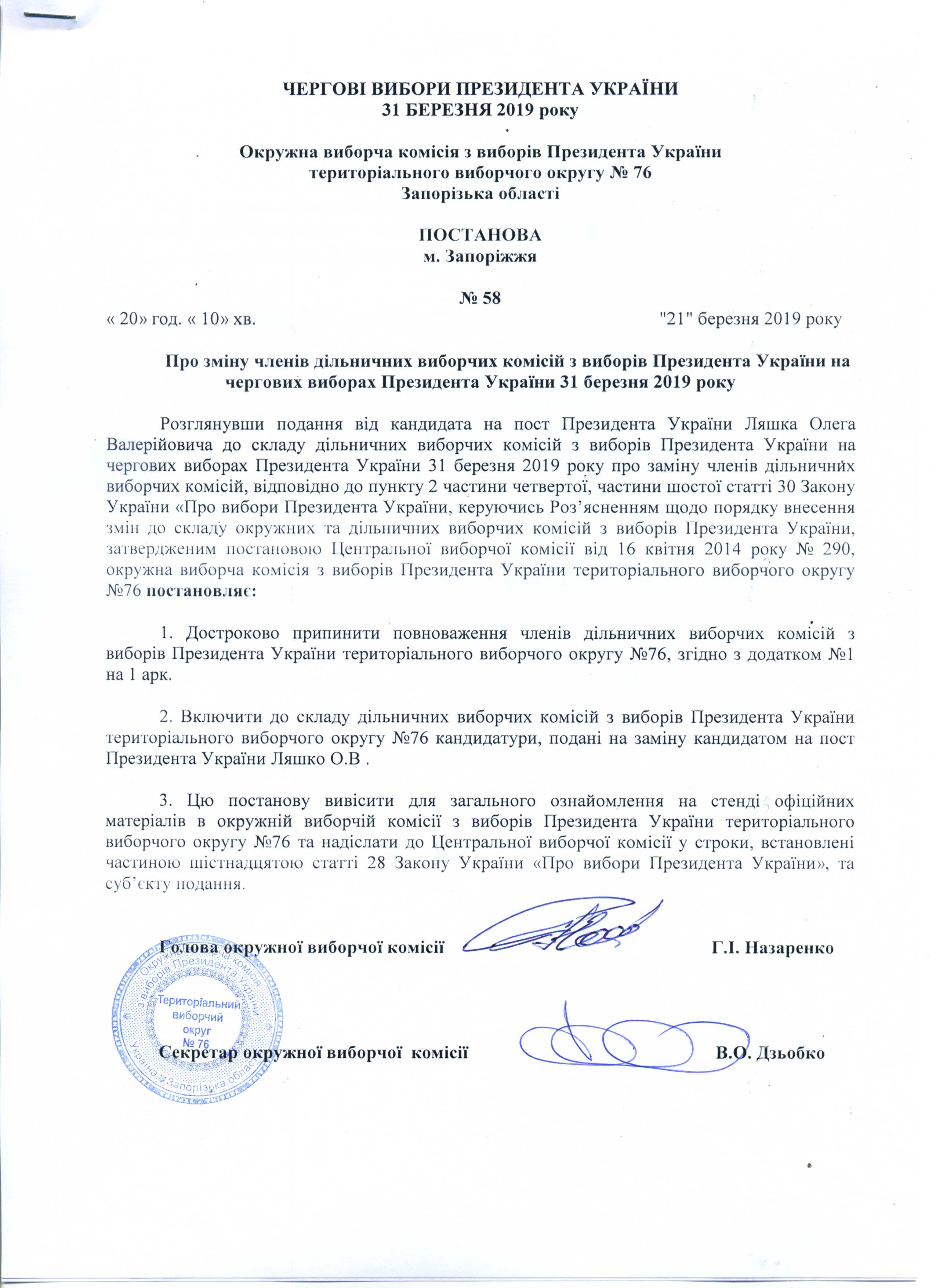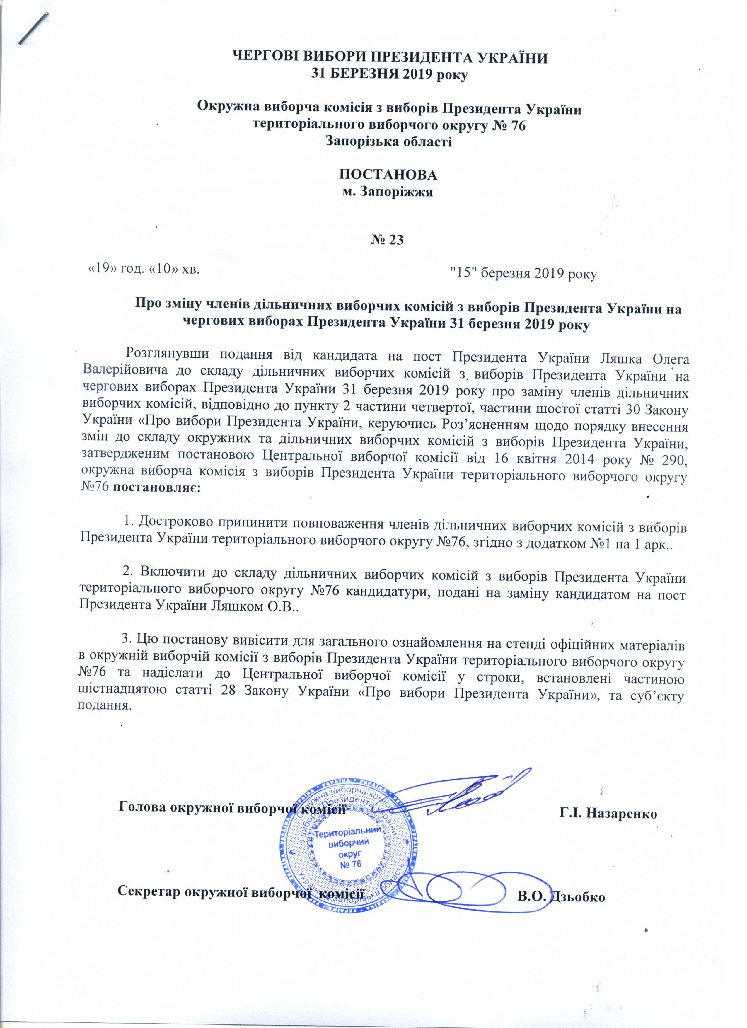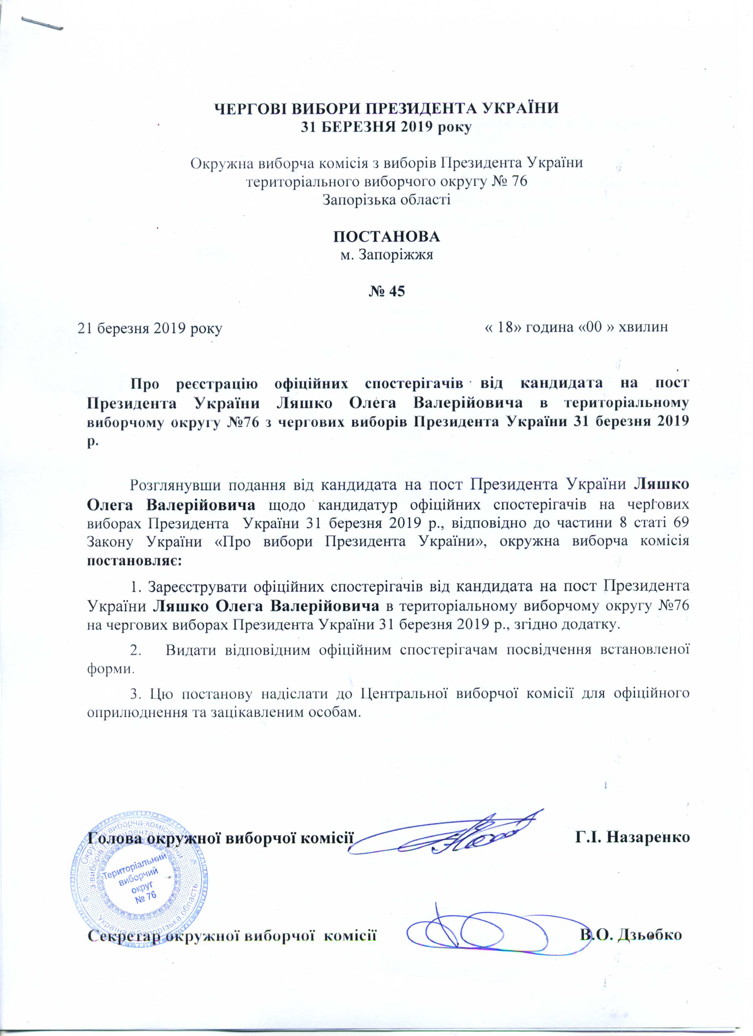 Про реєстрацію офіційних спостерігачів від кандидата на пост Президента УкраїниЛяшко Олега Валерійовича в територіальному виборчому округу №76 з чергових виборів Президента України 31 березня 2019 року |