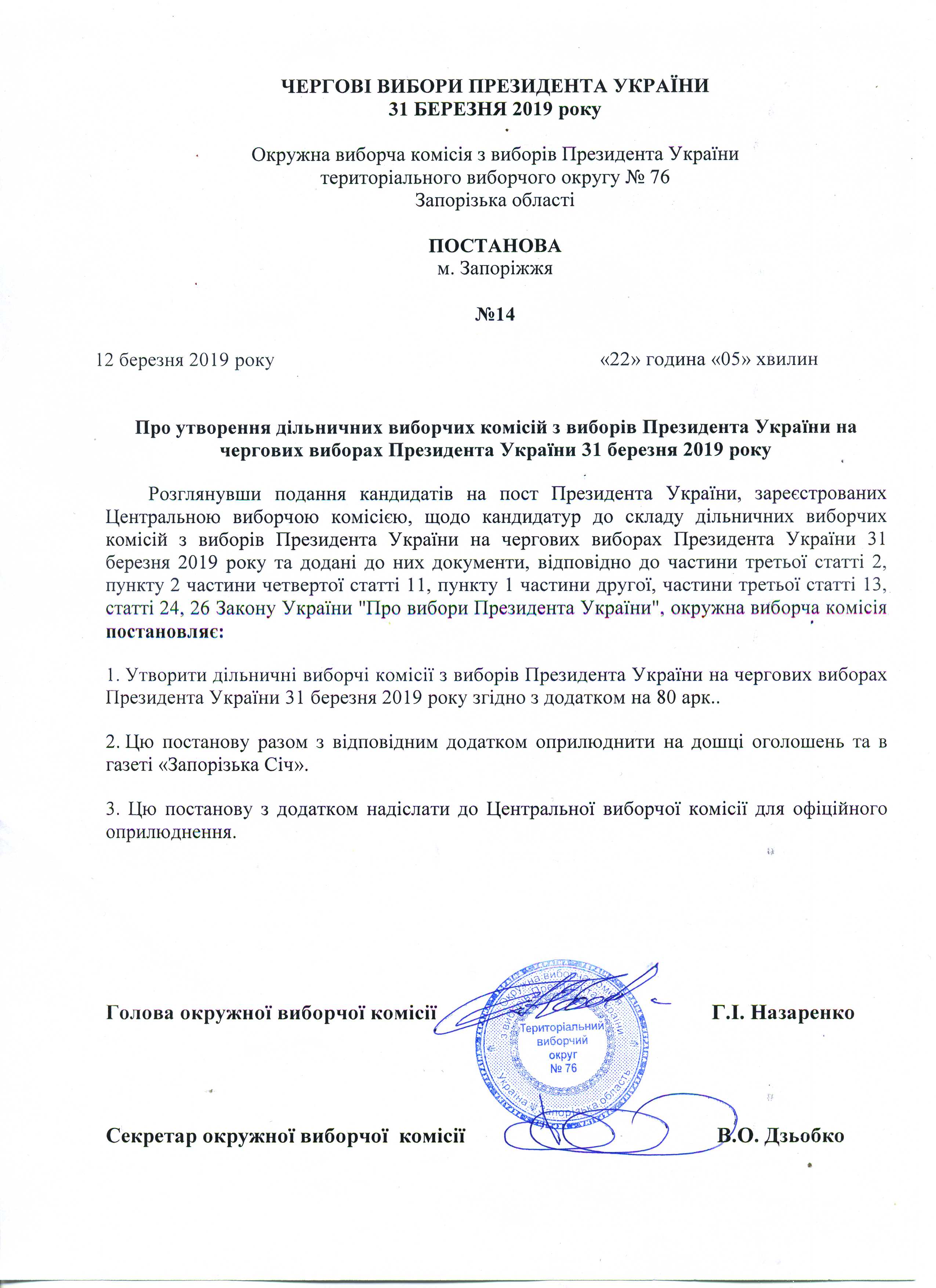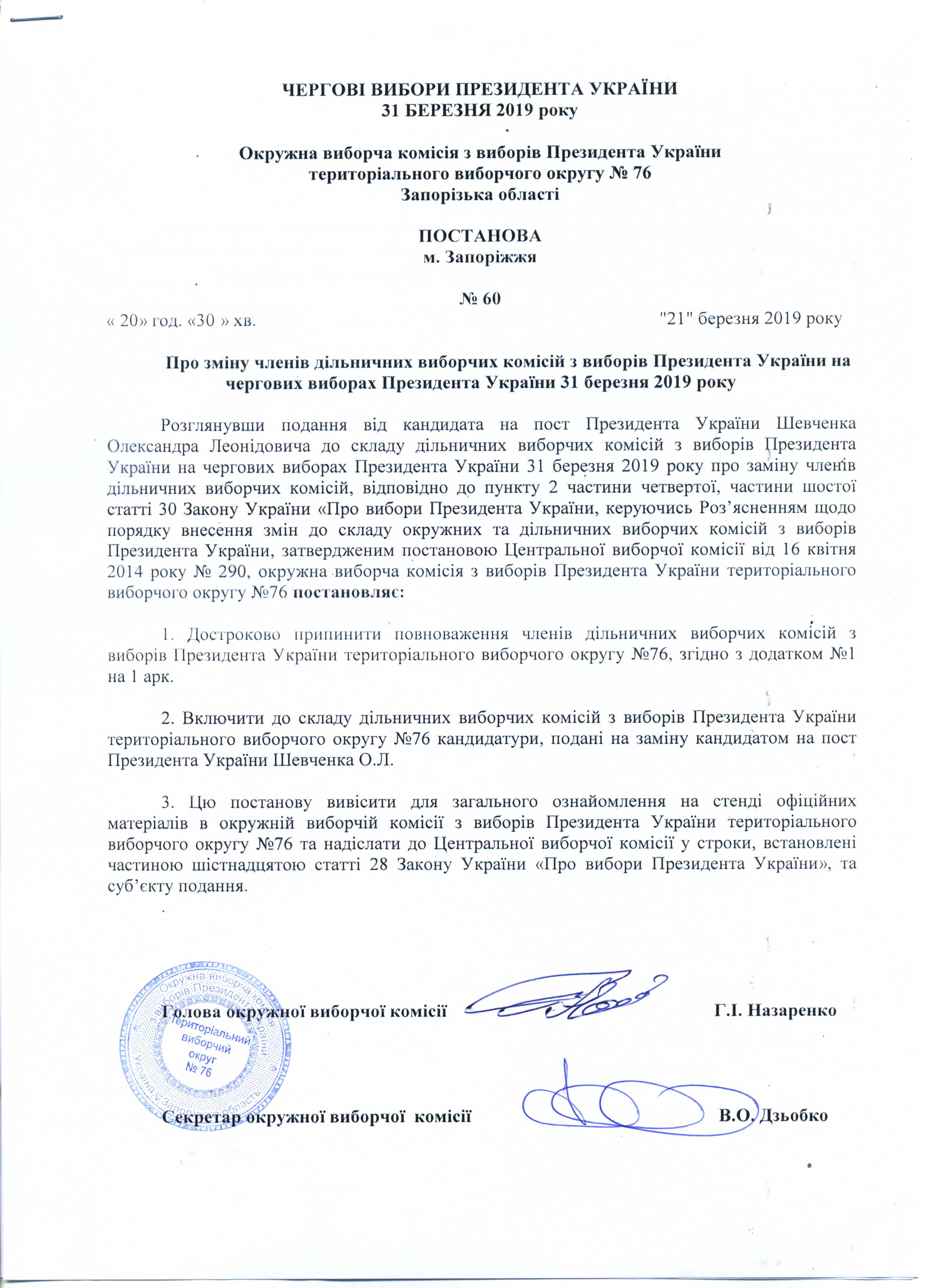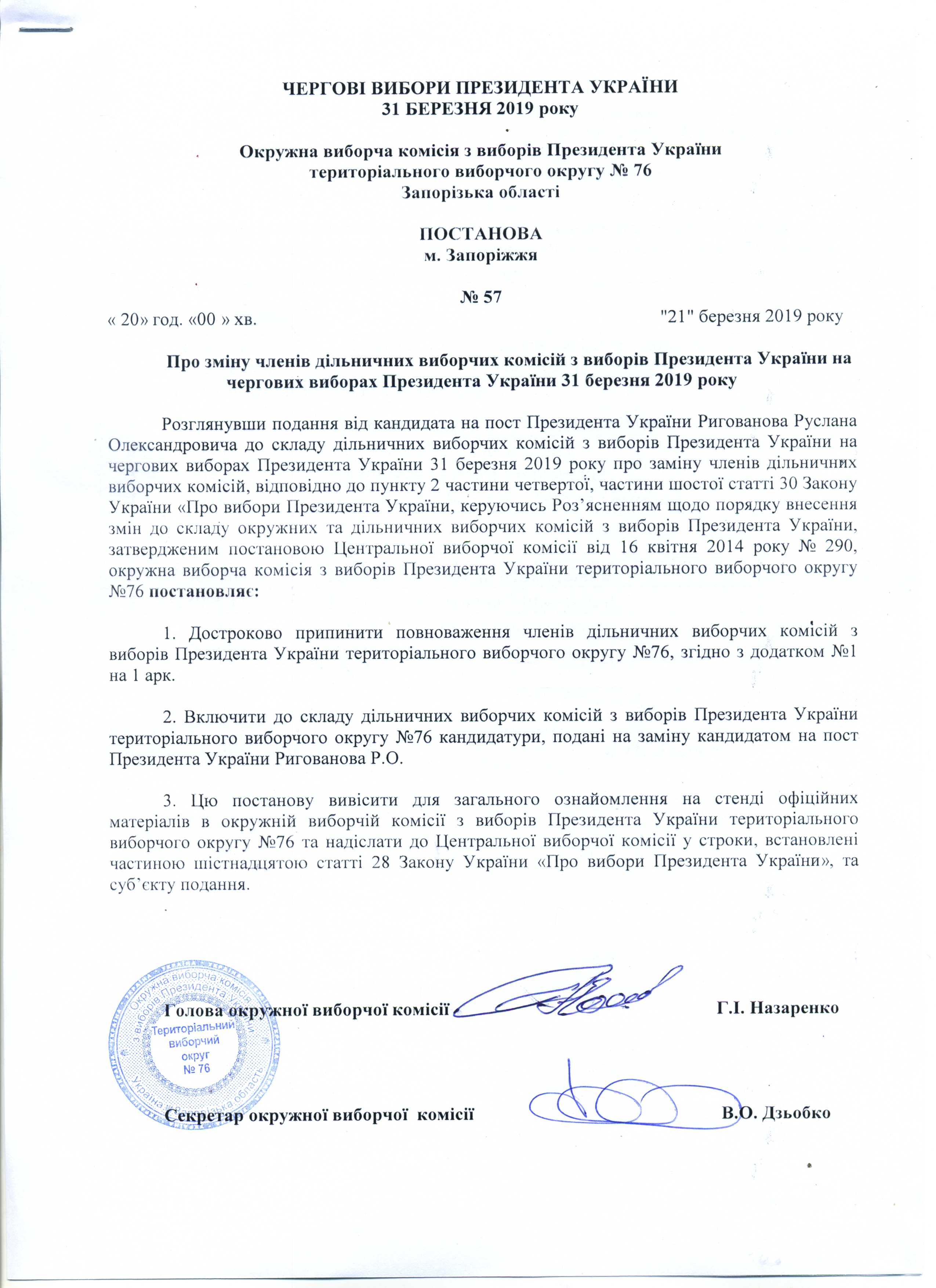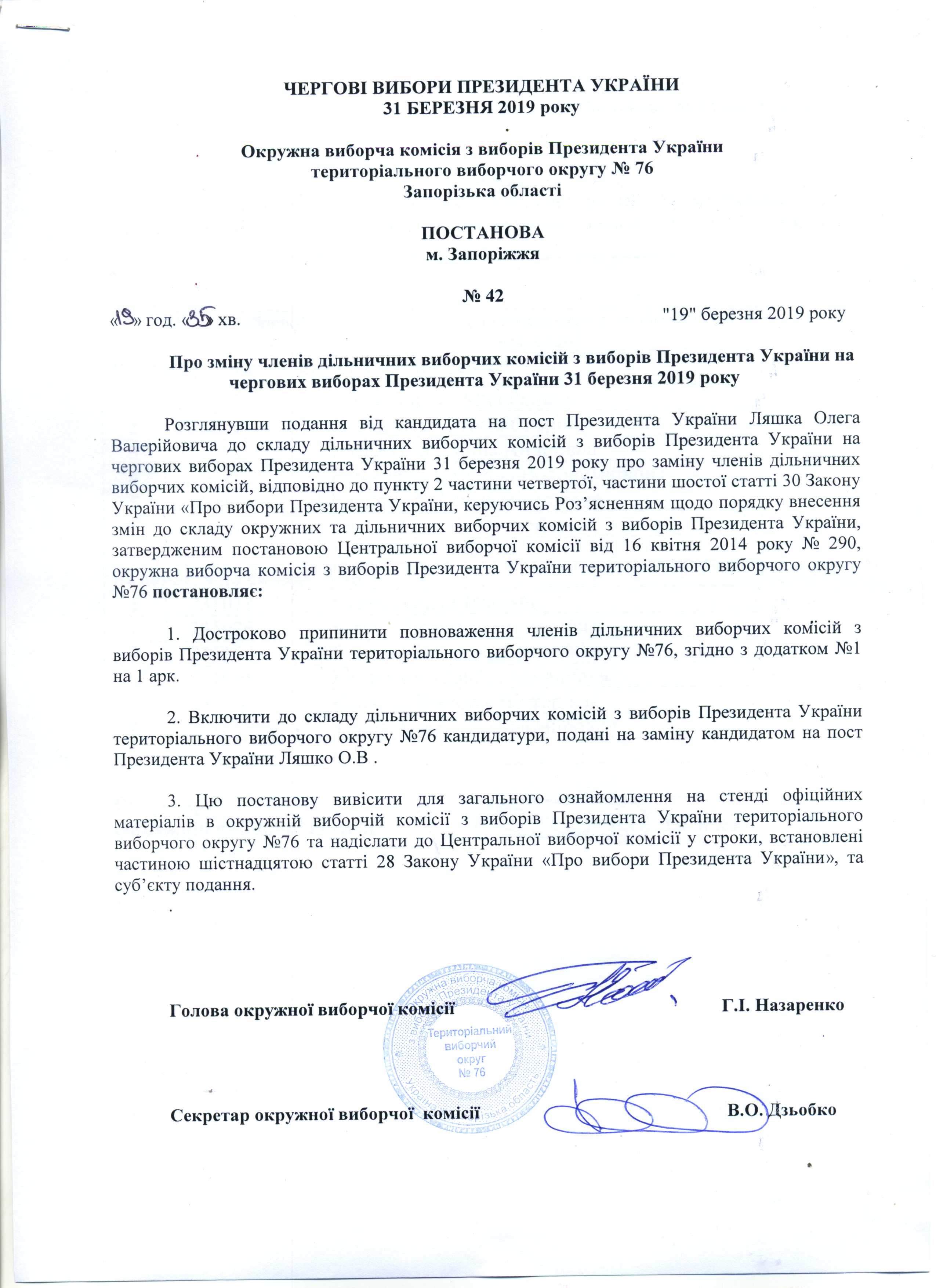 Про реєстрацію офіційних спостерігачів від кандидата на пост Президента УкраїниЛяшко Олега Валерійовича в територіальному виборчому округу №76 з чергових виборів Президента України 31 березня 2019 року |