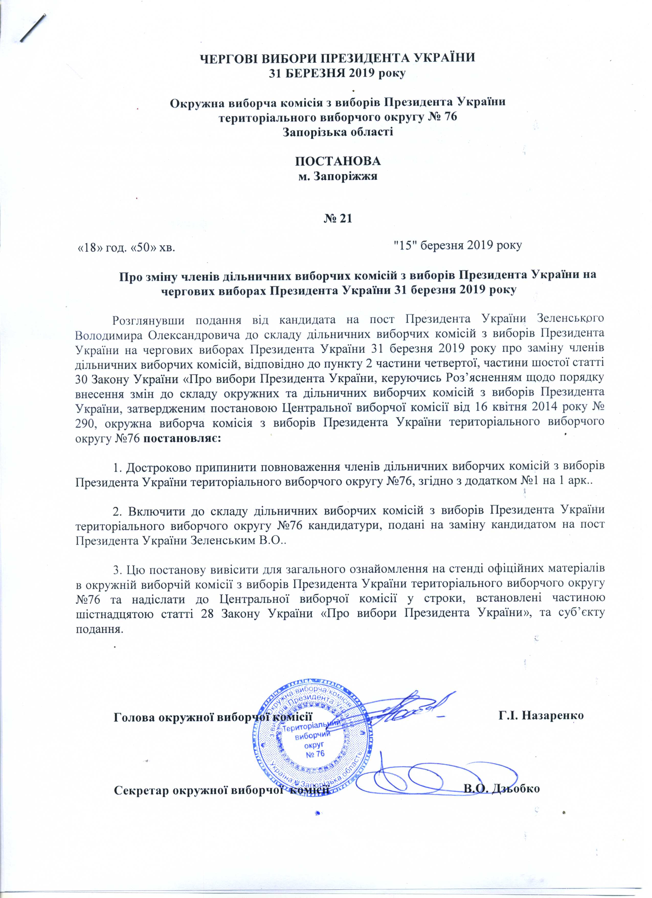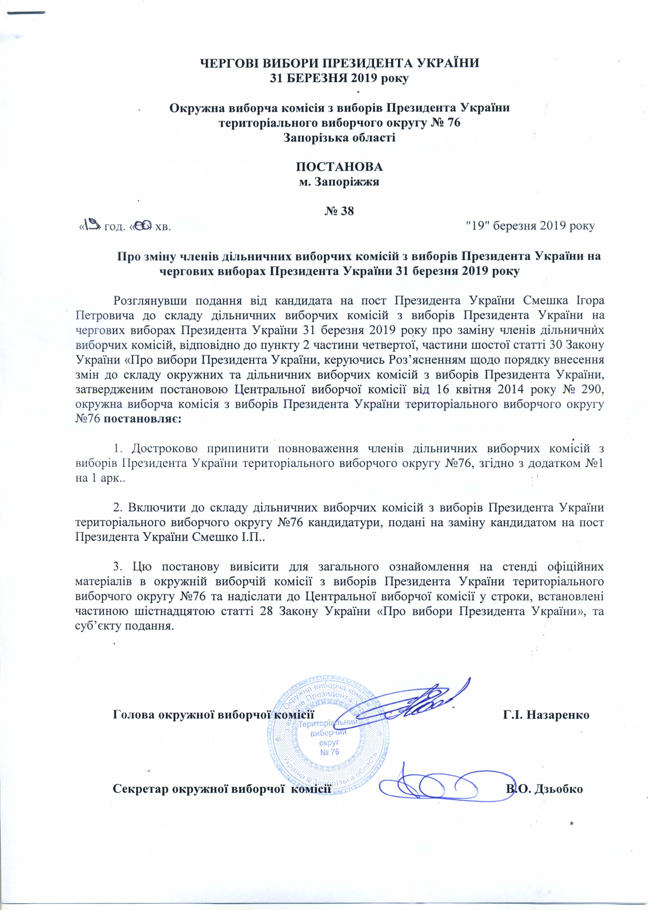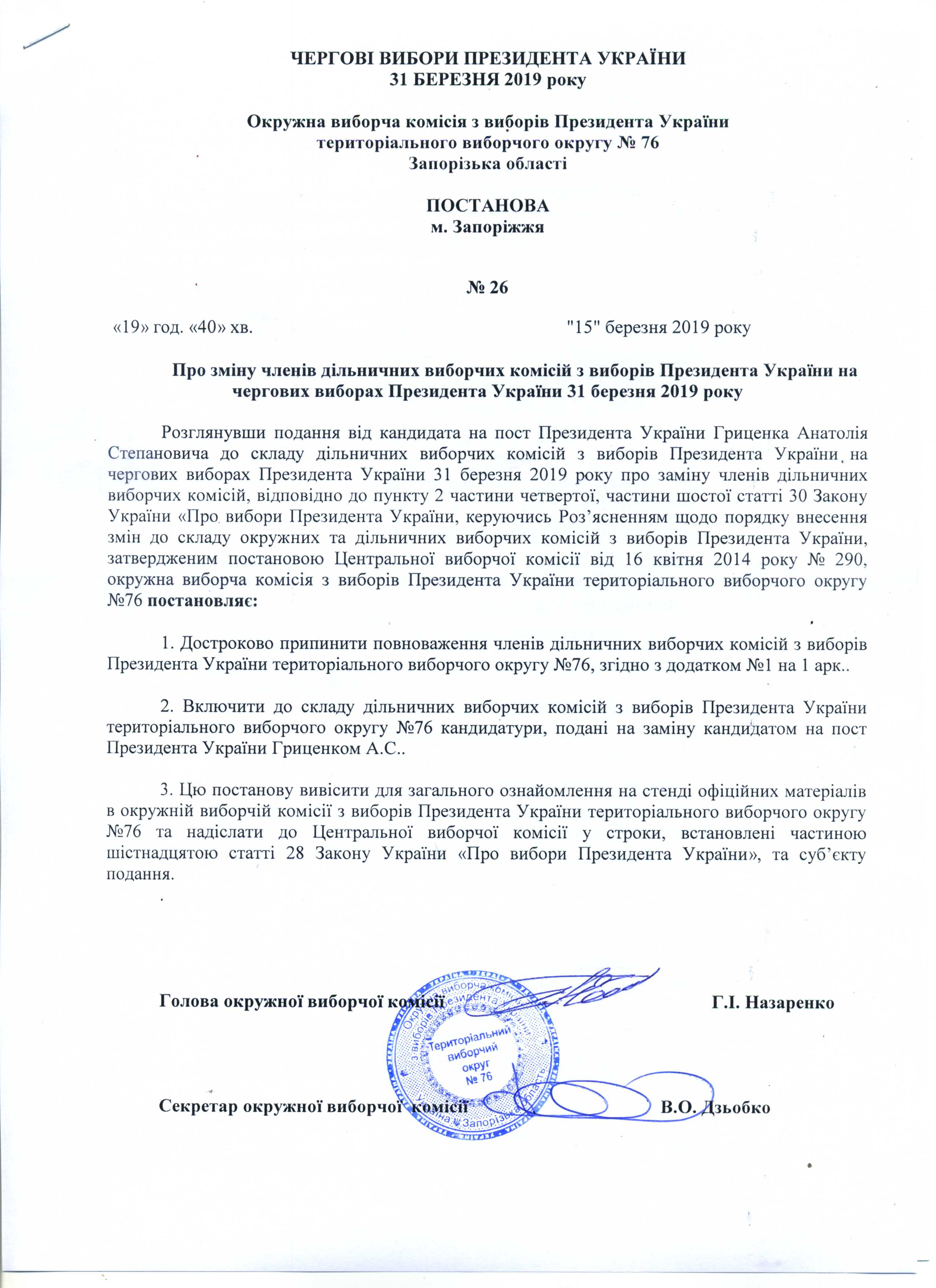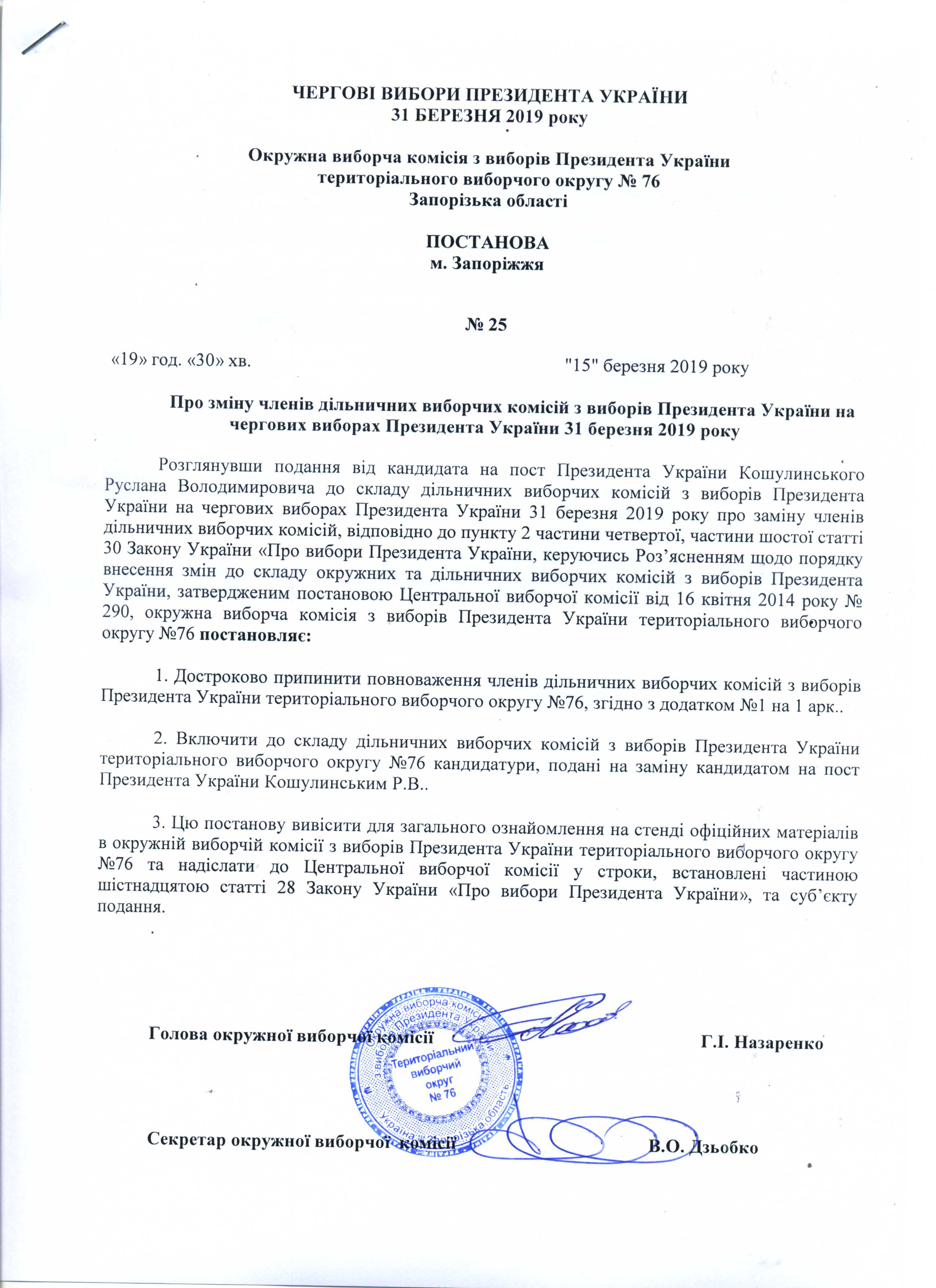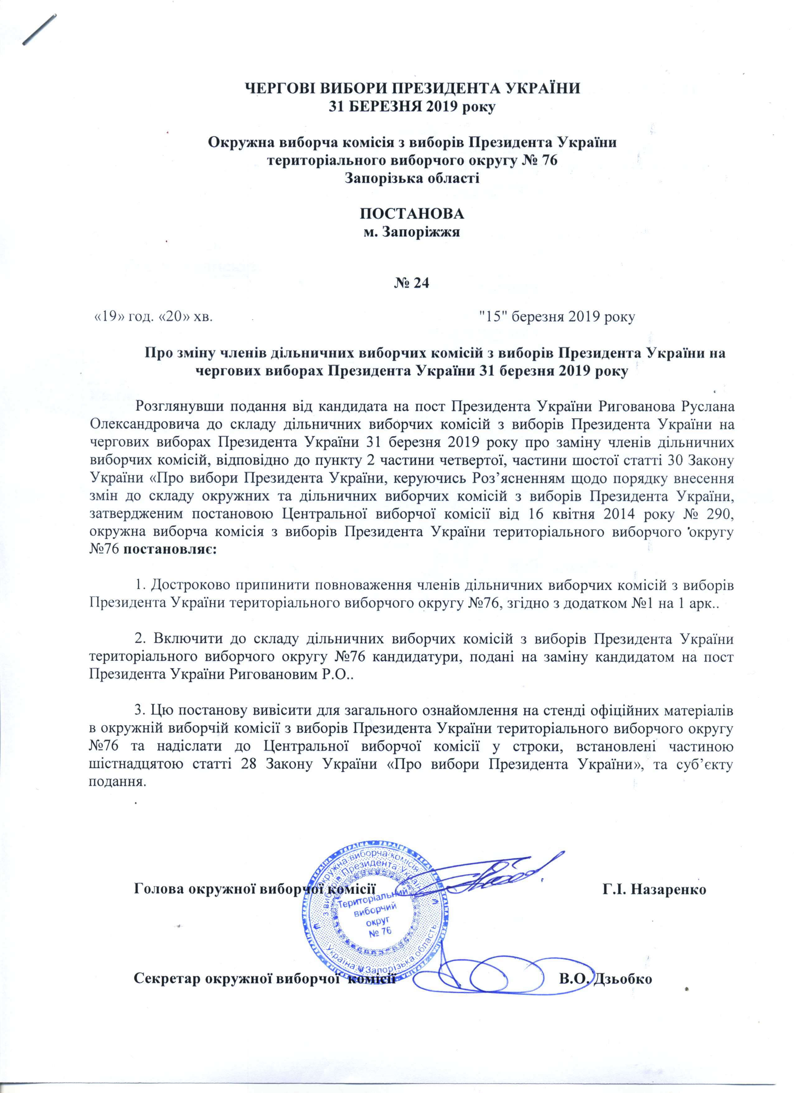 Про зміну членів дільничних виборчих комісій з виборів Президента Украіни на чергових виборах Президента України 31 березня 2019 року |