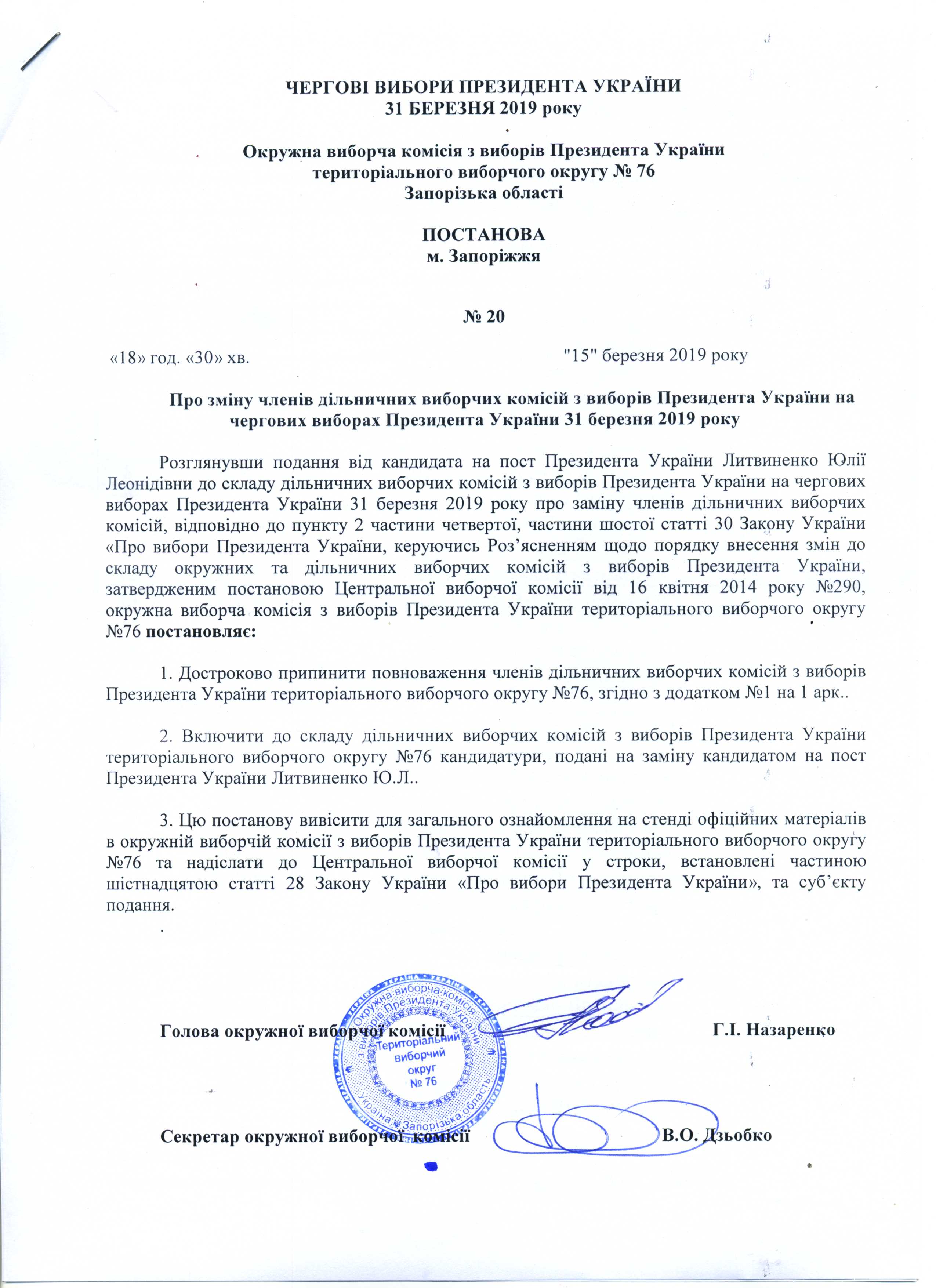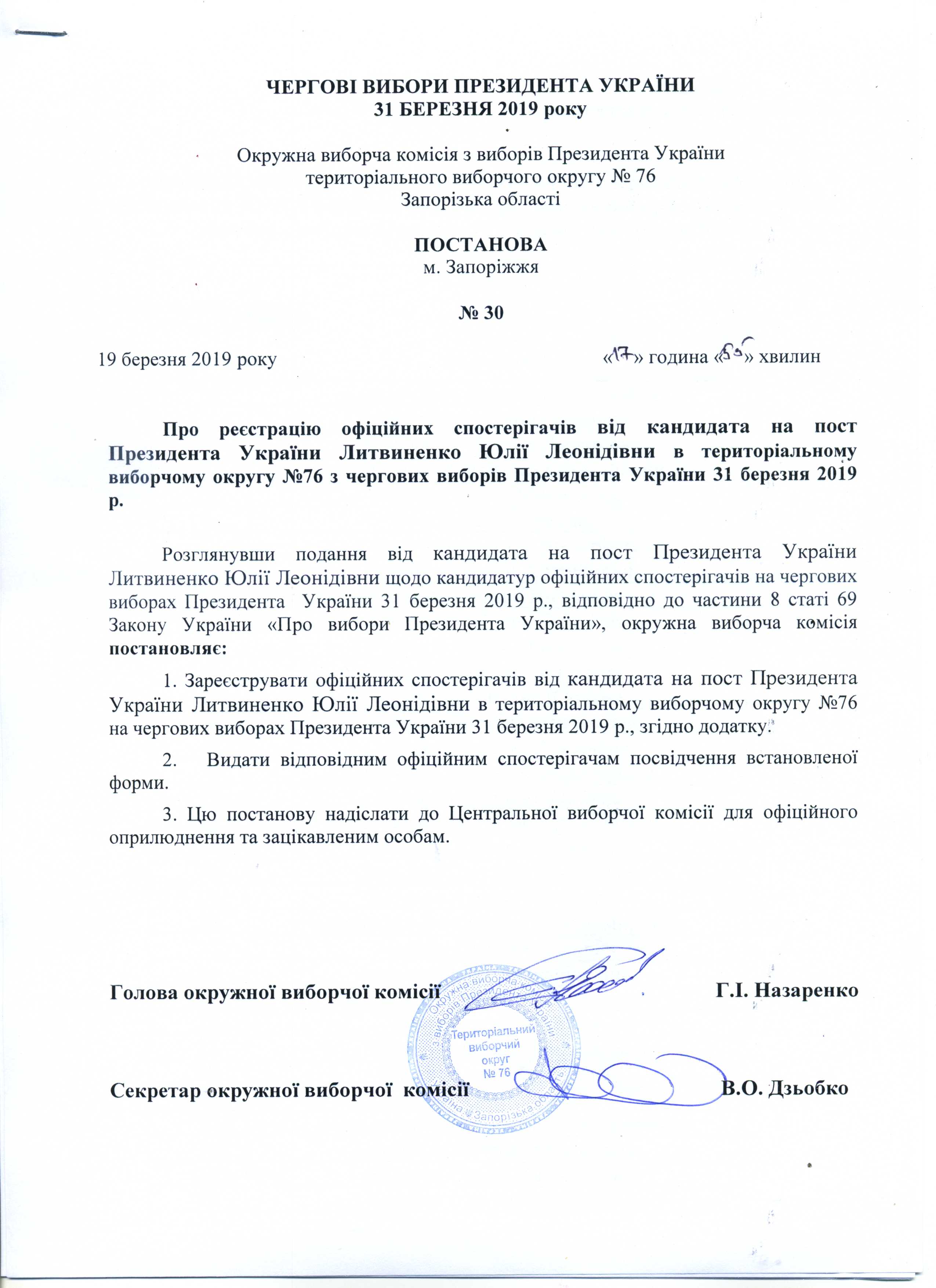 Про реєстрацію офіційних спостерігачів від кандидата на пост Президента України Литвиненко Юлії Леонідівни в територіальному виборчому округу №76 з чергових виборів Президента України 31 березня 2019 року |