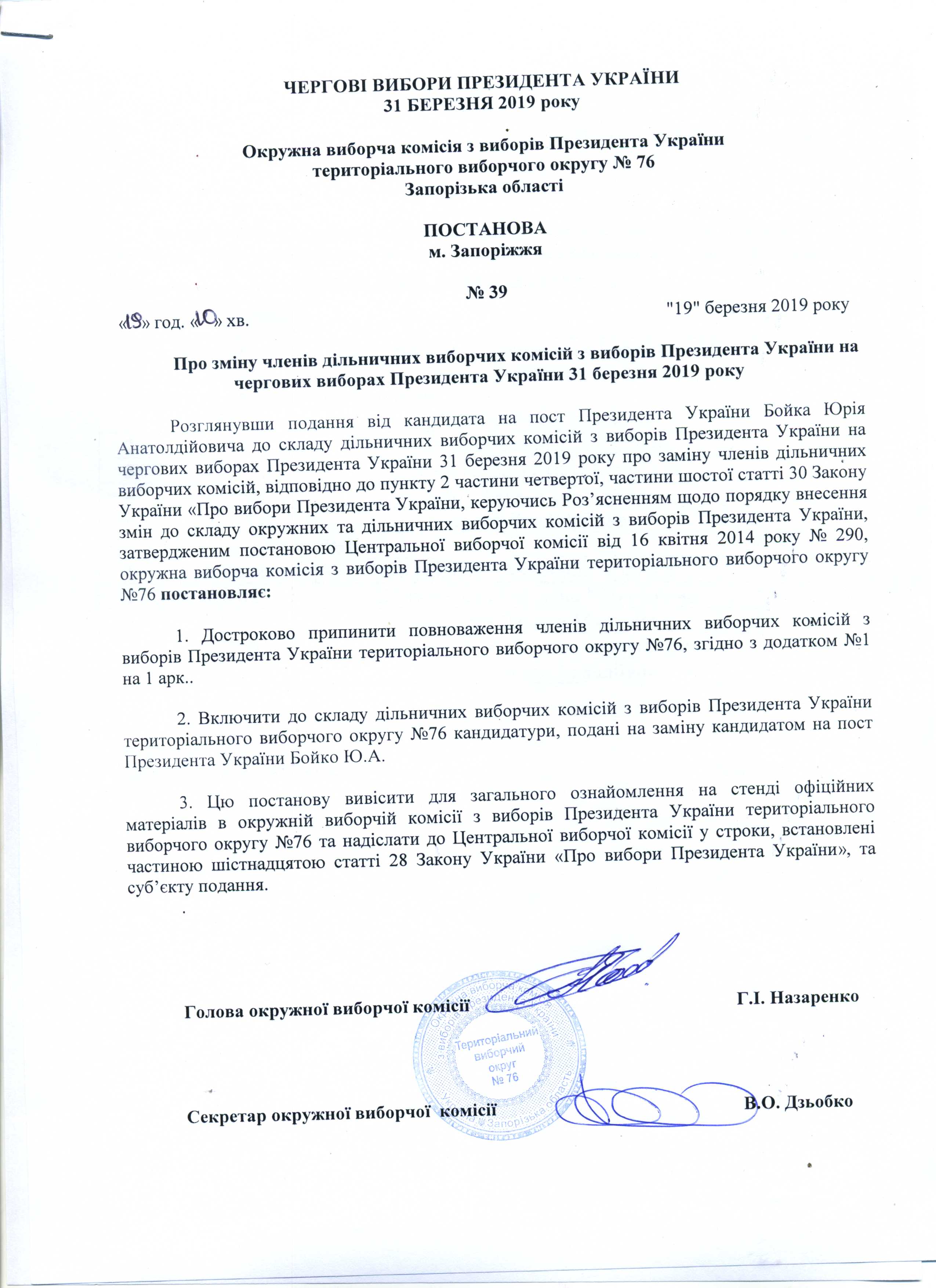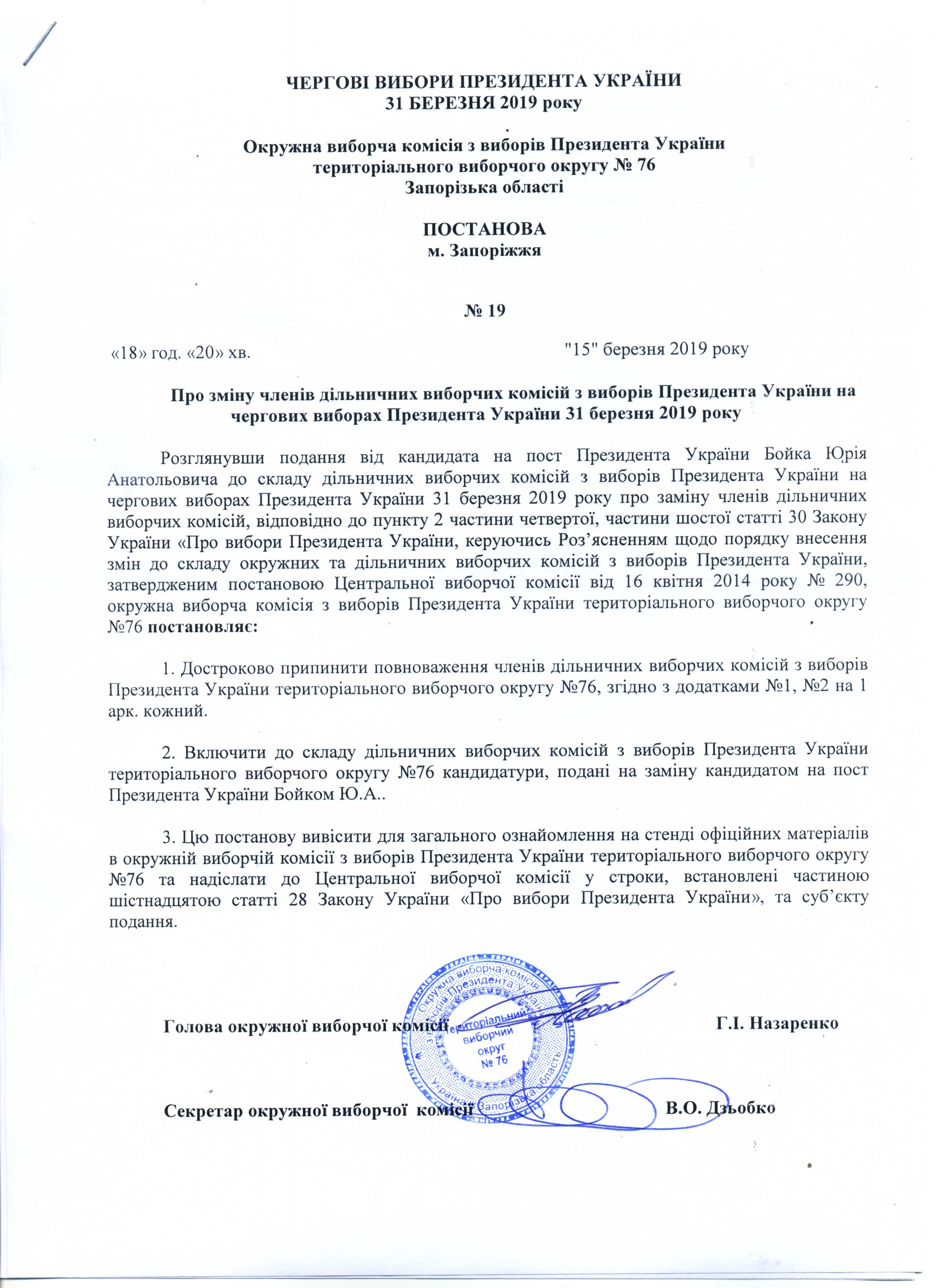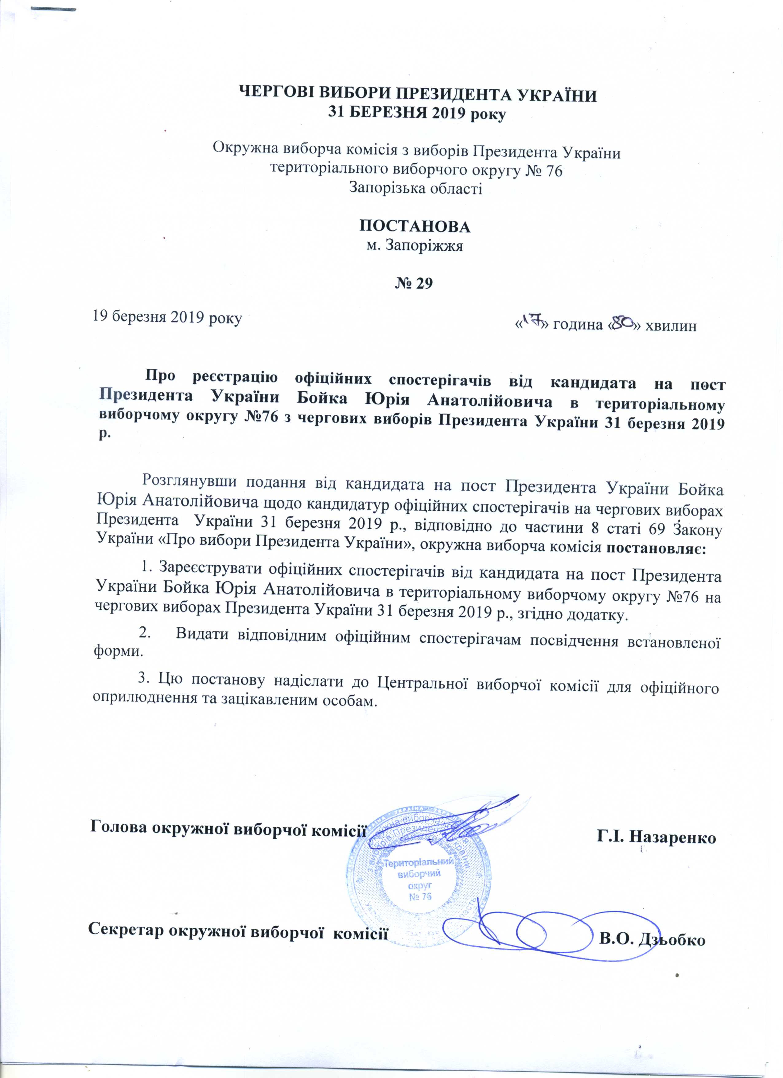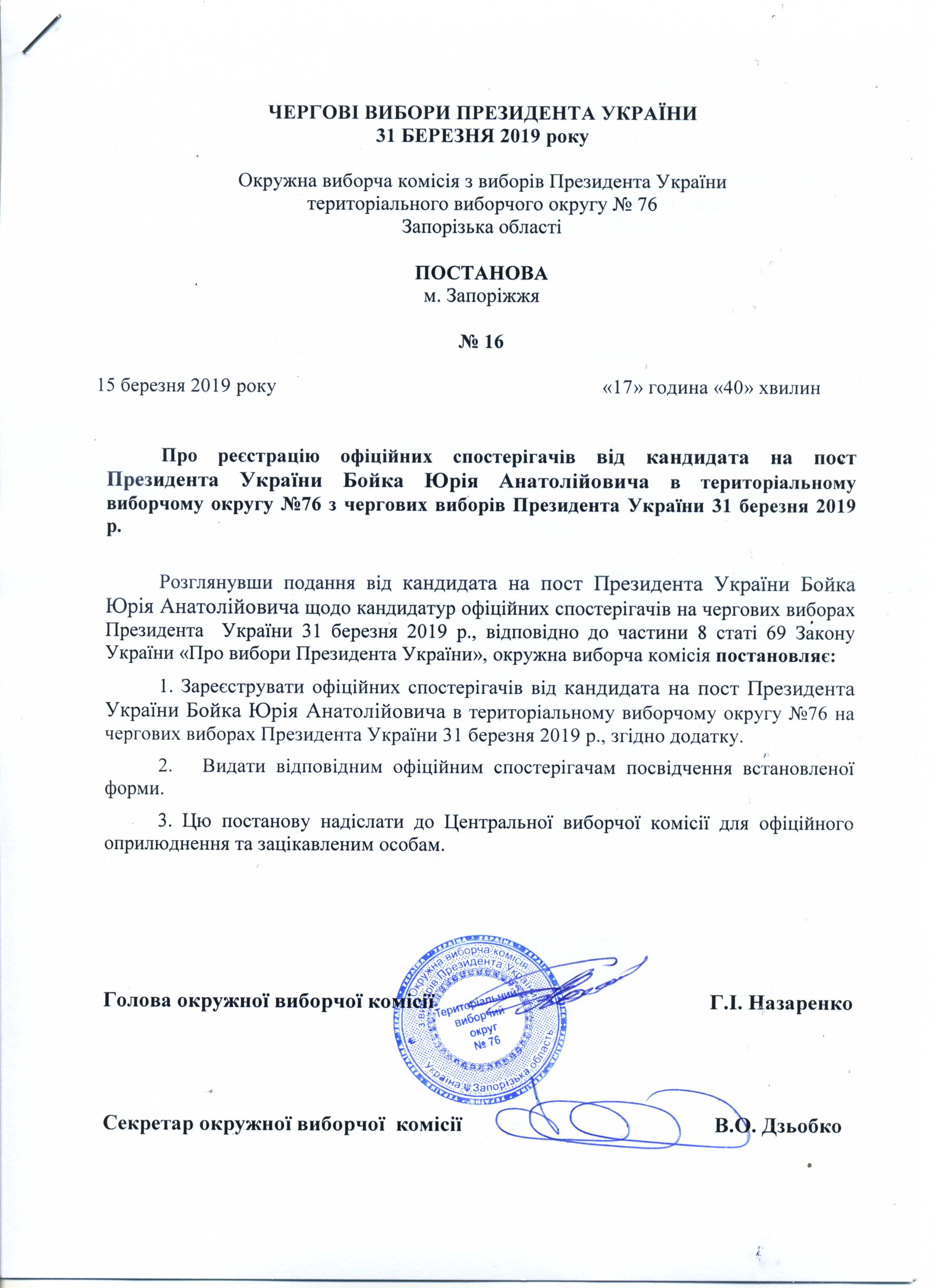 Про реєстрацію офіційних спостерігачів від кандидата на пост Президента України Бойка Юрія Анатолійовича в територіальному виборчому округу №76 з чергових виборів Президента України 31 березня 2019 року |