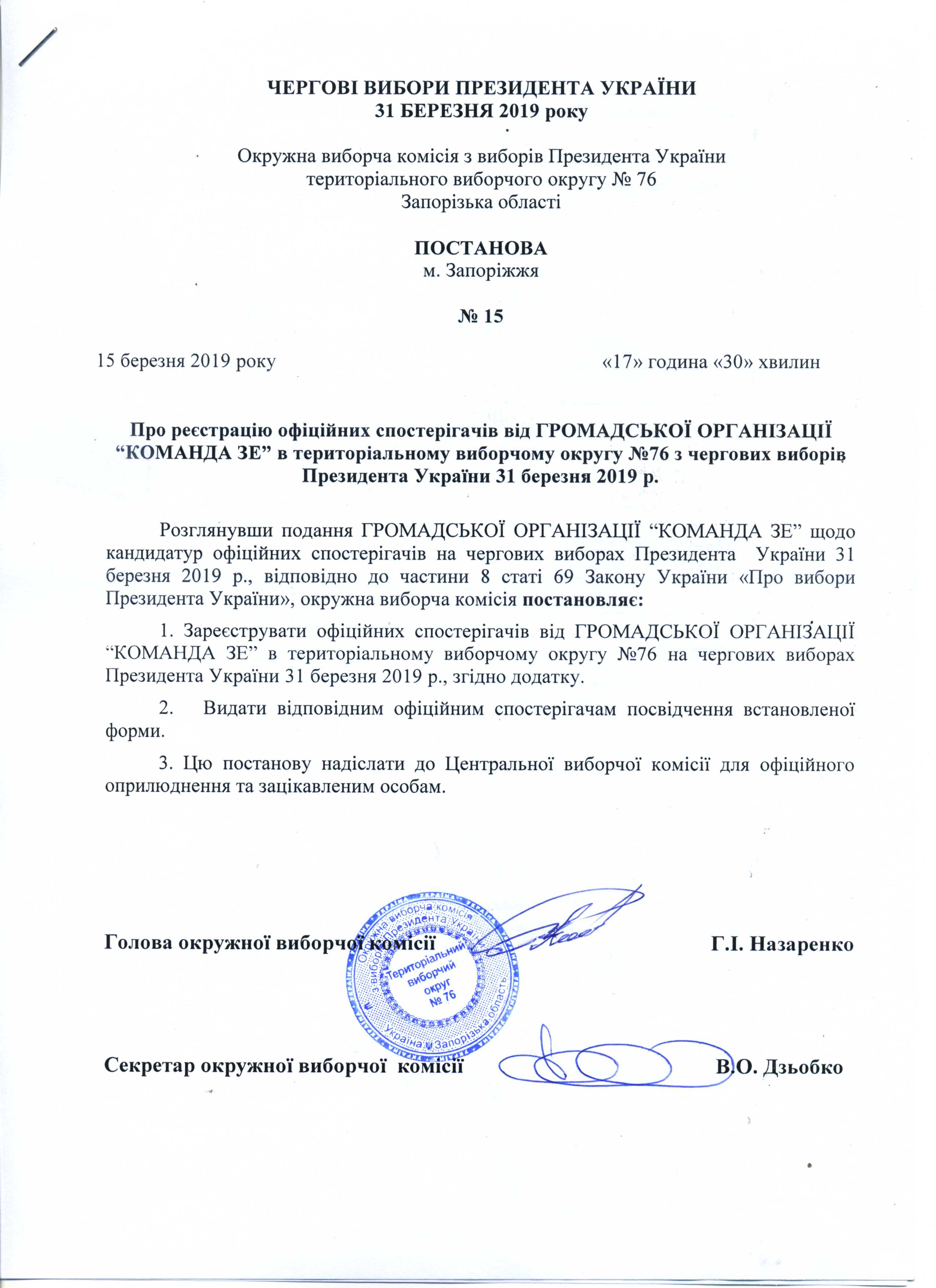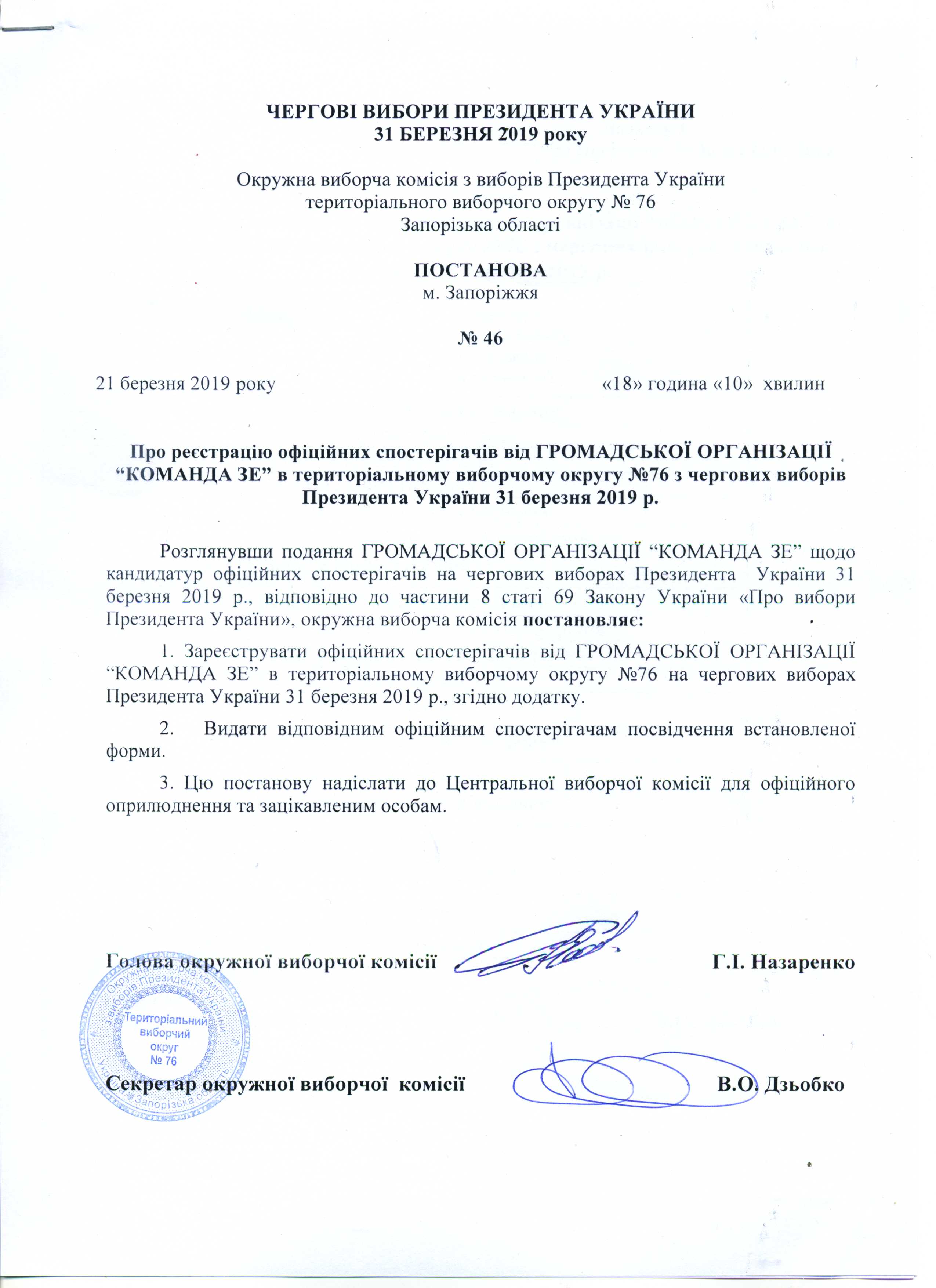 Про реєстрацію офіційних спостерігачів від ГРОМАДСЬКОЇ ОРГАНІЗАЦІЇ "КОМАНДА ЗЕ" в територіальному виборчому округу №76 з чергових виборів Президента України 31 березня 2019 року |