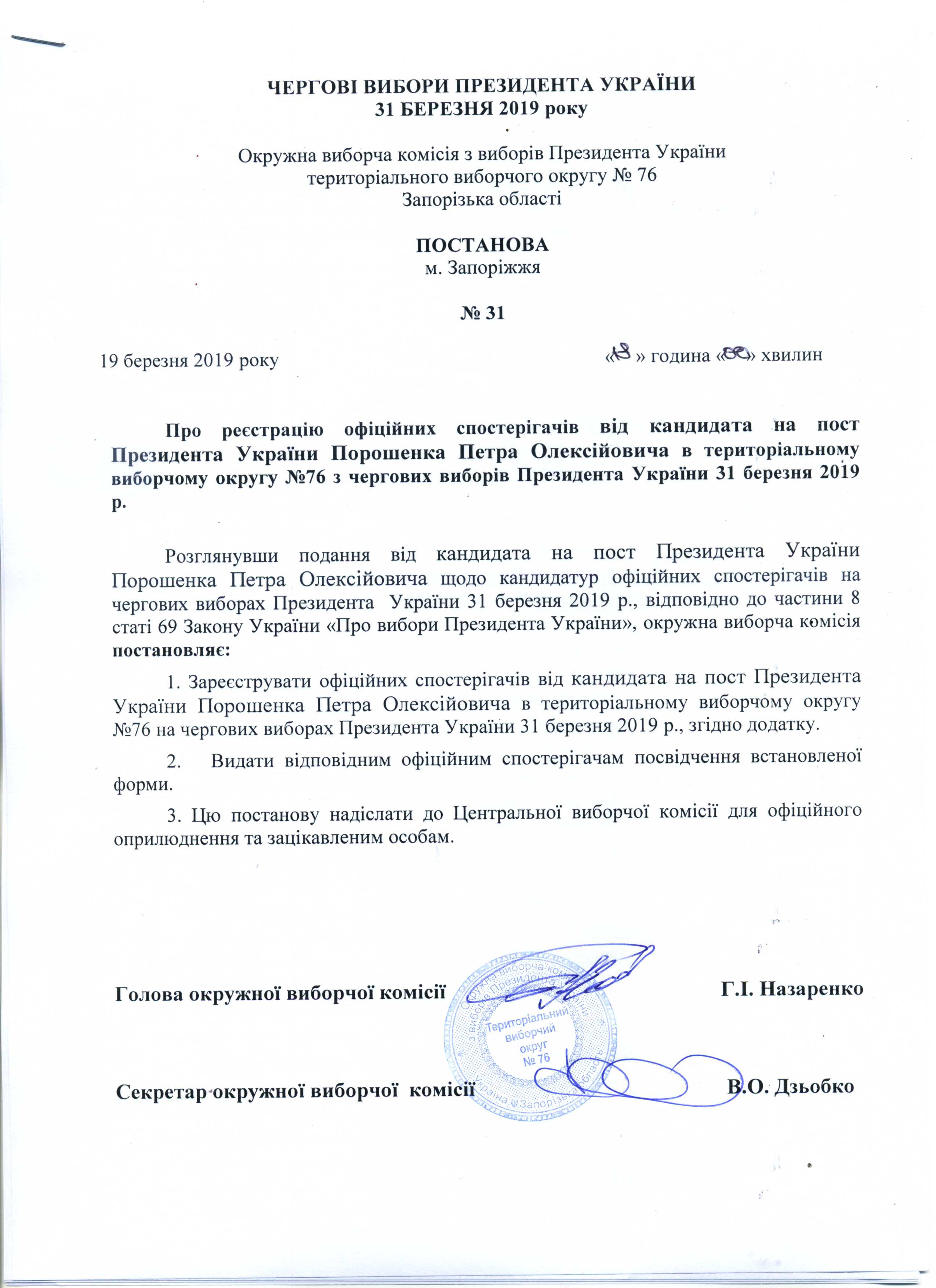 Про реєстрацію офіційних спостерігачів від кандидата на пост Президента України Порошенка Петра Олексійовича в територіальному виборчому округу №76 з чергових виборів Президента України 31 березня 2019 року |