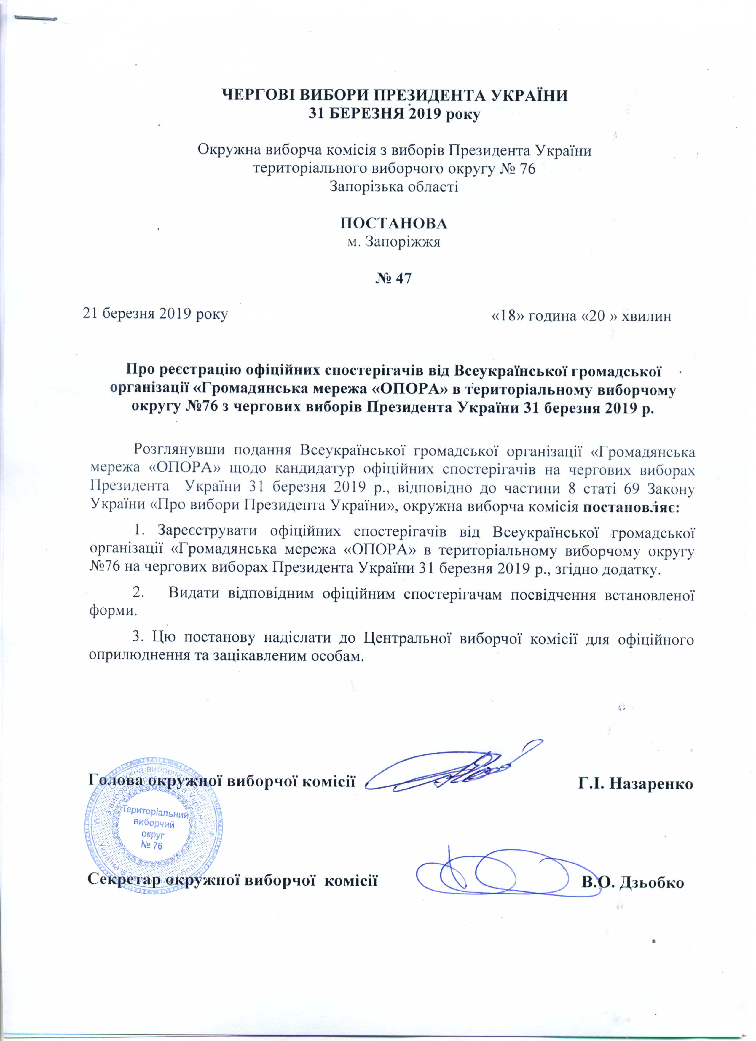 Про реєстрацію офіційних спостерігачів від Всеукраїнської громадської організації "Громадянська мережа "ОПОРА" в територіальному виборчому округу №76 з чергових виборів Президента України 31 березня 2019 року |