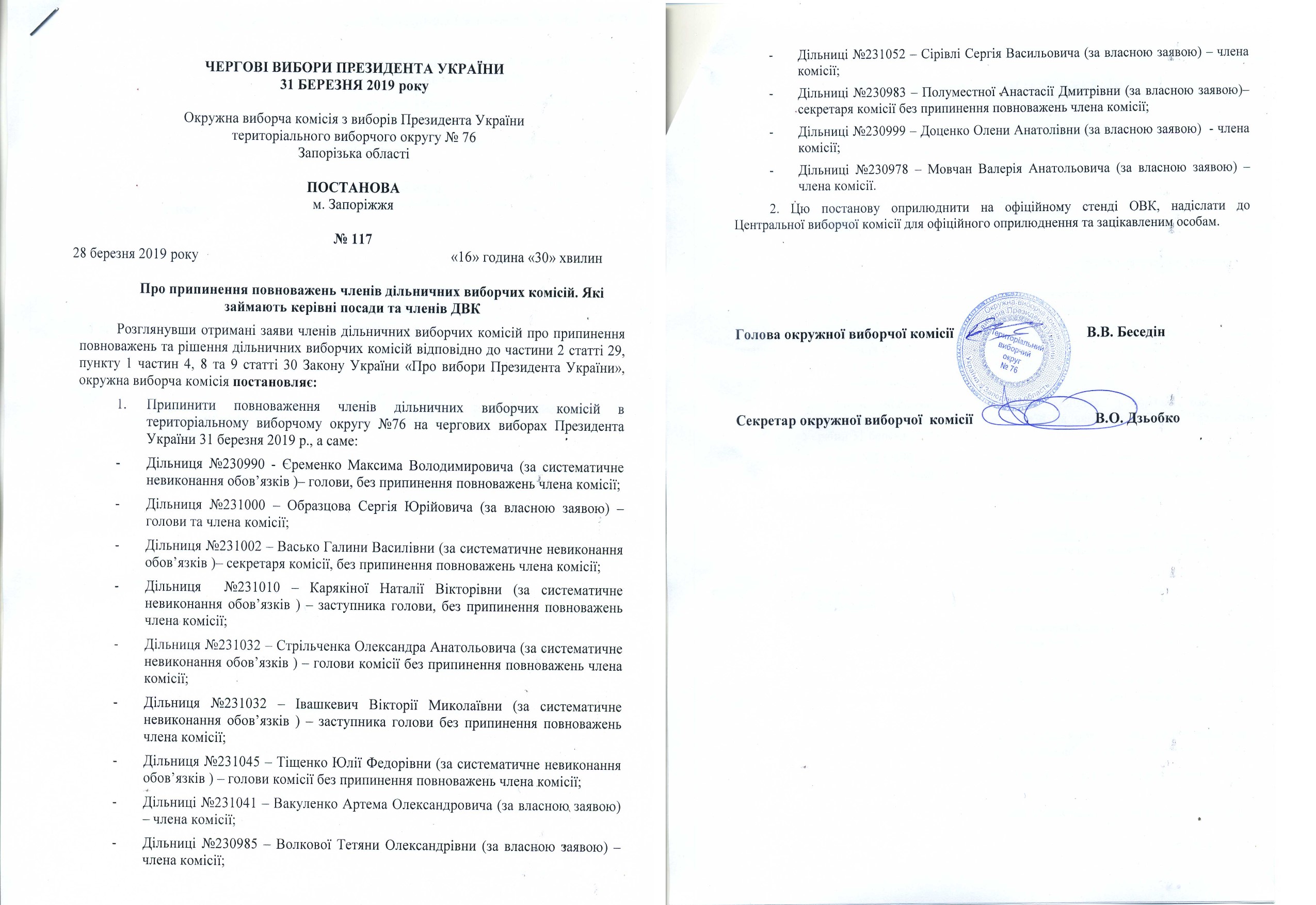 Про припинення повноважень членів дільничних виборчих комісій. Які займають керівні посади та членів ДВК |