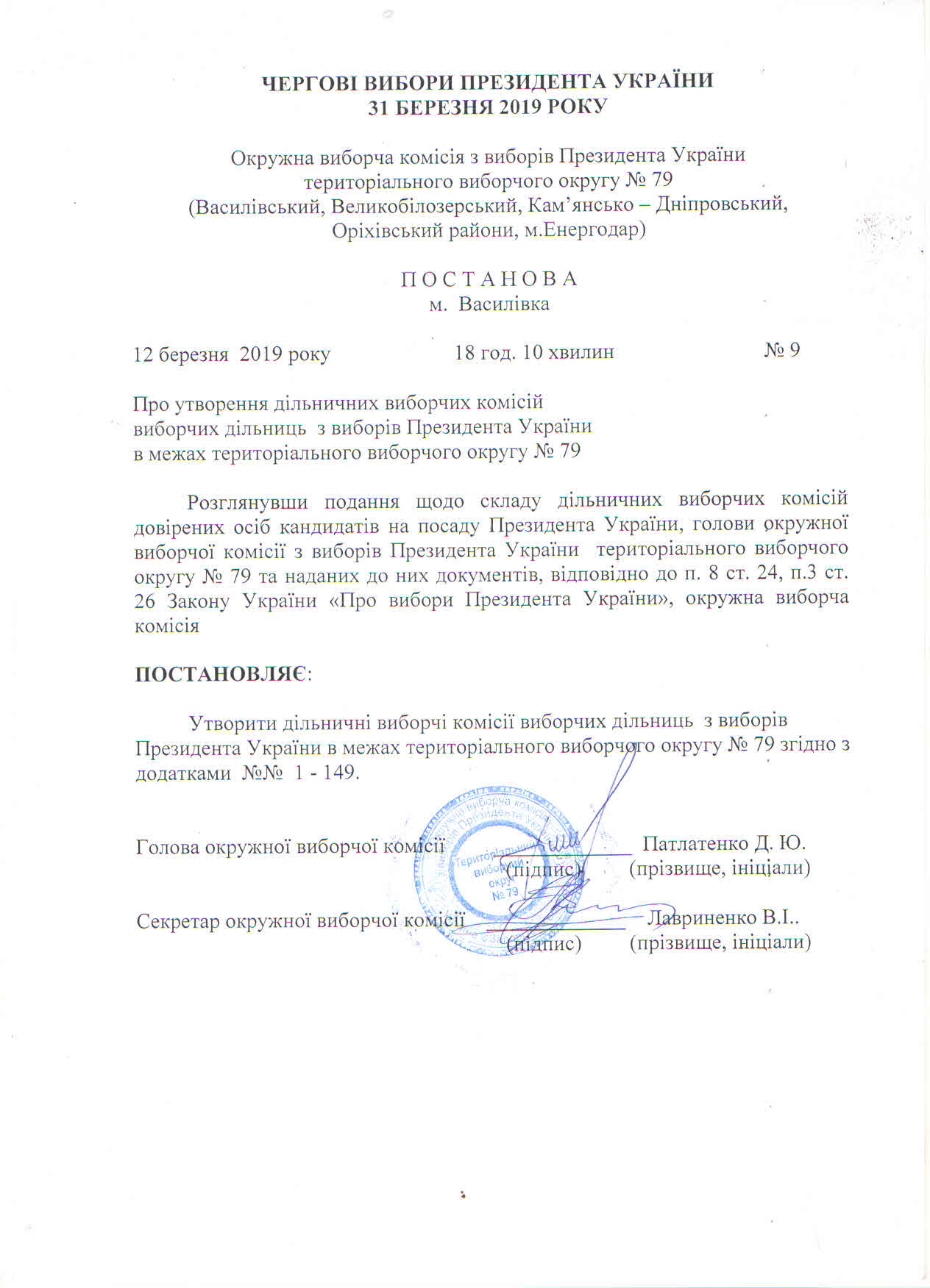 Про утворення дільничних виборчих комісій виборчих дільниць з виборів Президента України в межах територіального округу №79 |