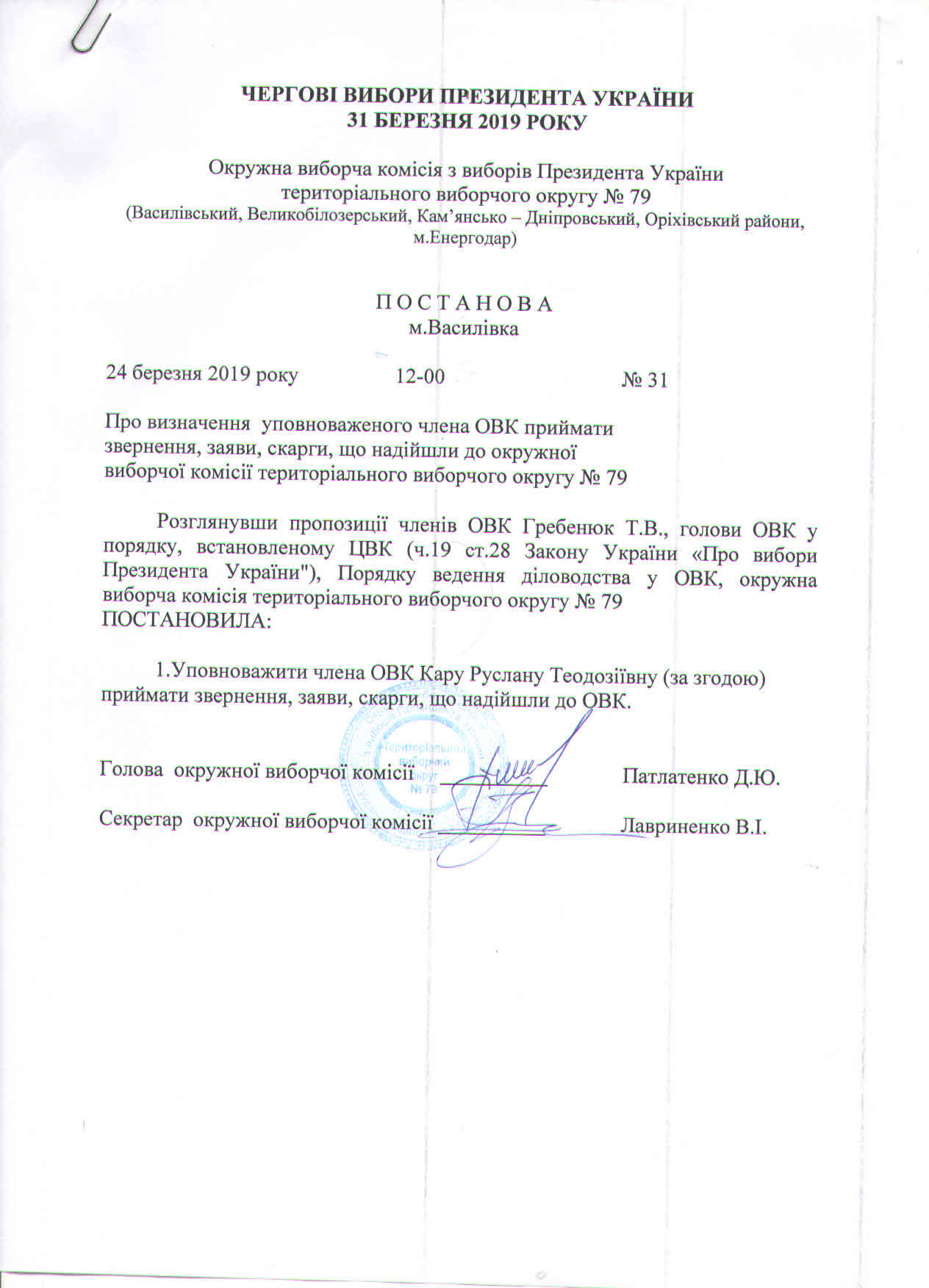 Про визначення уповноваженого члена ОВК приймати звернення, заяви, скарги, що надійшли до окружної виборчої комісії територіального виборчого округу №79 |