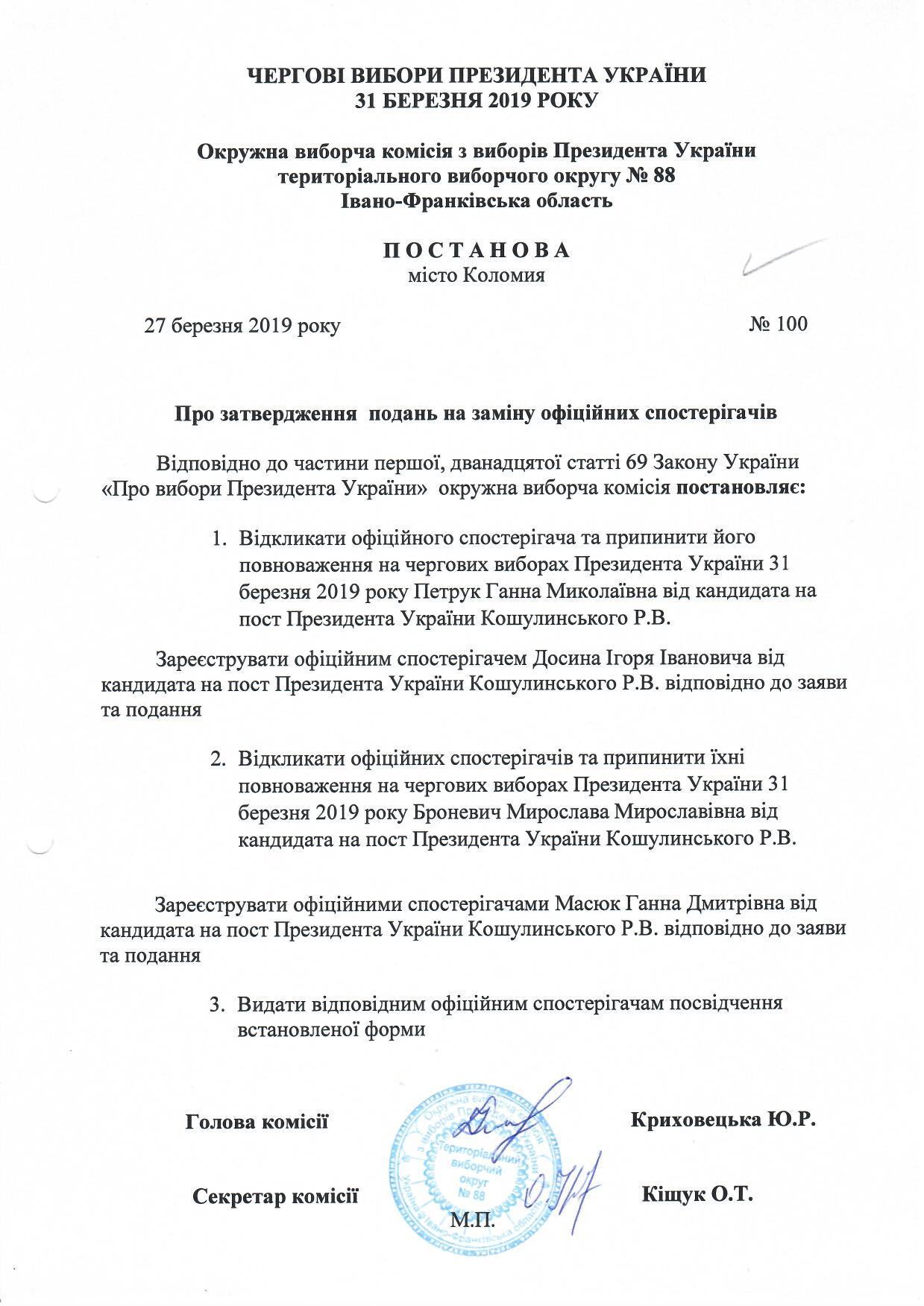 Про реєстрацію офіційних спостерігачів від кандидата на пост Президента України Кошулинського Р.В. під час чергових виборів Президента України 31 березня 2019 року |