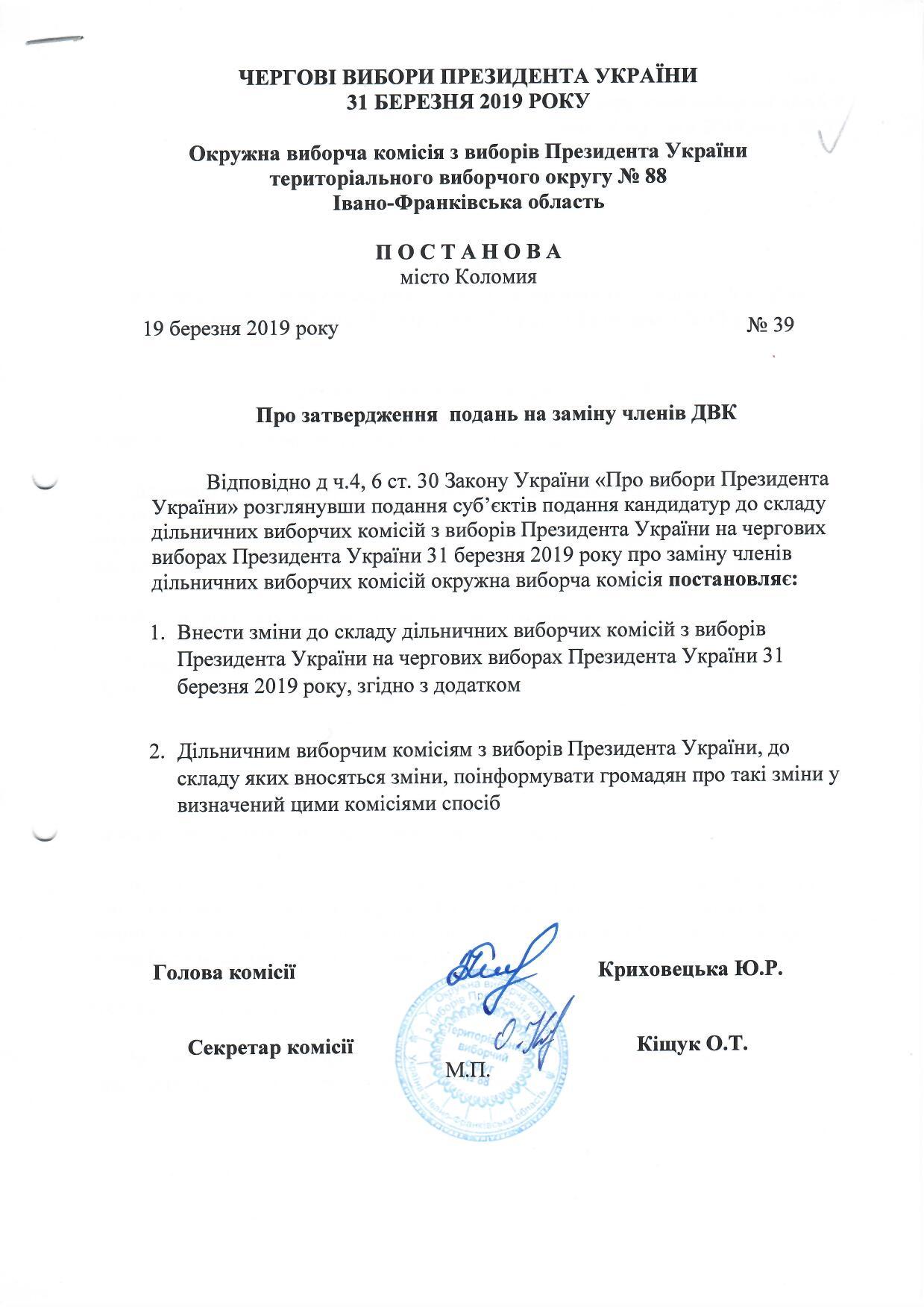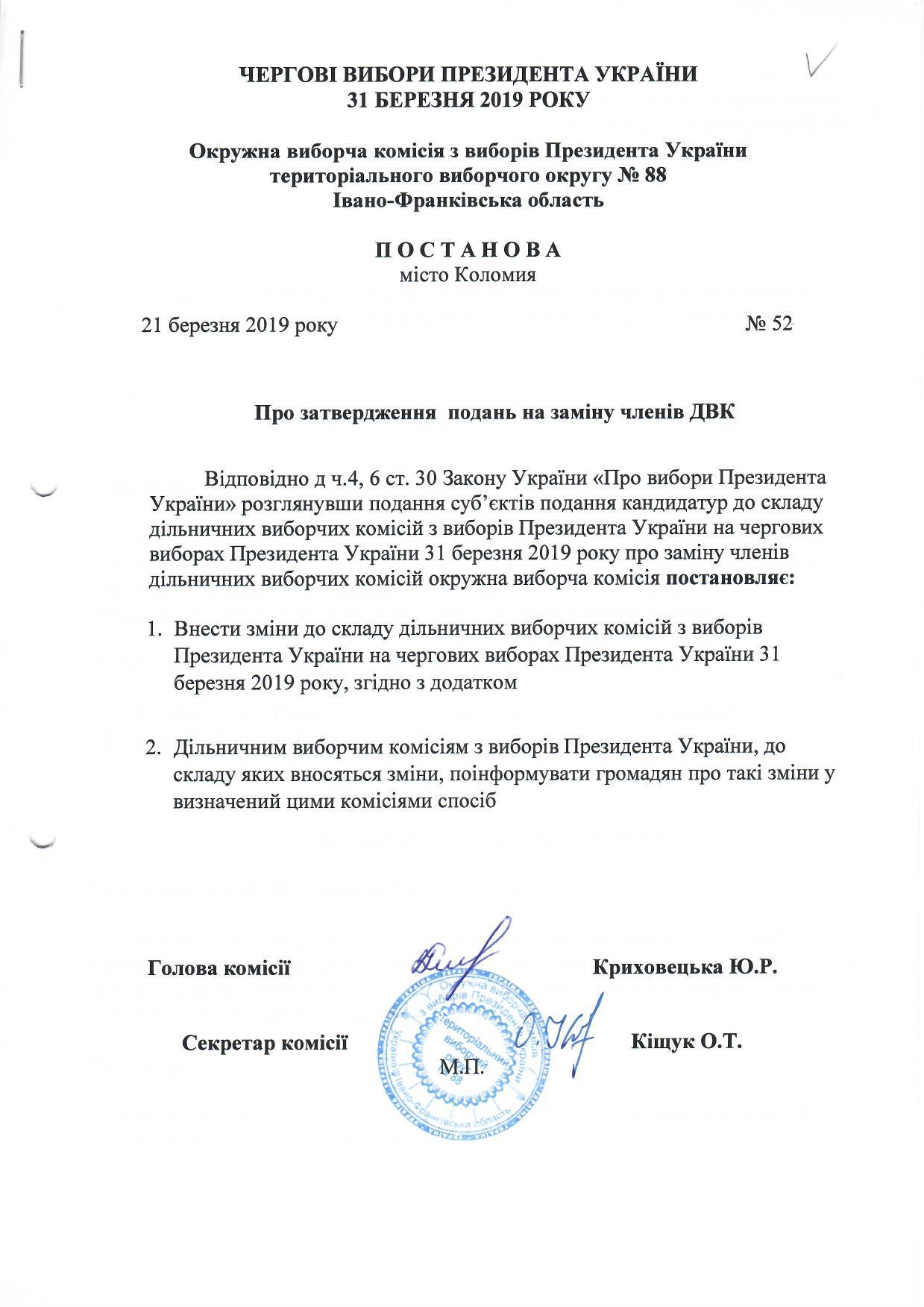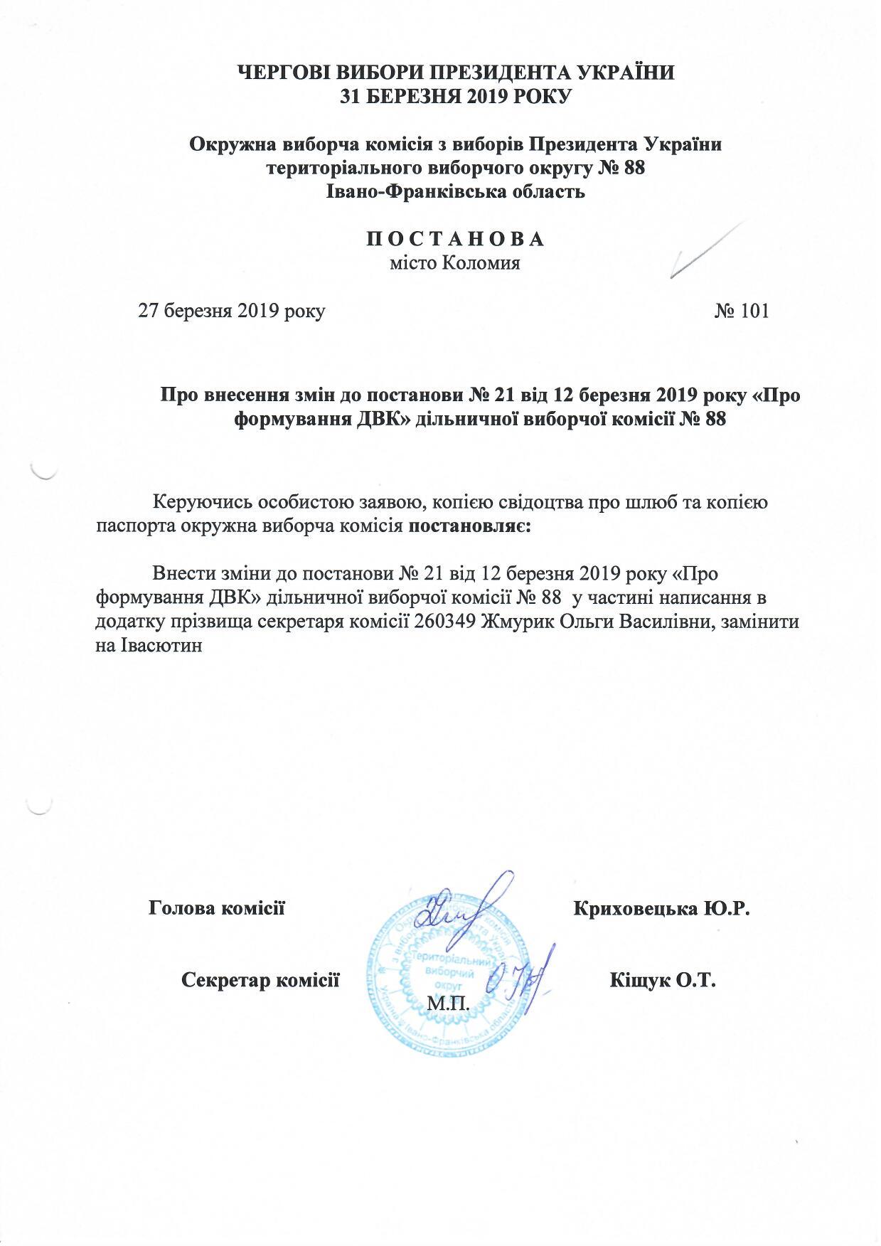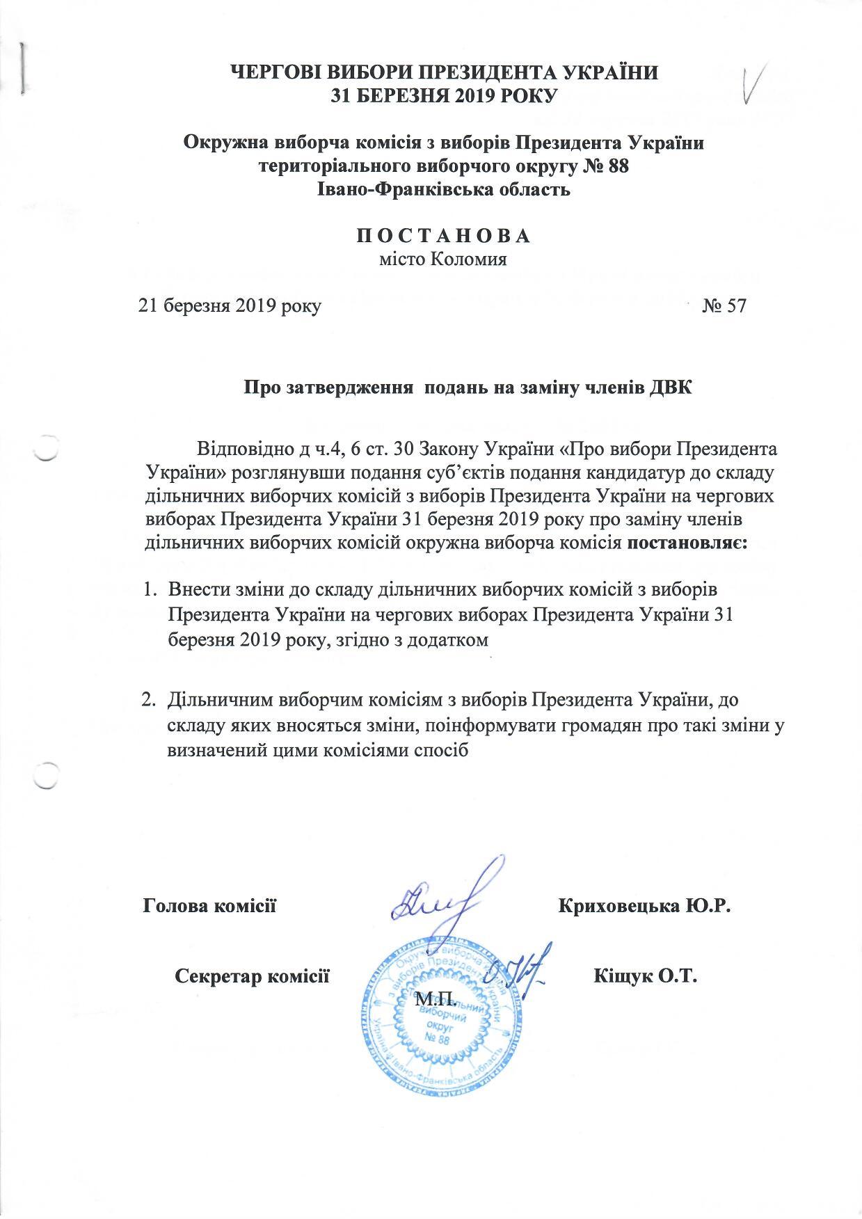 Про внесення змін до постанови № 21 від 12 березня 2019 року «Про формування ДВК» дільничної виборчої комісії № 88 |