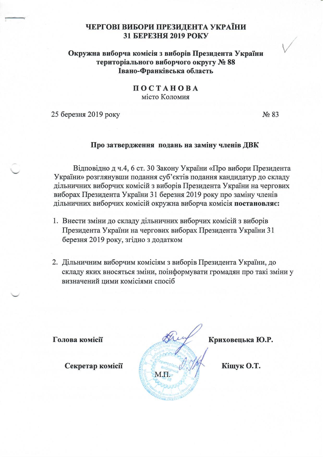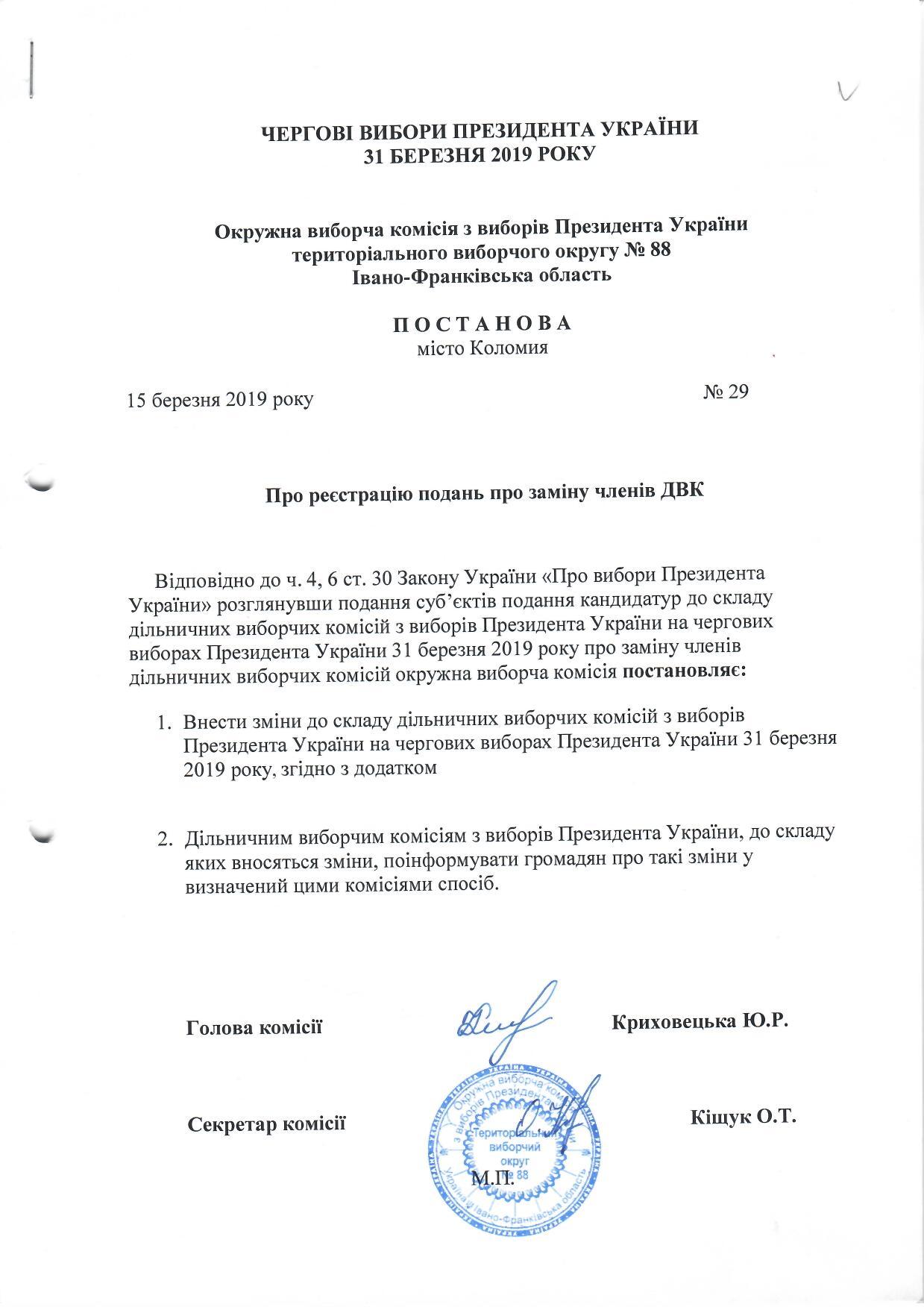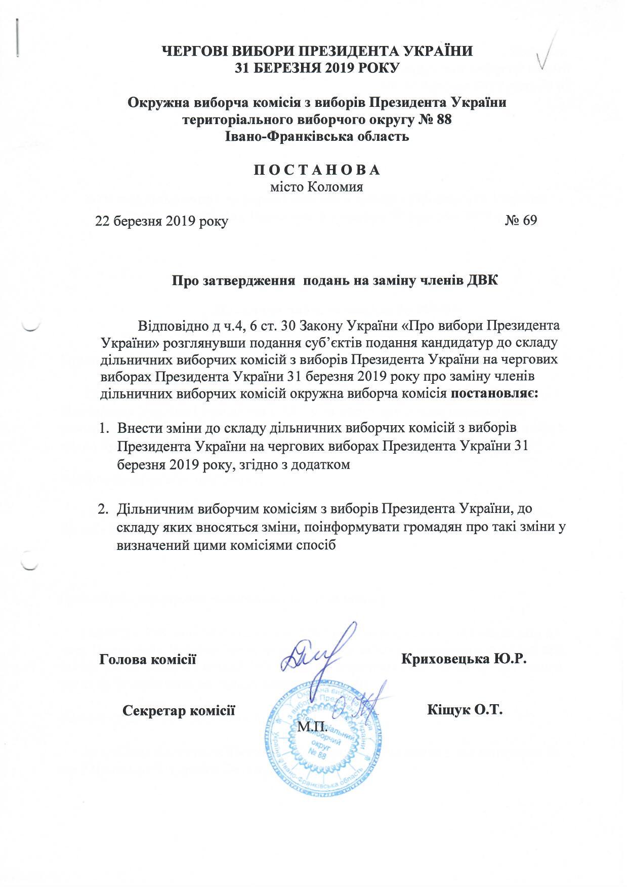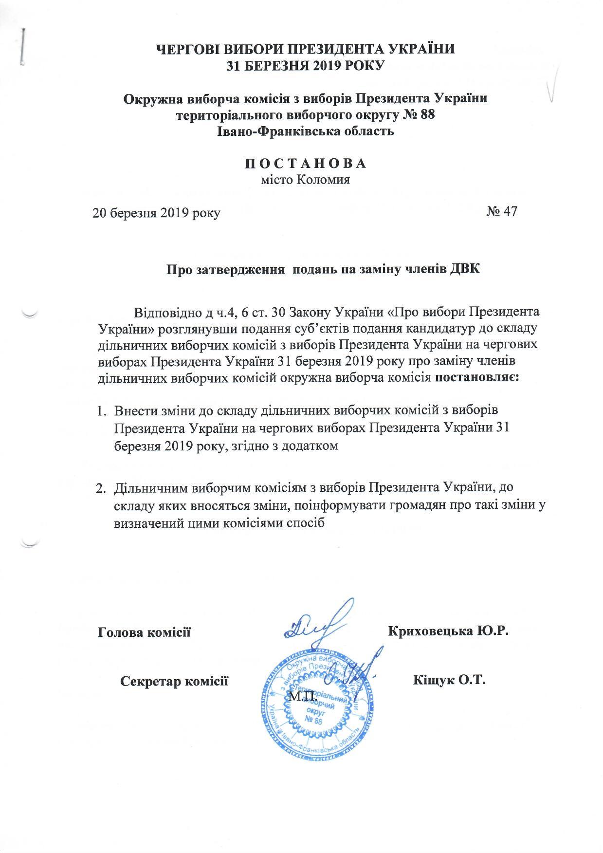 Про внесення змін до постанови № 21 від 12 березня 2019 року «Про формування ДВК» дільничної виборчої комісії № 88 |