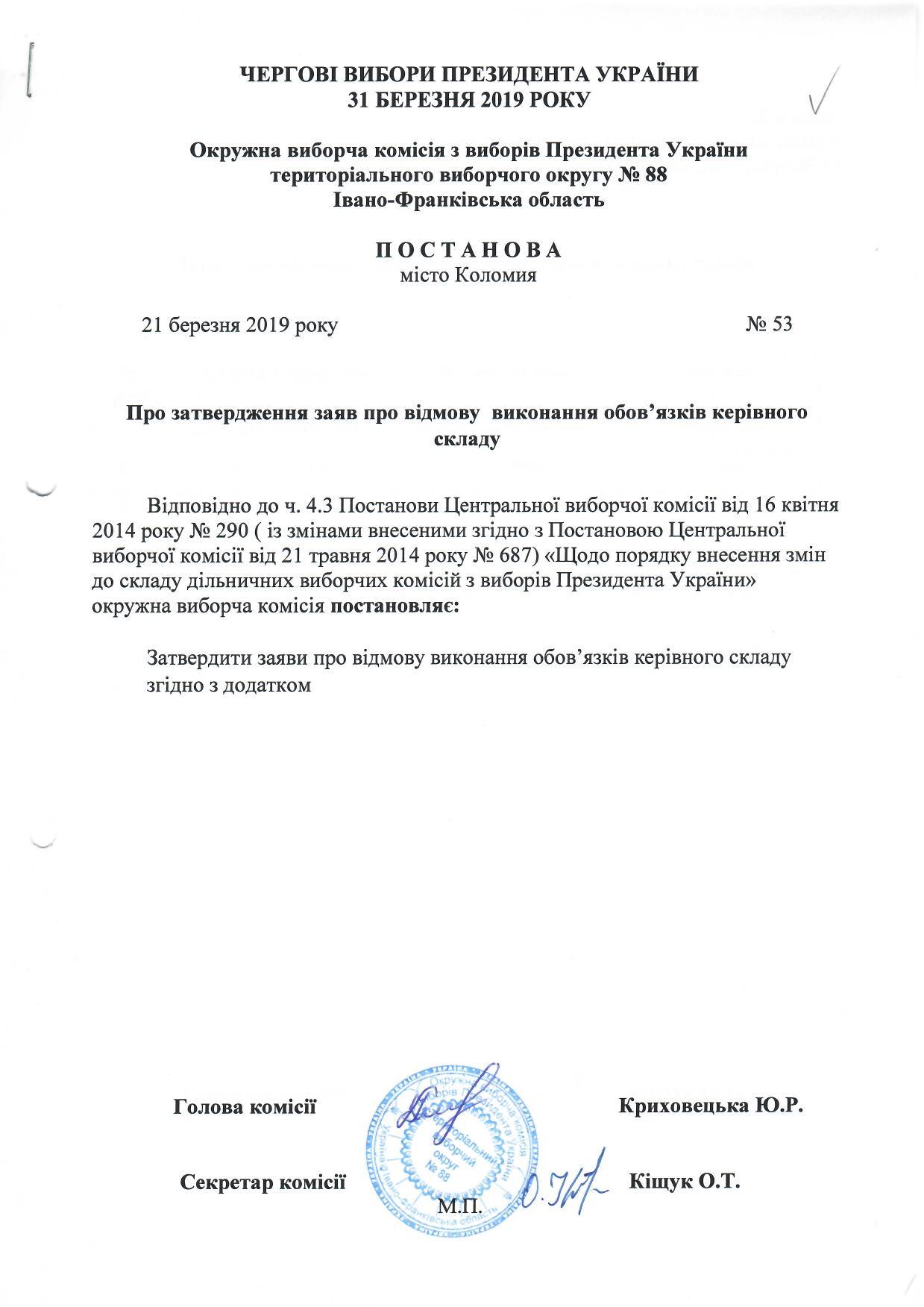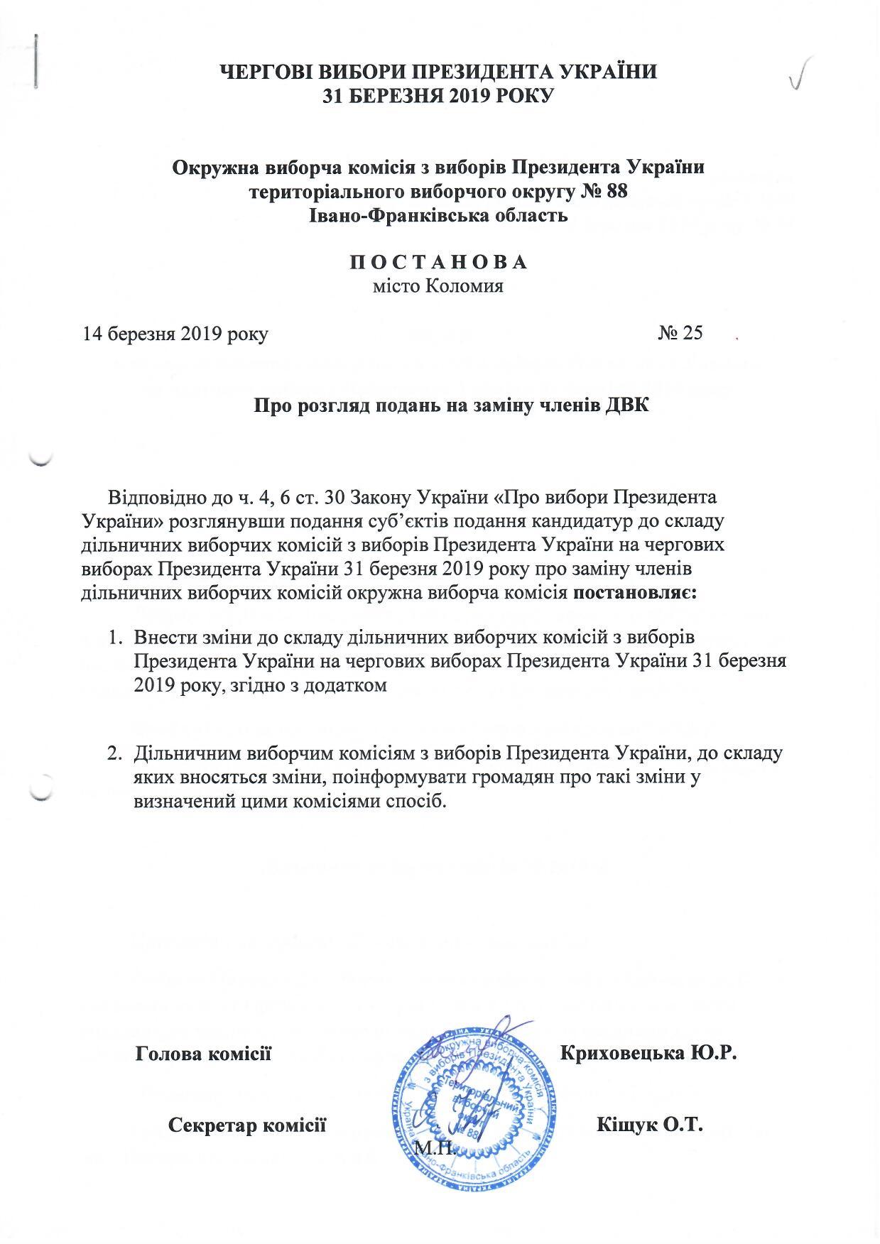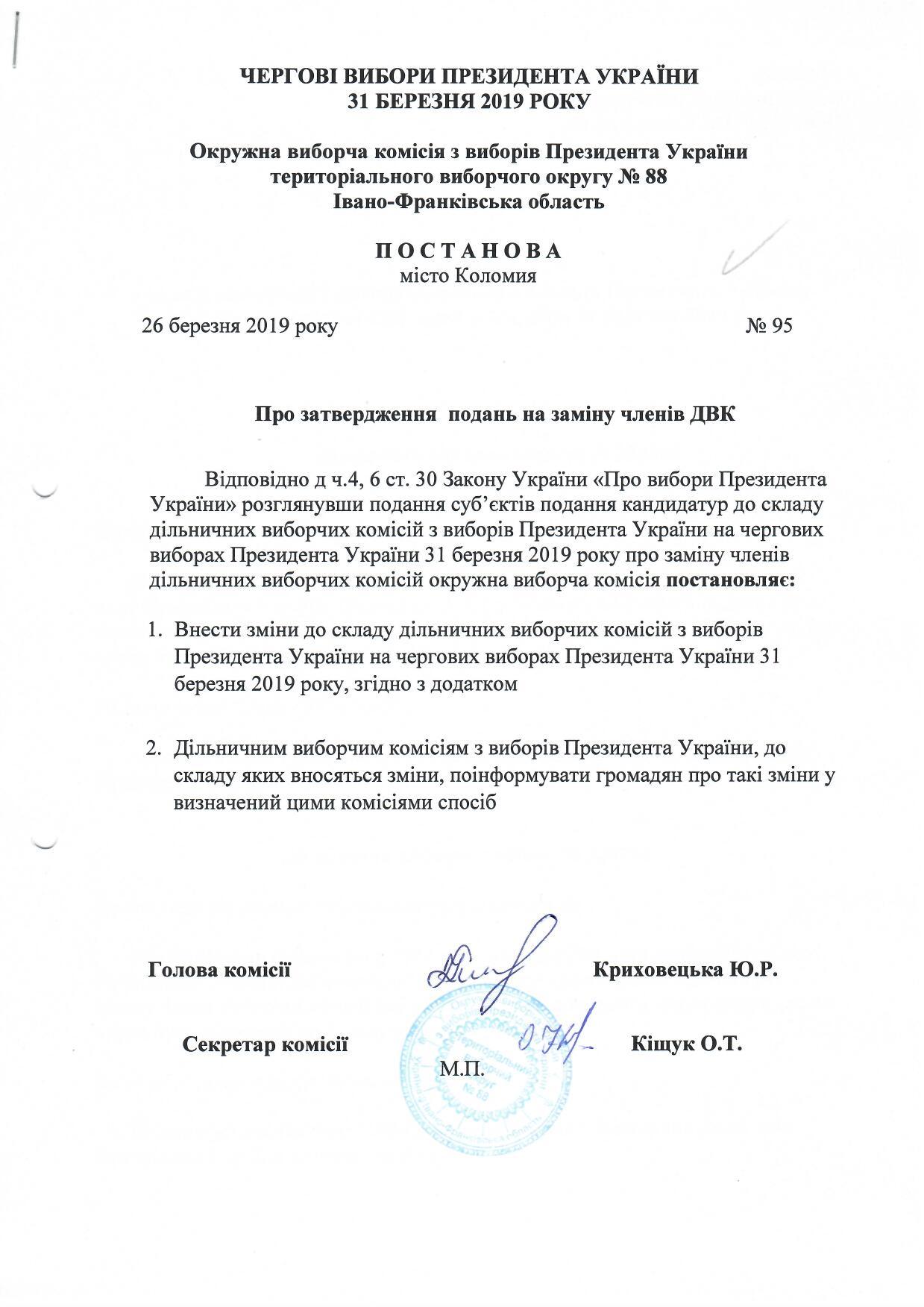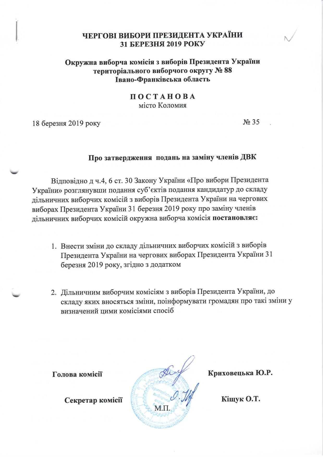 Про внесення змін до постанови № 21 від 12 березня 2019 року «Про формування ДВК» дільничної виборчої комісії № 88 |