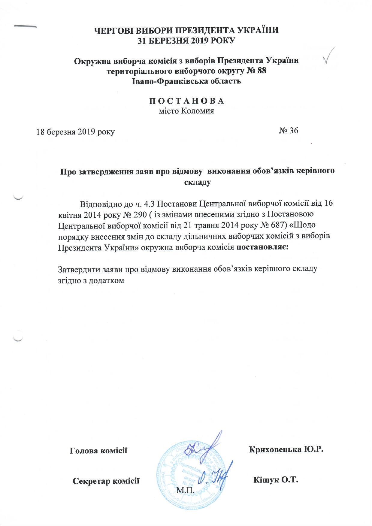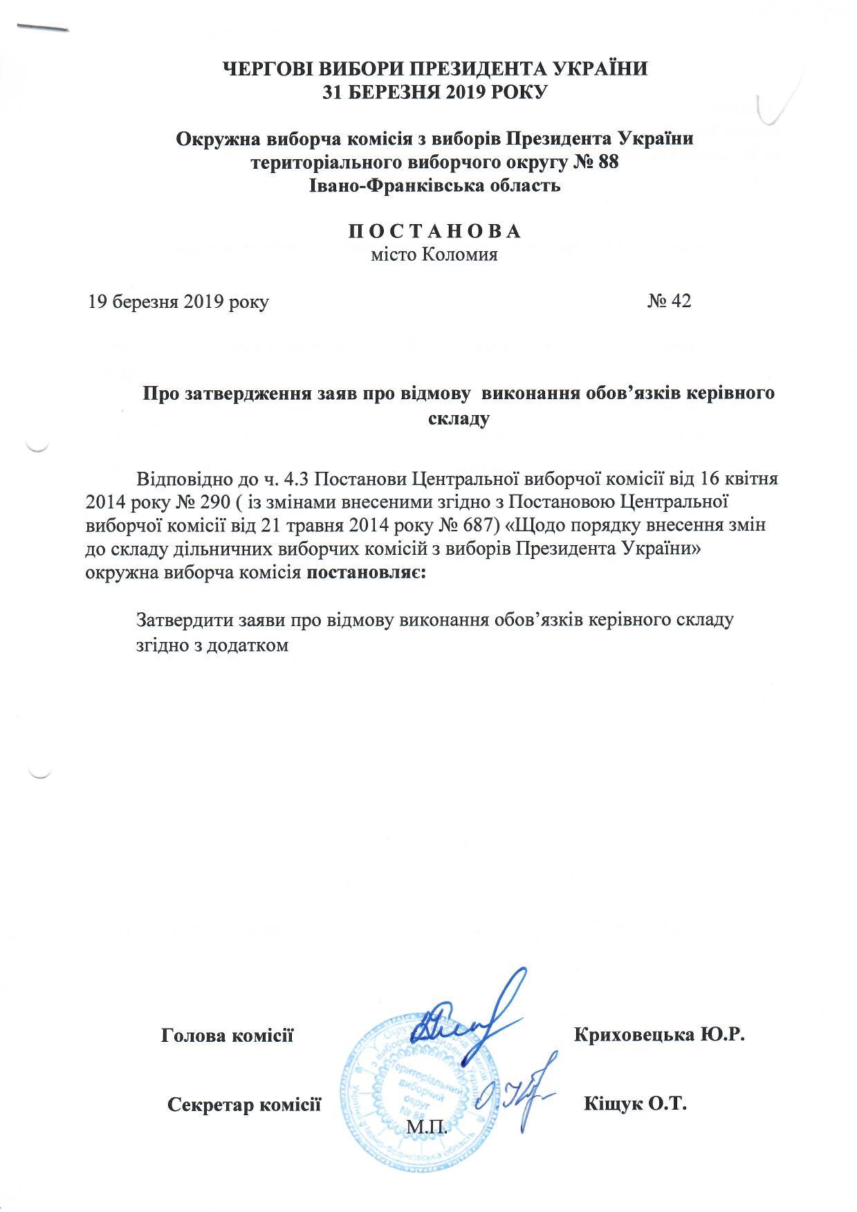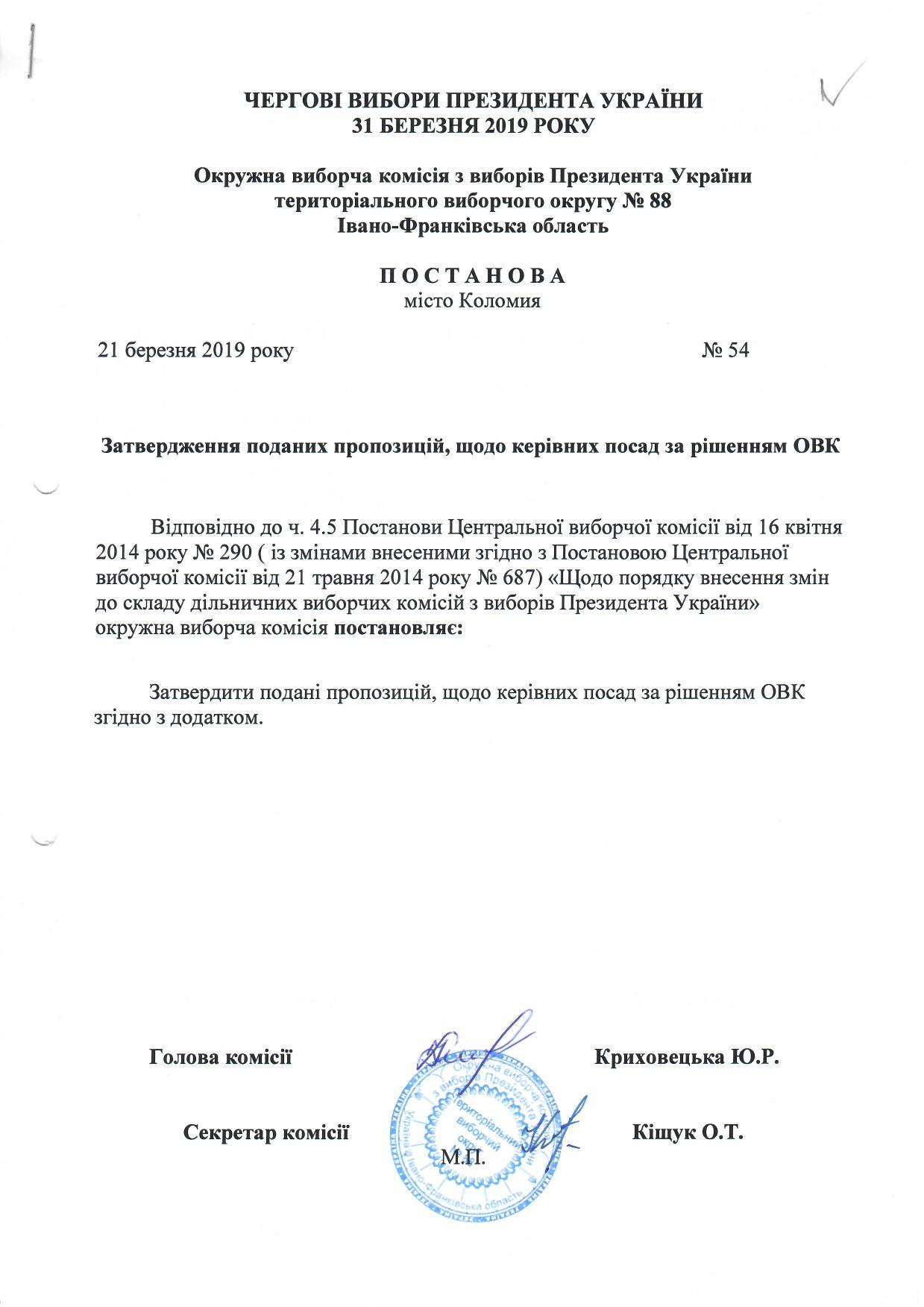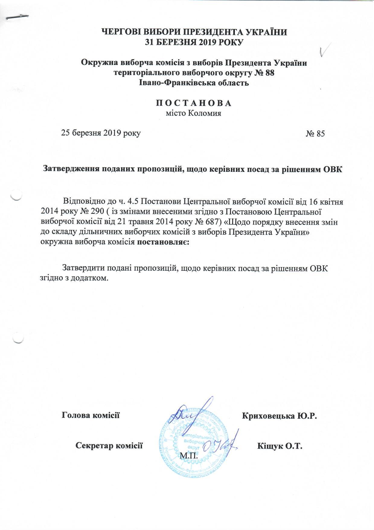 Про внесення змін до постанови № 21 від 12 березня 2019 року «Про формування ДВК» дільничної виборчої комісії № 88 |