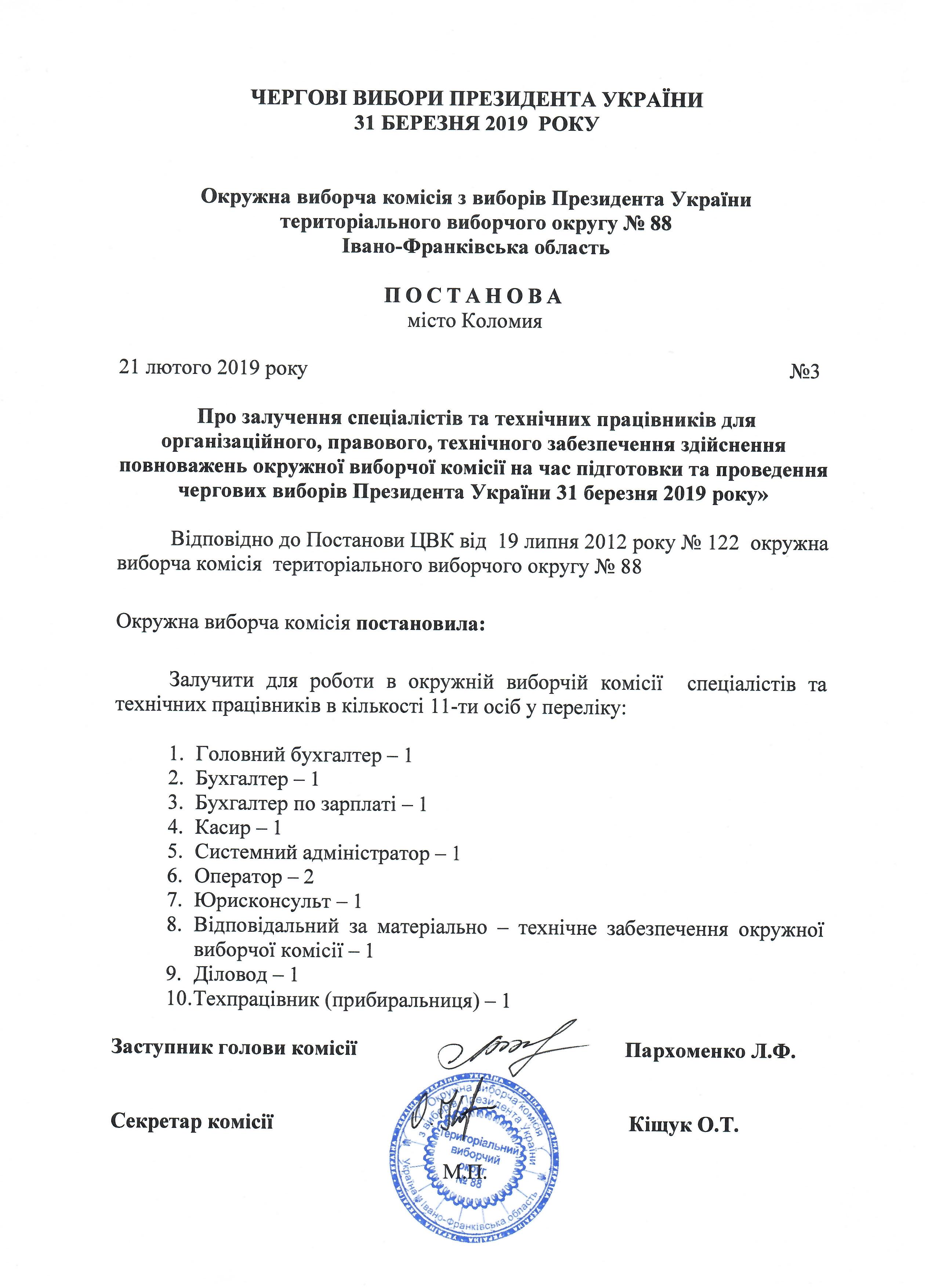 Про внесення змін до Постанови ОВК ТВО № 88 з виборів Президента України № 3 від 21 лютого 2019 року "Про залучення спеціалістів та технічних працівників для організаційного, правового, технічного забезпечення здійснення повноважень окружної виборчої комісії на час підготовки та проведення чергових виборів Президента України 31 березня 2019 року" |