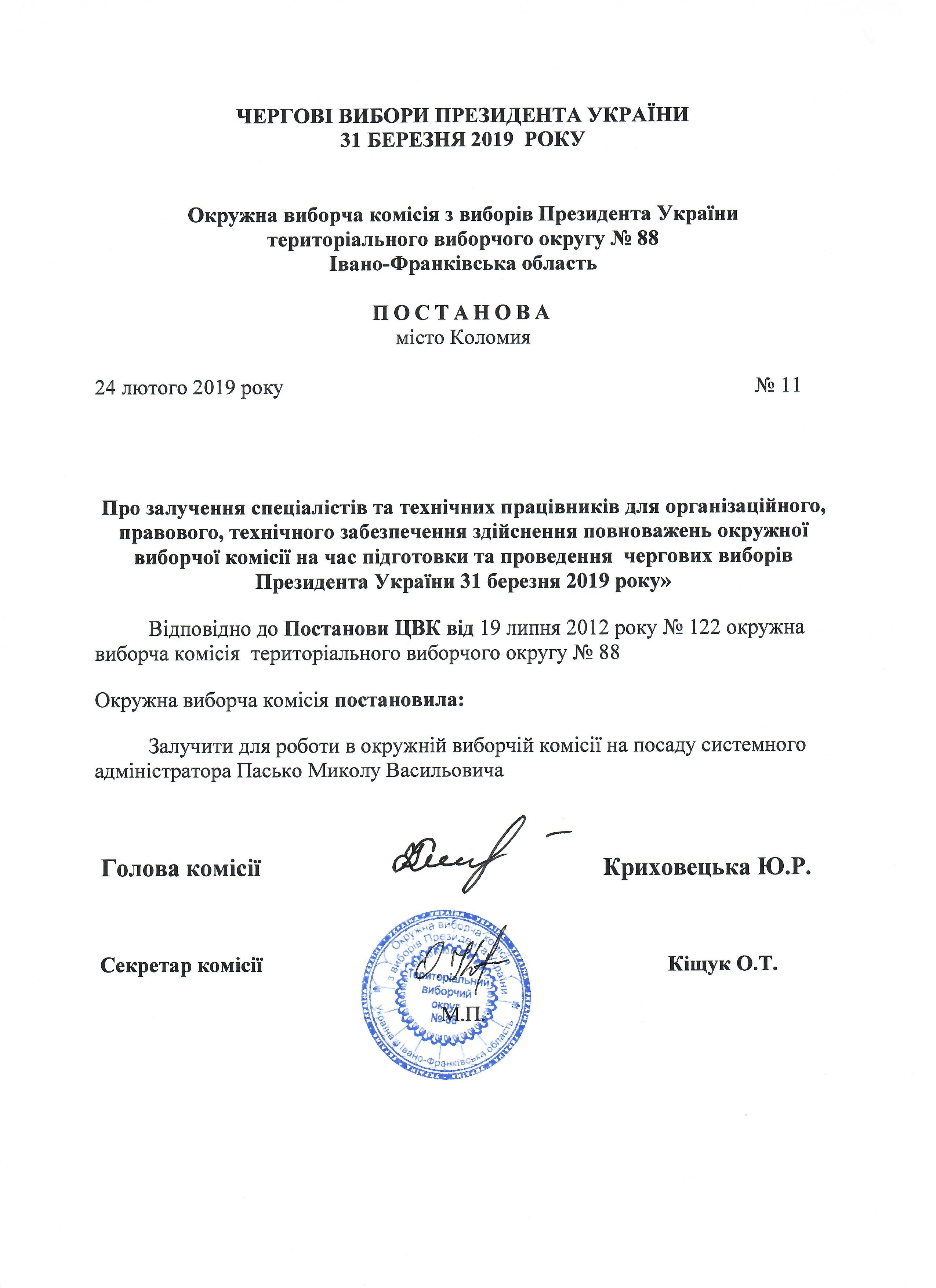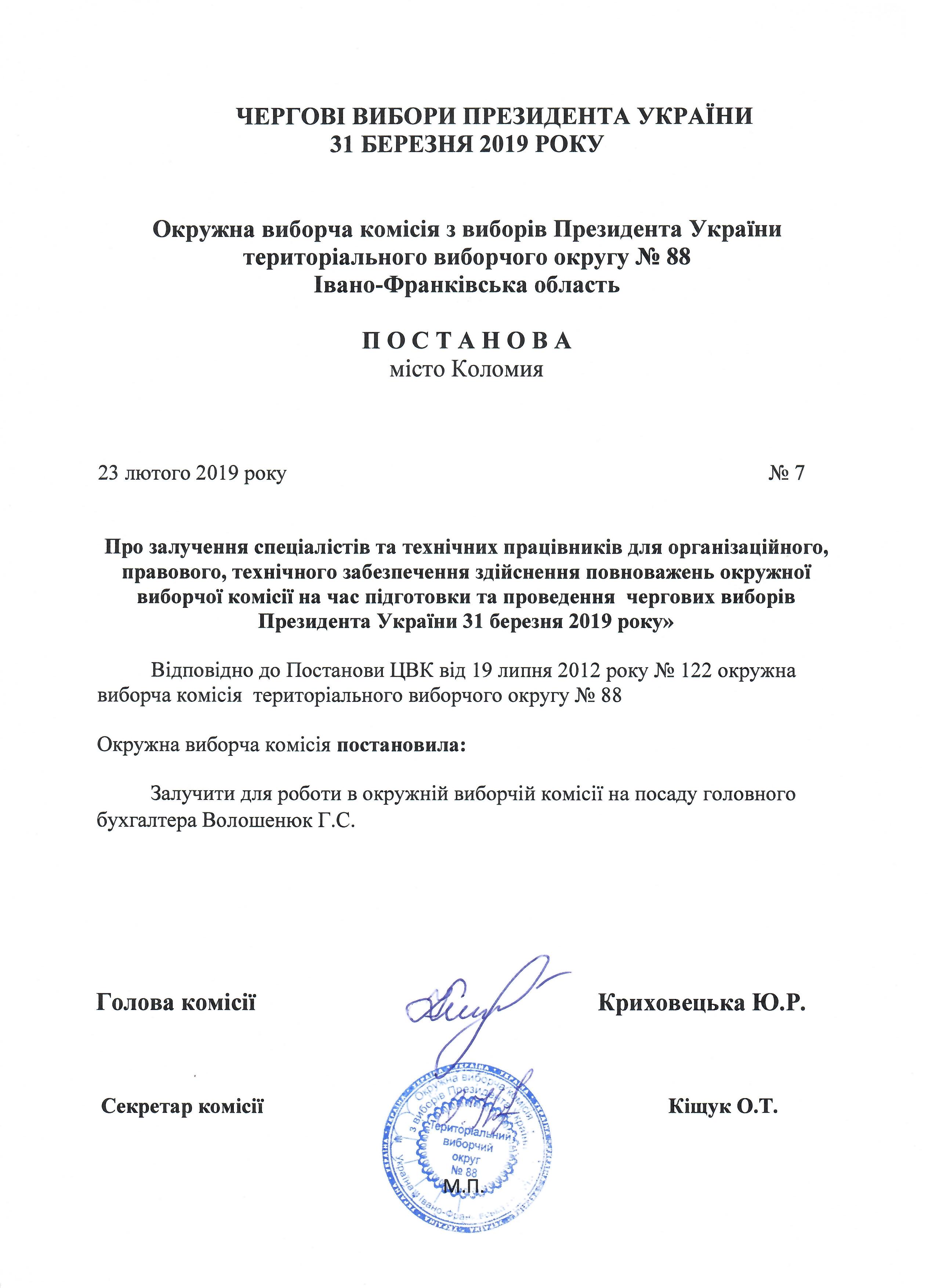 Про залучення спеціалістів та технічних працівників для організаційного, правового, технічного забезпечення здійснення повноважень окружної виборчої комісії на час підготовки та проведення чергових виборів Президента України 31 березня 2019 року |