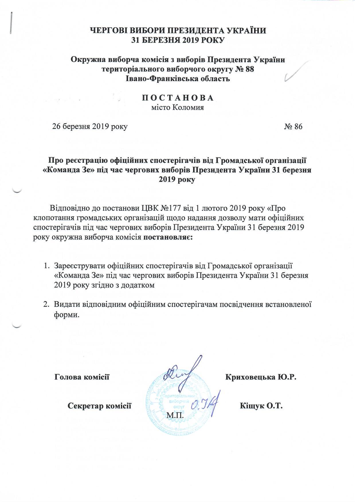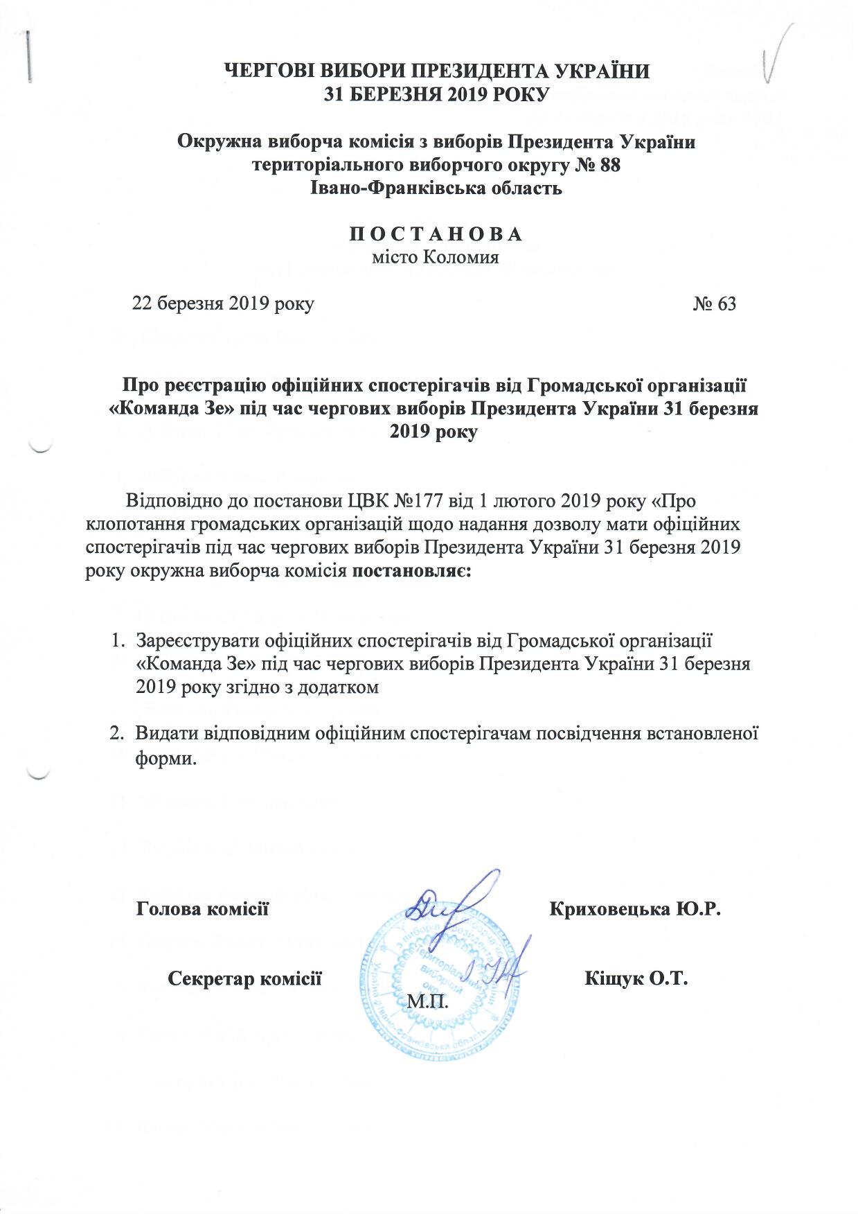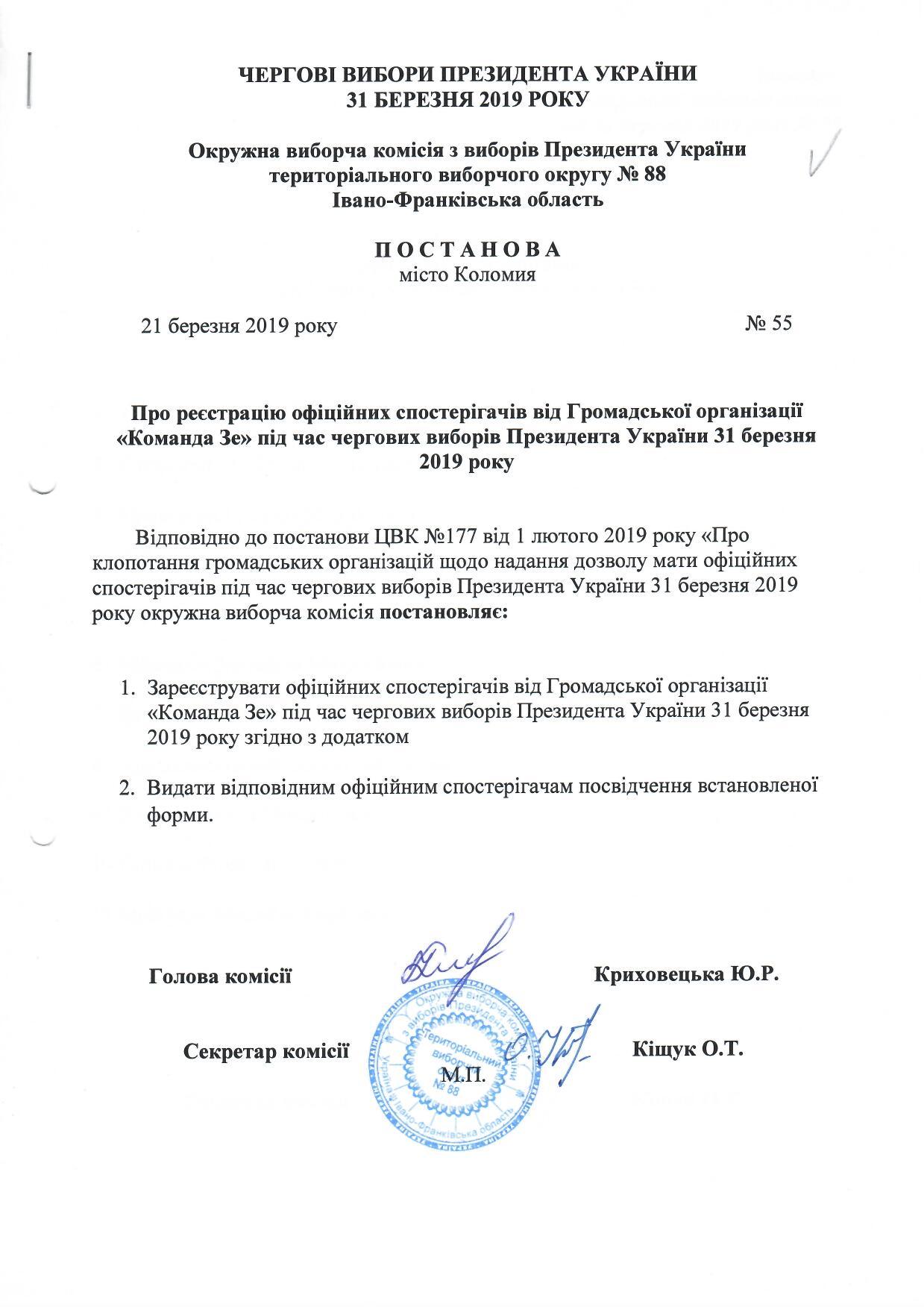 Про реєстрацію офіційних спостерігачів від Громадської організації «Команда Зе» під час чергових виборів Президента України 31 березня 2019 року |