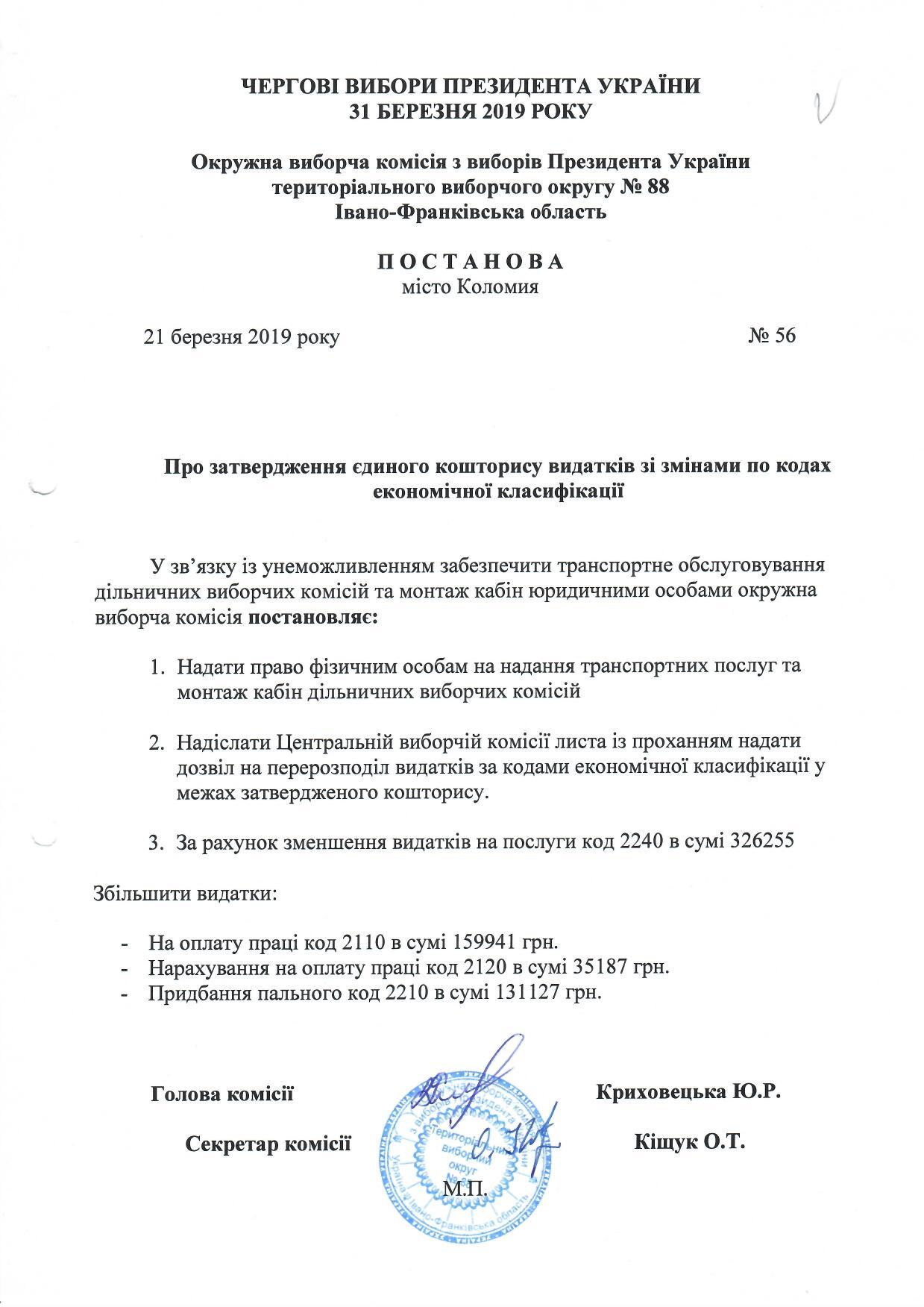 Про схвалення єдиного кошторису видатків ОВК з виборів Президента України ТВО № 88 для підготовки та проведення чергових виборів Президента України 31 березня 2019 року |
