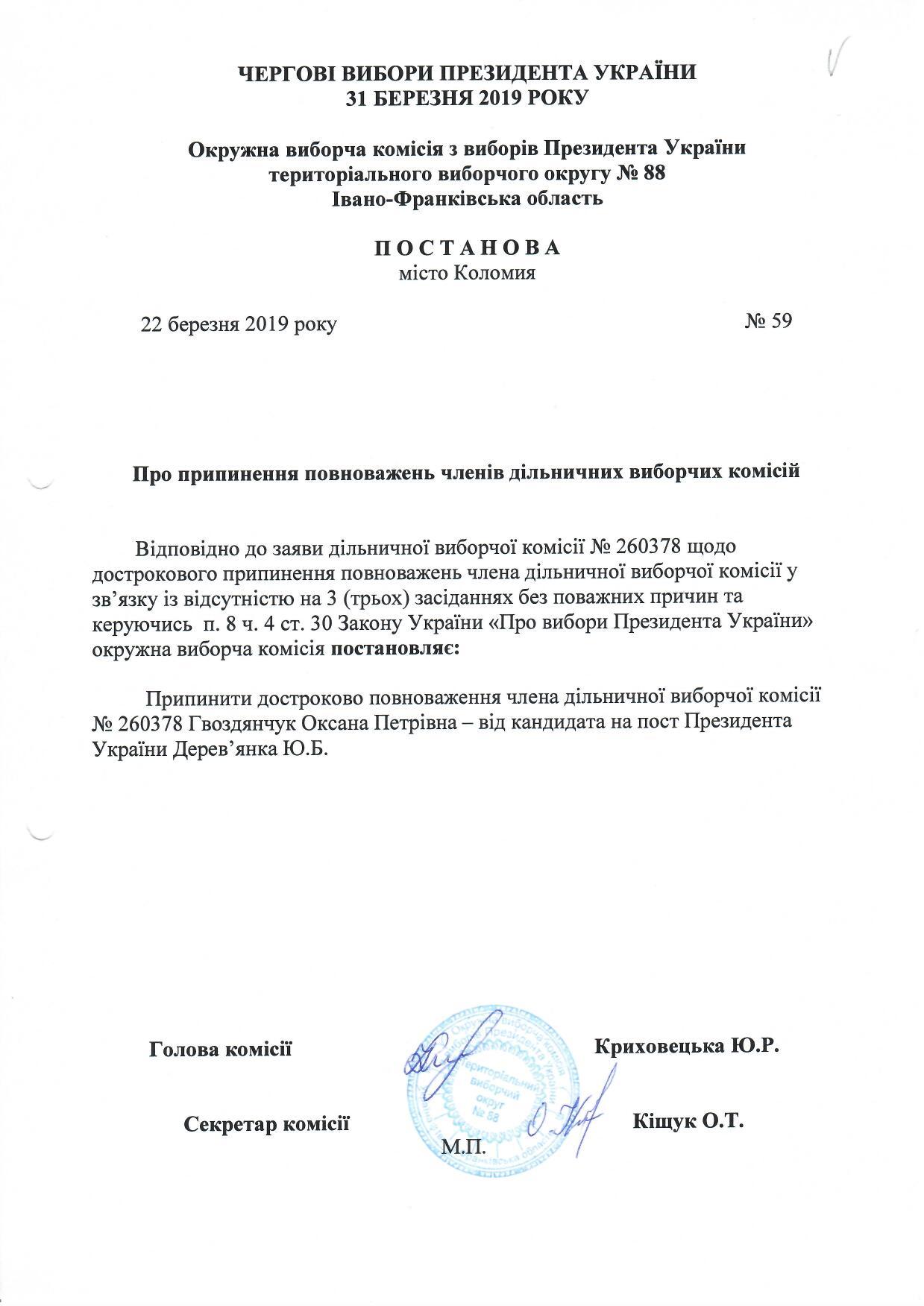 Про реєстрацію офіційних спостерігачів від кандидата на пост Президента України Дерев’янка Ю.Б. під час чергових виборів Президента України 31 березня 2019 року |