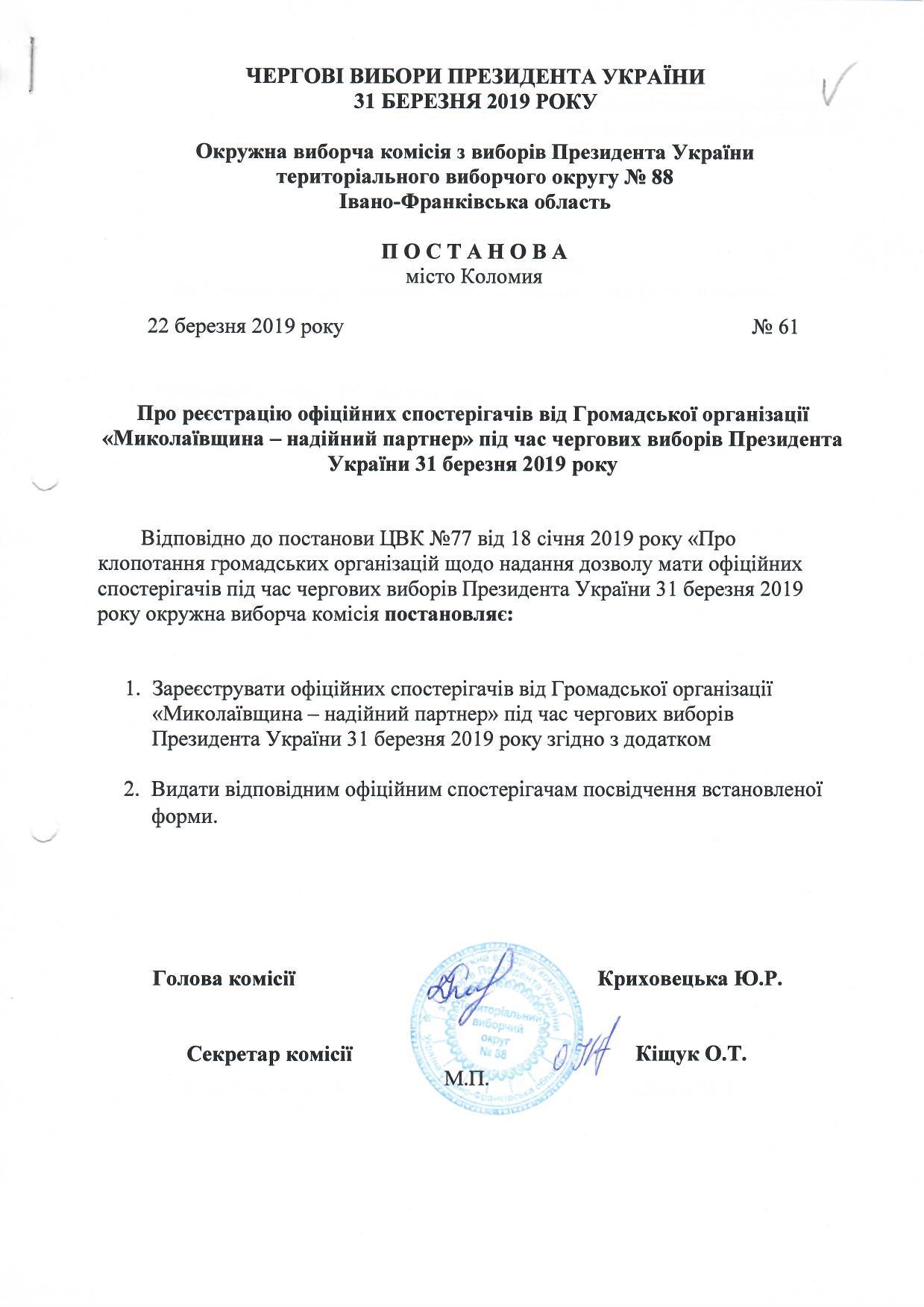 Про реєстрацію офіційних спостерігачів від Громадської організації «Миколаївщина – надійний партнер» під час чергових виборів Президента України 31 березня 2019 року |