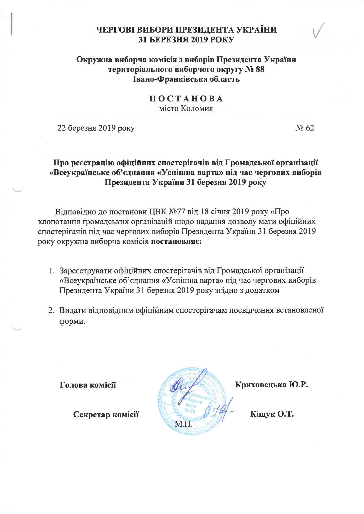 Про реєстрацію офіційних спостерігачів від Громадської організації «Всеукраїнське об’єднання «Успішна варта» під час чергових виборів Президента України 31 березня 2019 року |