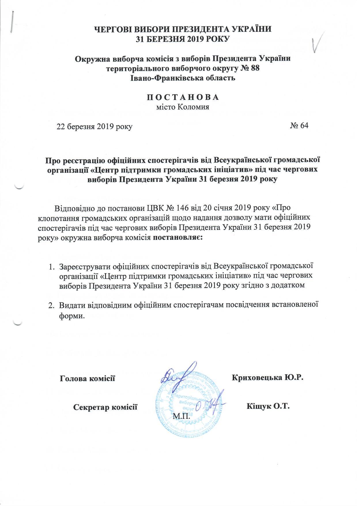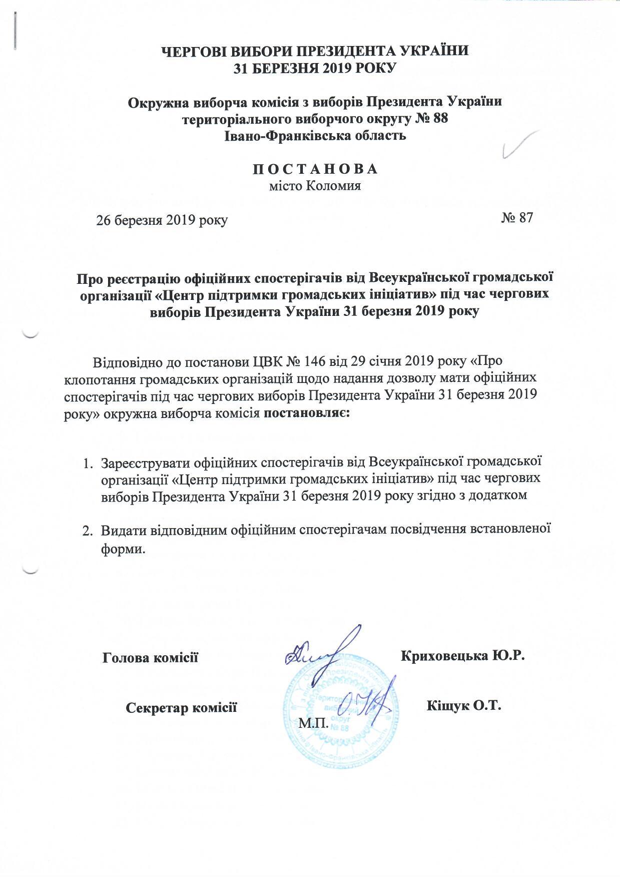 Про реєстрацію офіційних спостерігачів від Всеукраїнської громадської організації «Центр підтримки громадських ініціатив» під час чергових виборів Президента України 31 березня 2019 року |