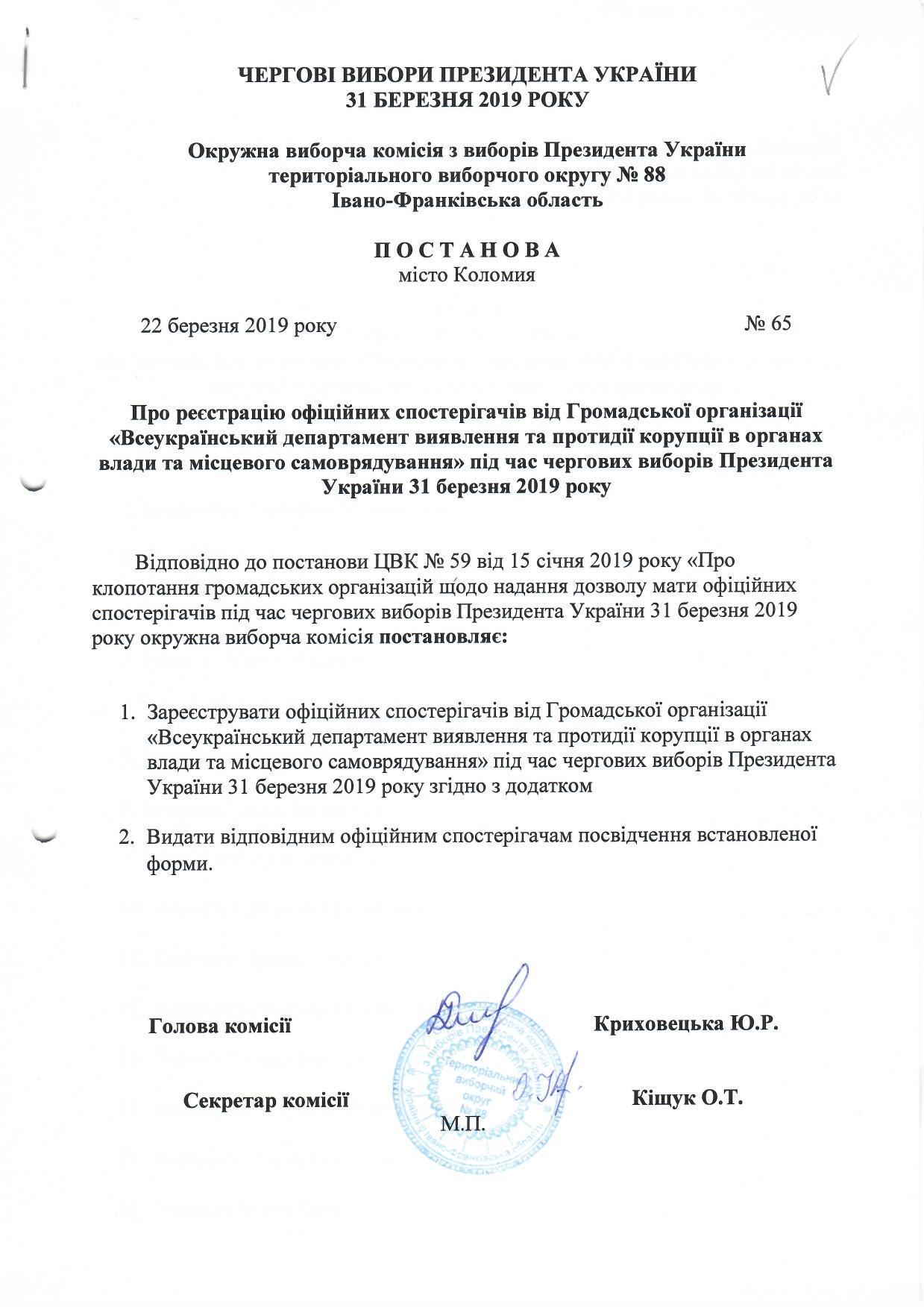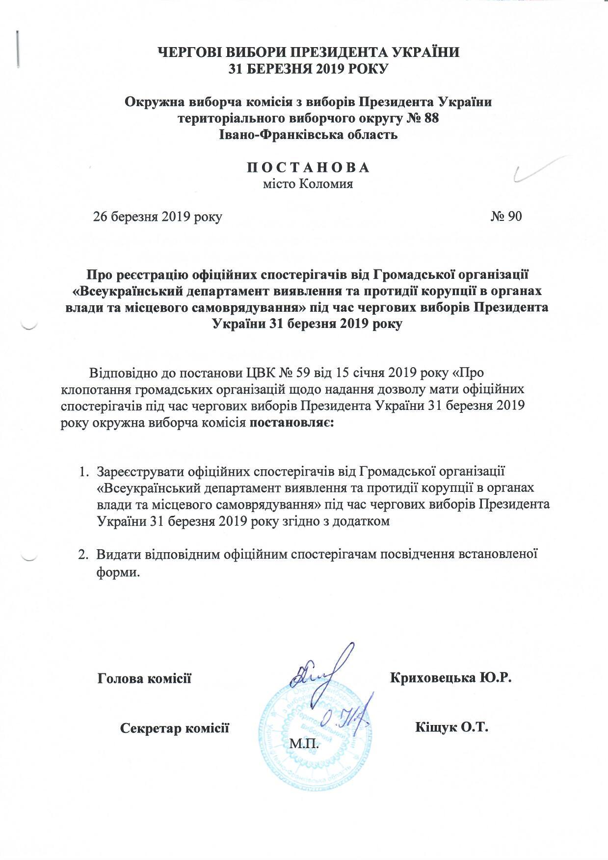 Про реєстрацію офіційних спостерігачів від Громадської організації «Всеукраїнський департамент виявлення та протидії корупції в органах влади та місцевого самоврядування» під час чергових виборів Президента України 31 березня 2019 року |
