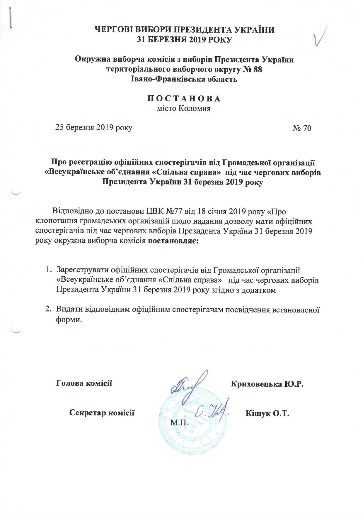 Про реєстрацію офіційних спостерігачів від Громадської організації «Всеукраїнське об’єднання «Спільна справа» під час чергових виборів Президента України 31 березня 2019 року |
