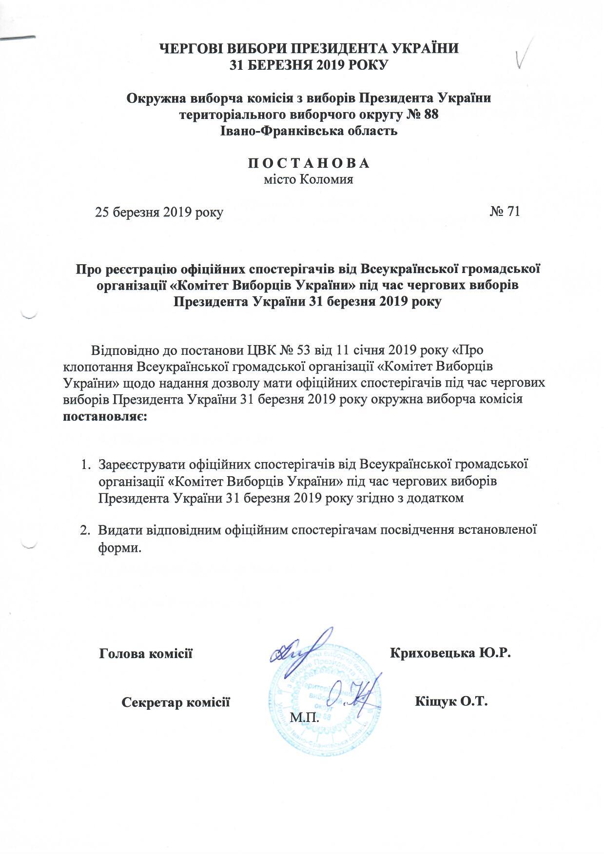 Про реєстрацію офіційних спостерігачів від Всеукраїнської громадської організації «Комітет Виборців України» під час чергових виборів Президента України 31 березня 2019 року |