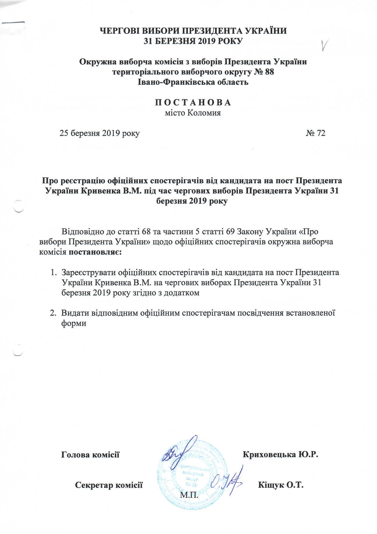 Про реєстрацію офіційних спостерігачів від кандидата на пост Президента України Кривенка В.М. під час чергових виборів Президента України 31 березня 2019 року |