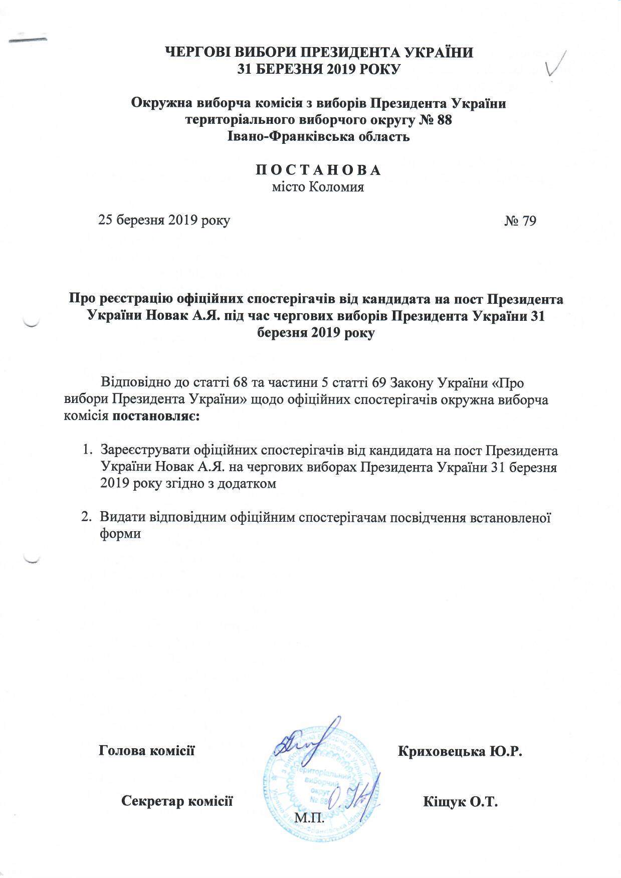 Про реєстрацію офіційних спостерігачів від кандидата на пост Президента України Новак А.Я. під час чергових виборів Президента України 31 березня 2019 року |