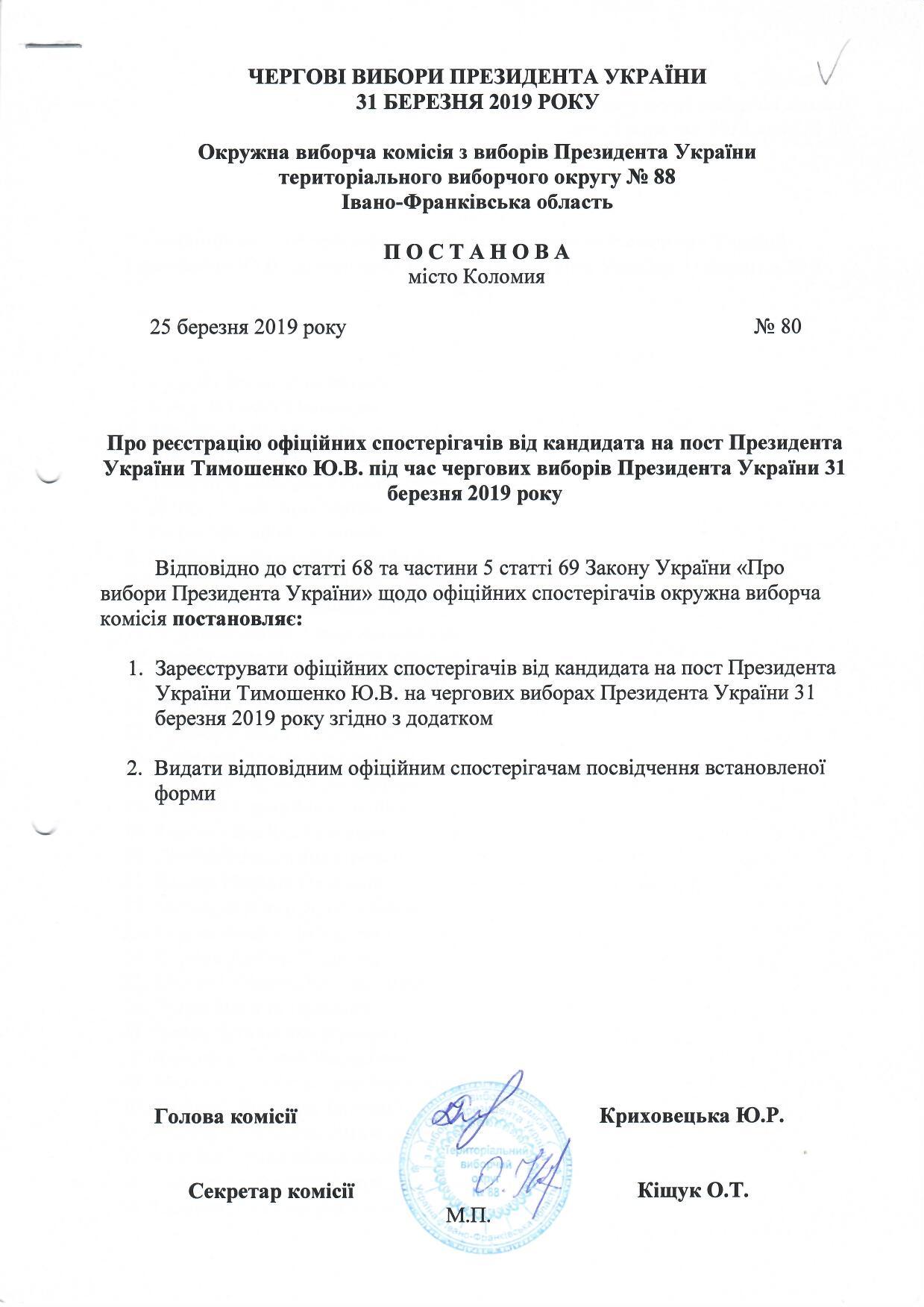 Про реєстрацію офіційних спостерігачів від кандидата на пост Президента України Тимошенко Ю.В. під час чергових виборів Президента України 31 березня 2019 року |