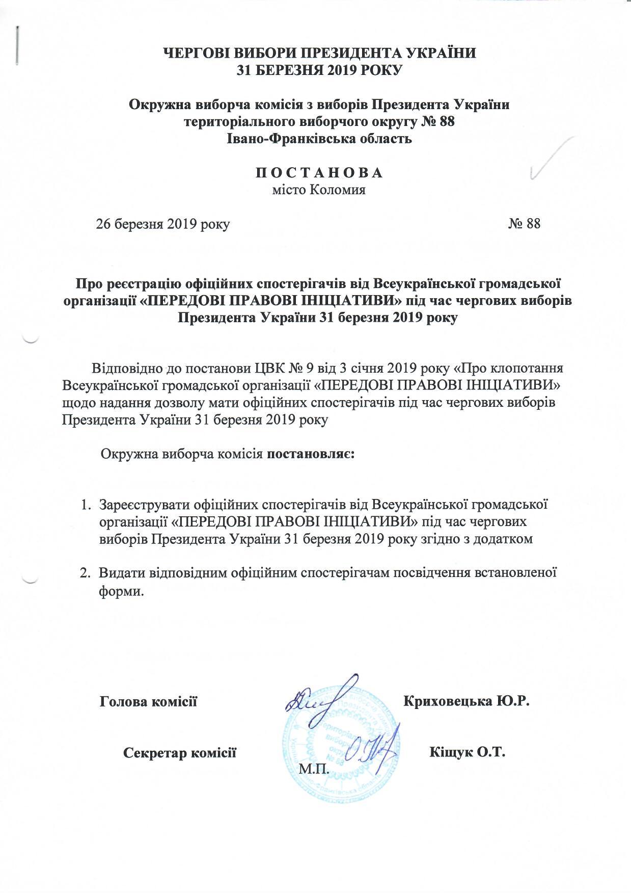 Про реєстрацію офіційних спостерігачів від Всеукраїнської громадської організації «ПЕРЕДОВІ ПРАВОВІ ІНІЦІАТИВИ» під час чергових виборів Президента України 31 березня 2019 року |