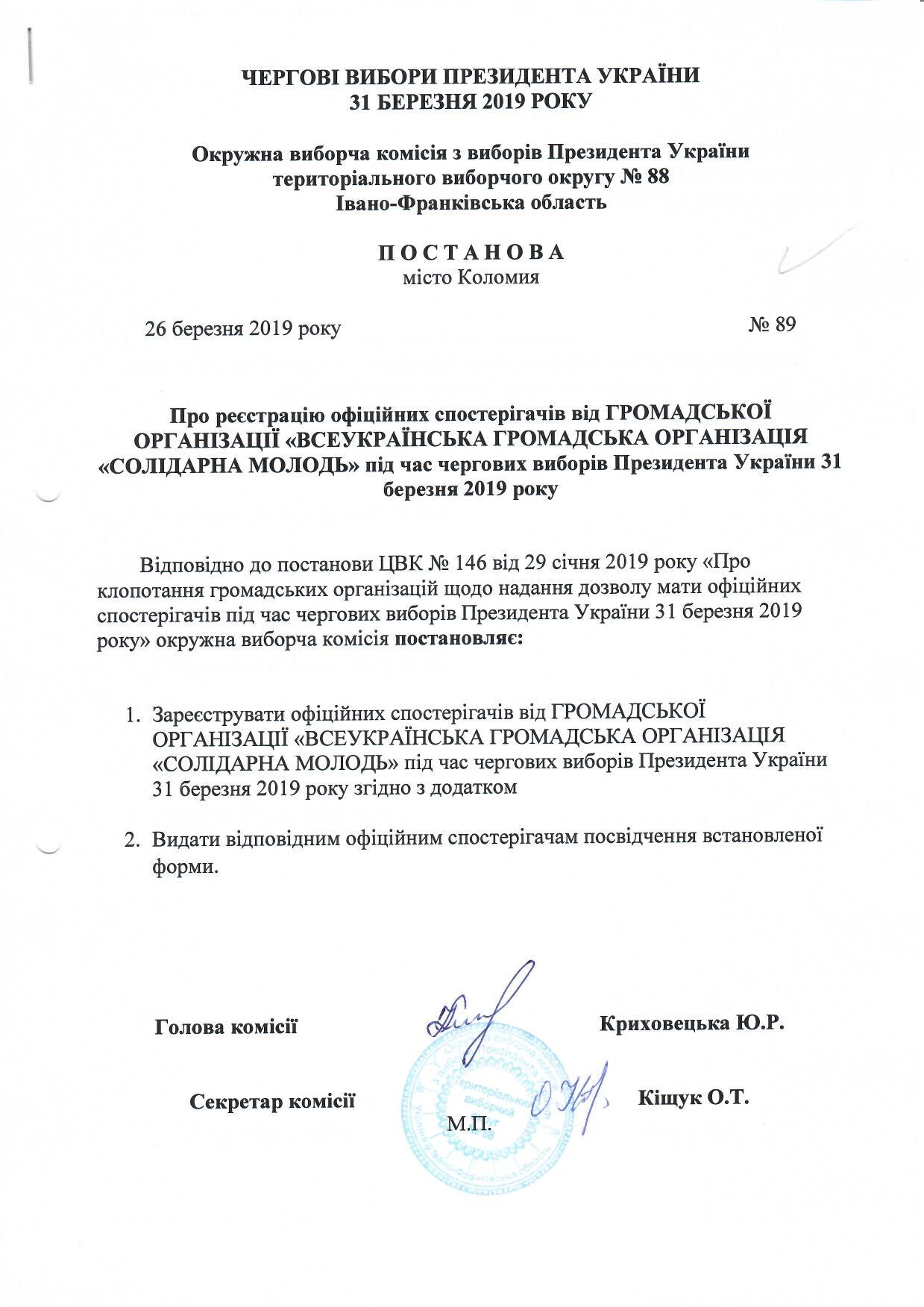 Про реєстрацію офіційних спостерігачів від ГРОМАДСЬКОЇ ОРГАНІЗАЦІЇ «ВСЕУКРАЇНСЬКА ГРОМАДСЬКА ОРГАНІЗАЦІЯ «СОЛІДАРНА МОЛОДЬ» під час чергових виборів Президента України 31 березня 2019 року |