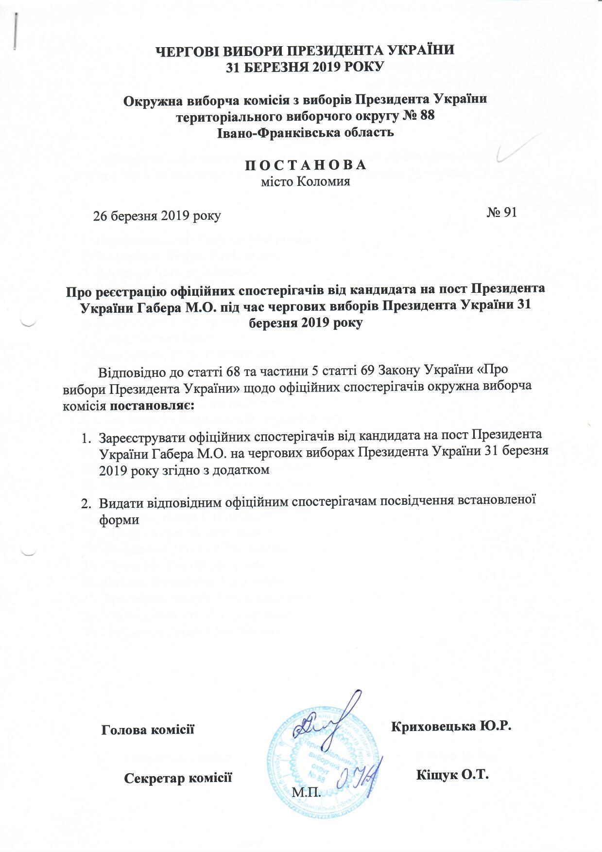Про реєстрацію офіційних спостерігачів від кандидата на пост Президента України Габера М.О. під час чергових виборів Президента України 31 березня 2019 року |