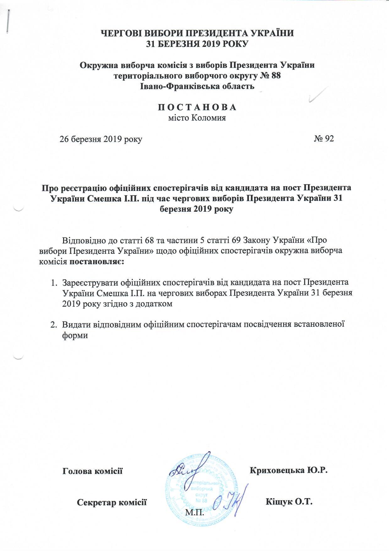 Про реєстрацію офіційних спостерігачів від кандидата на пост Президента України Смешка І.П. під час чергових виборів Президента України 31 березня 2019 року |