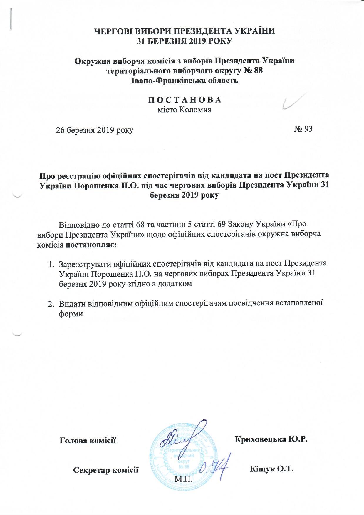 Про реєстрацію офіційних спостерігачів від кандидата на пост Президента України Порошенка П.О. під час чергових виборів Президента України 31 березня 2019 року |