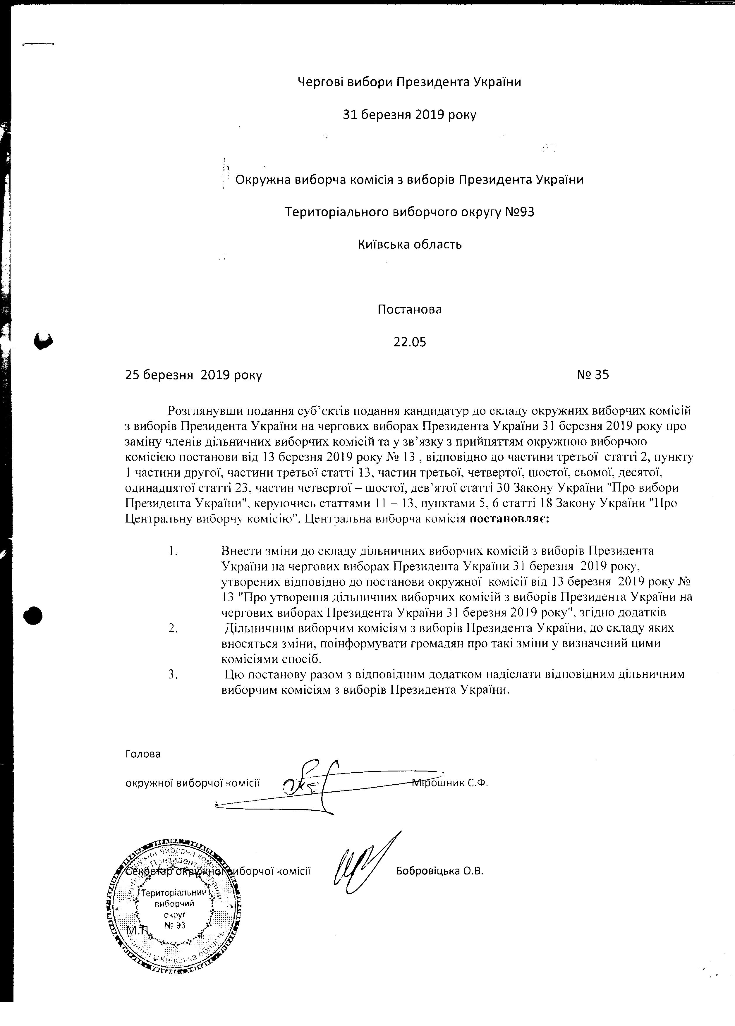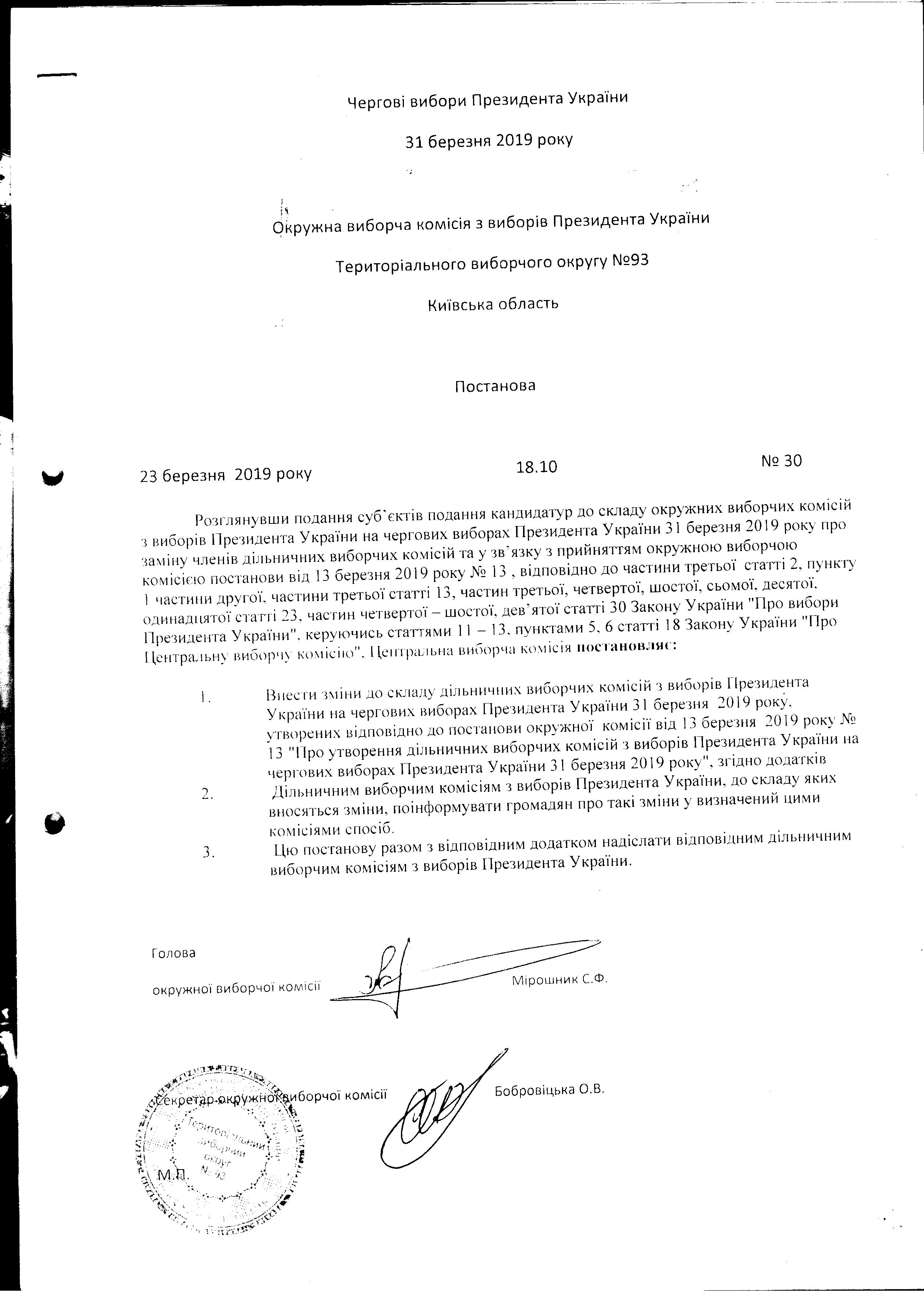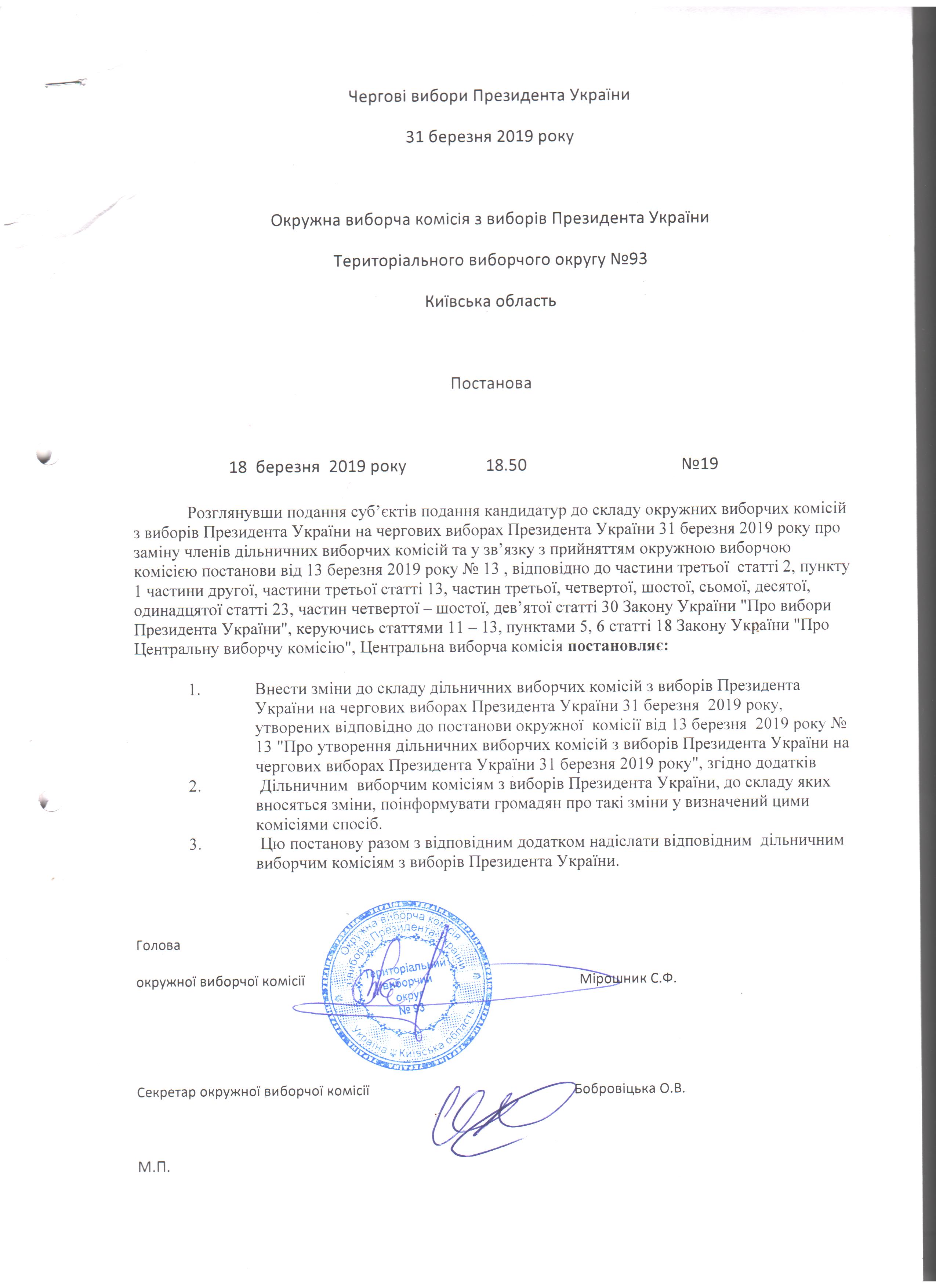 Про внесення змін до складу ДВК, на основі постанови від 13 березня 2019 р. ТВО №93. |