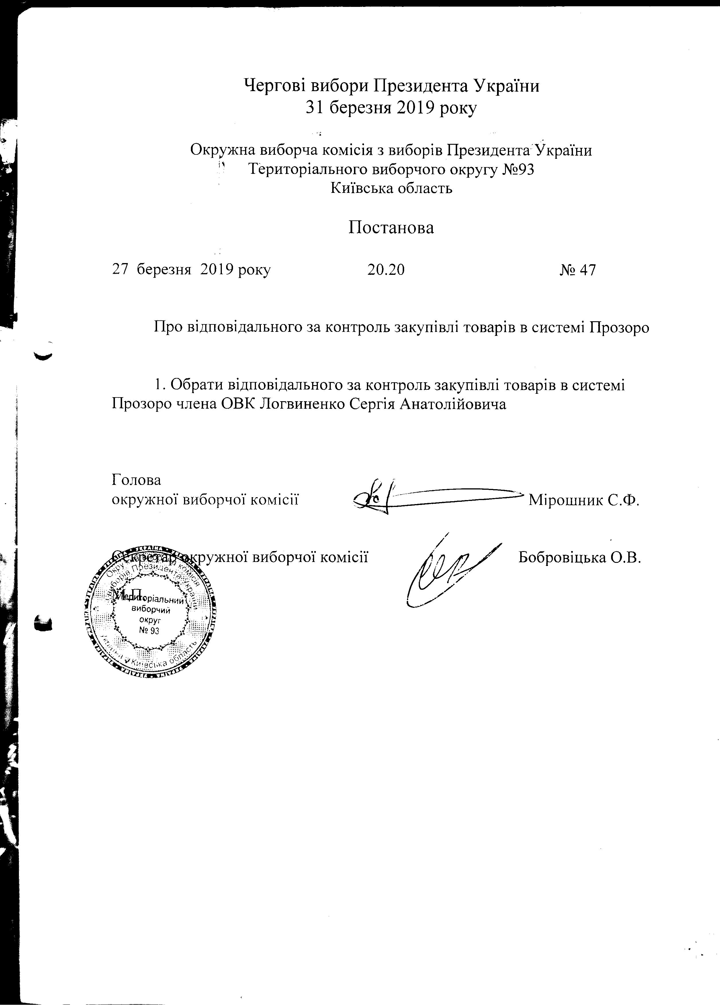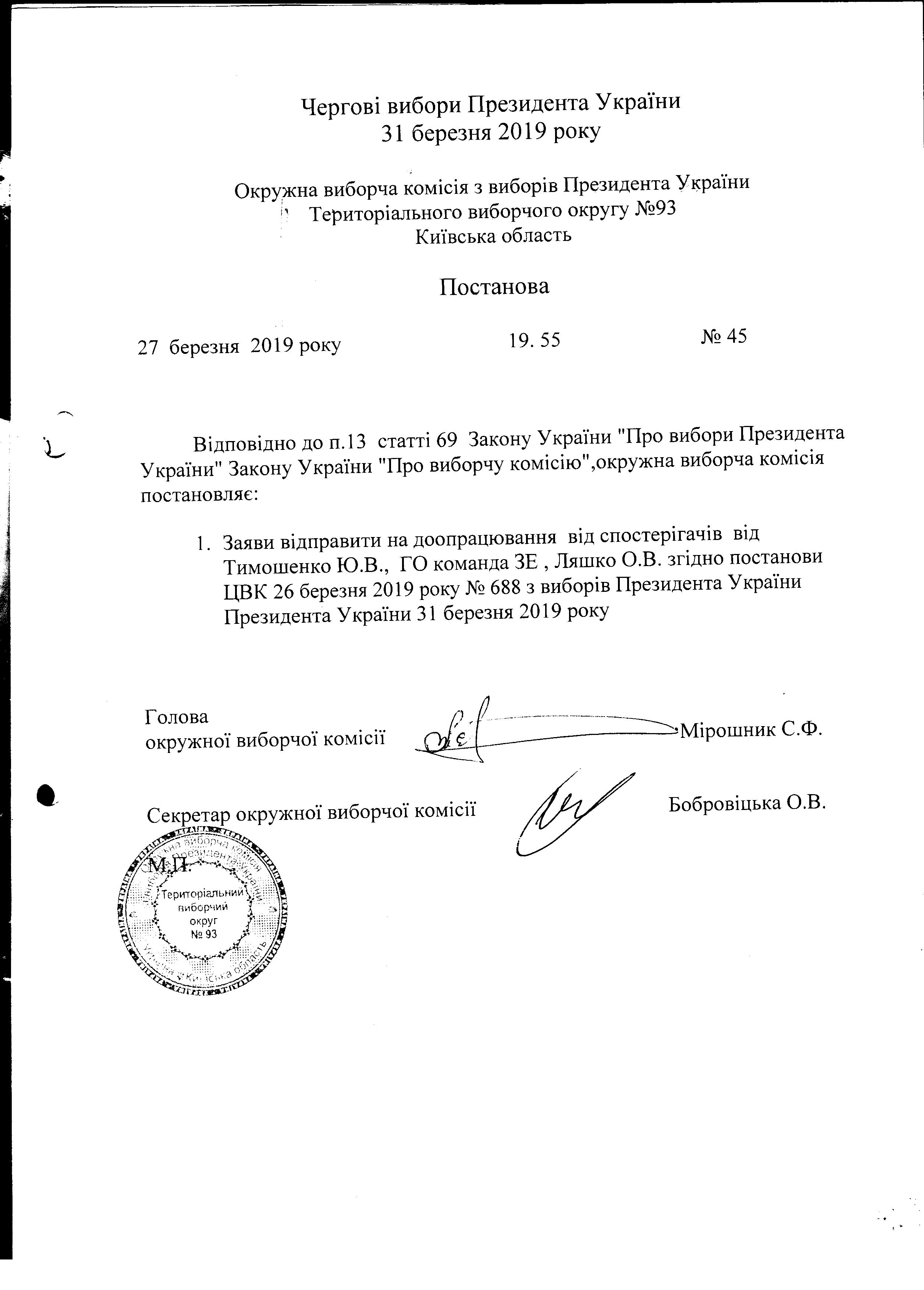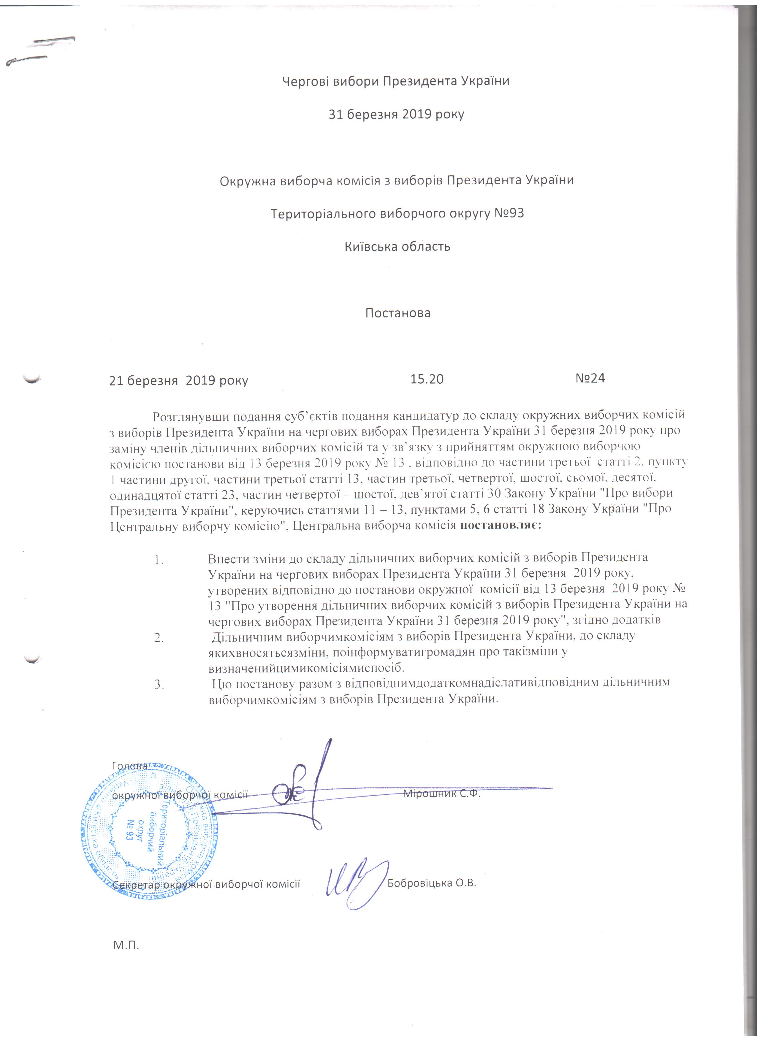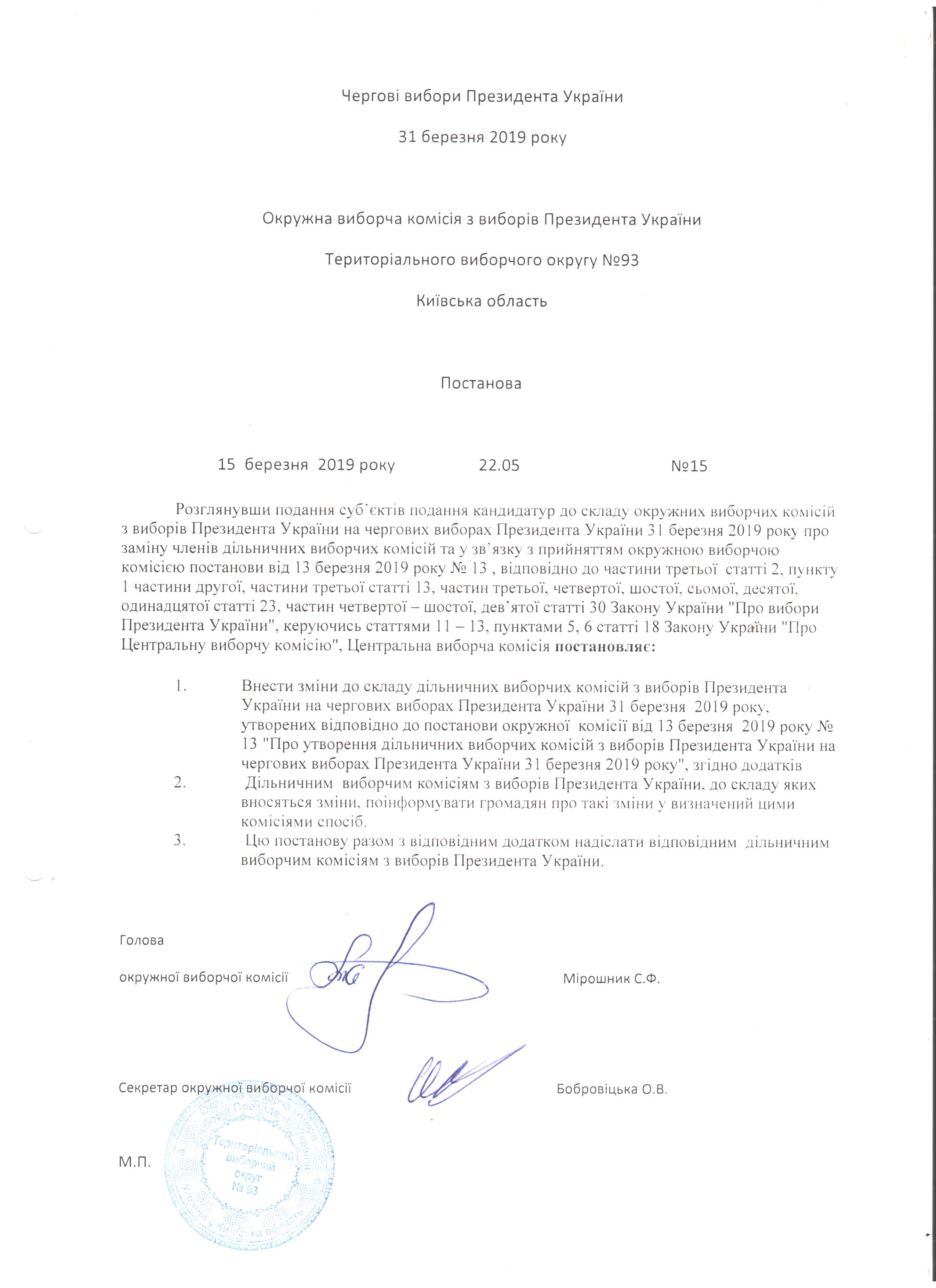 Про внесення змін до складу ДВК, на основі постанови від 13 березня 2019 р. ТВО №93. |