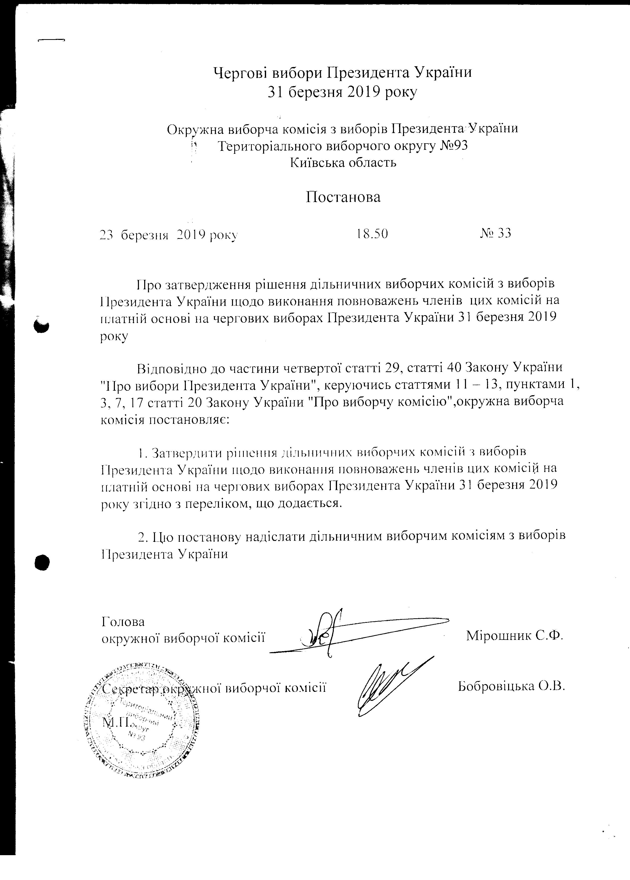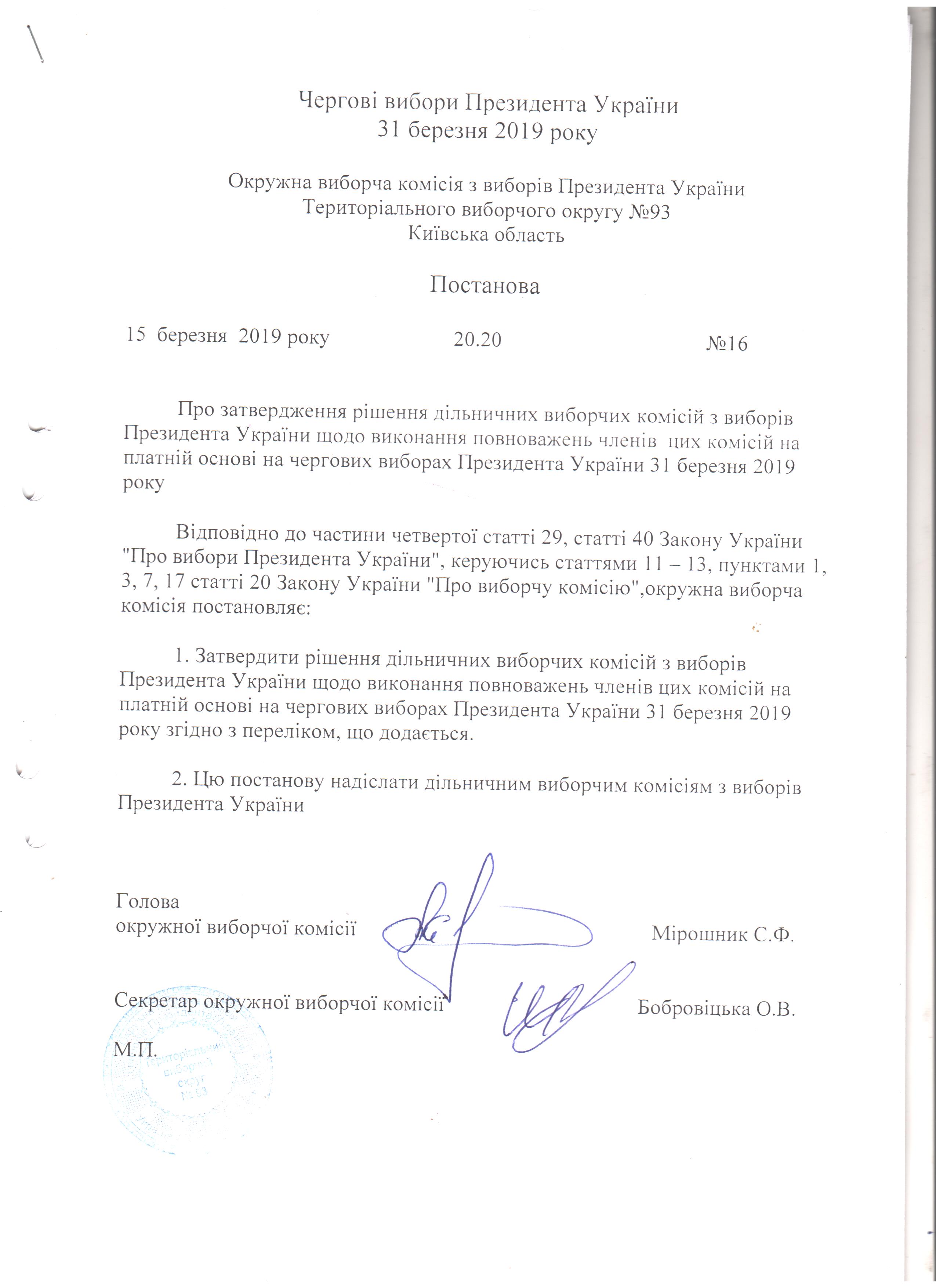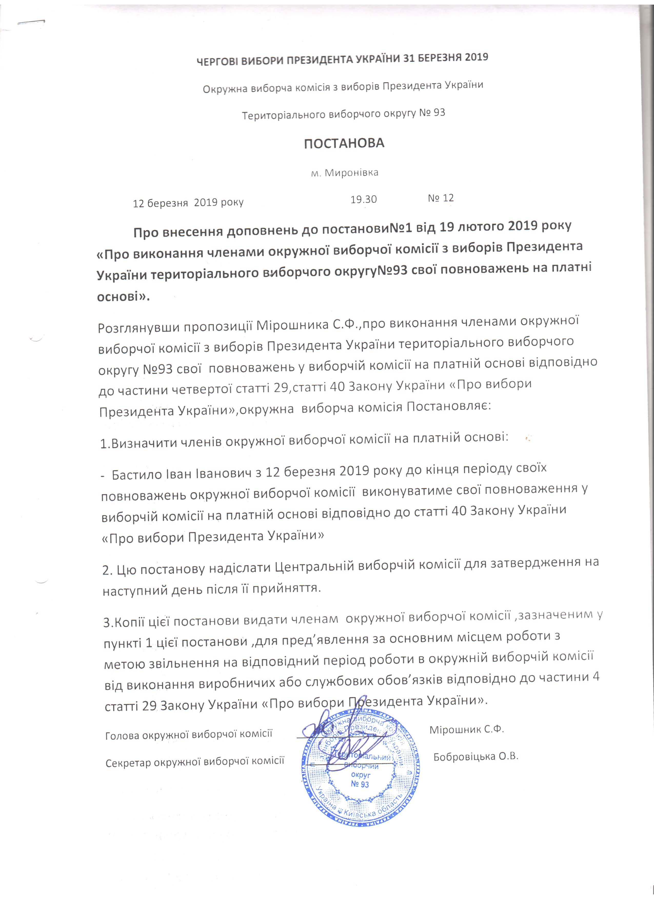 Про внесення доповнень до постанови № 1 від 19 лютого 2019 року "Про виконання членами окружної виборчої комісії з виборів Президента України територіального виборчого округу № 93 свої повноважень на платні основі" |