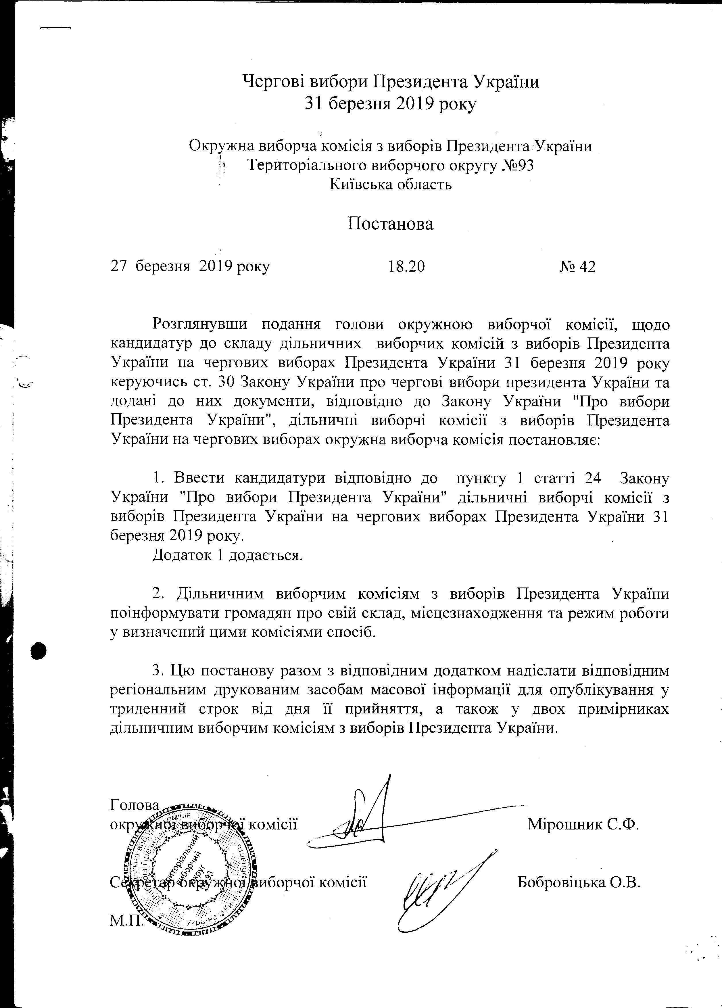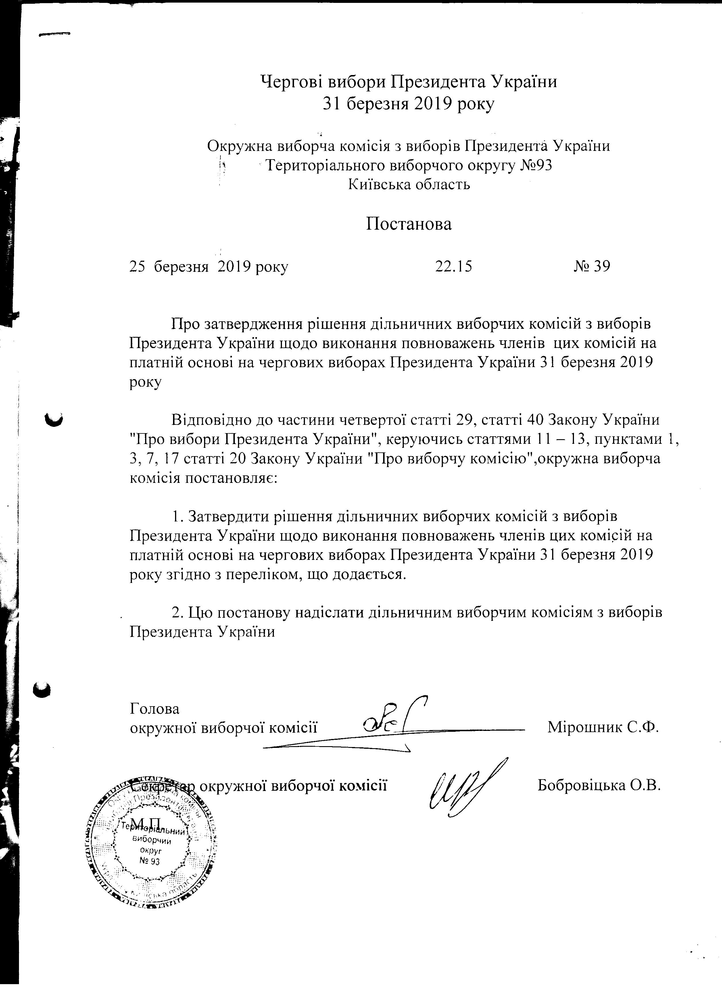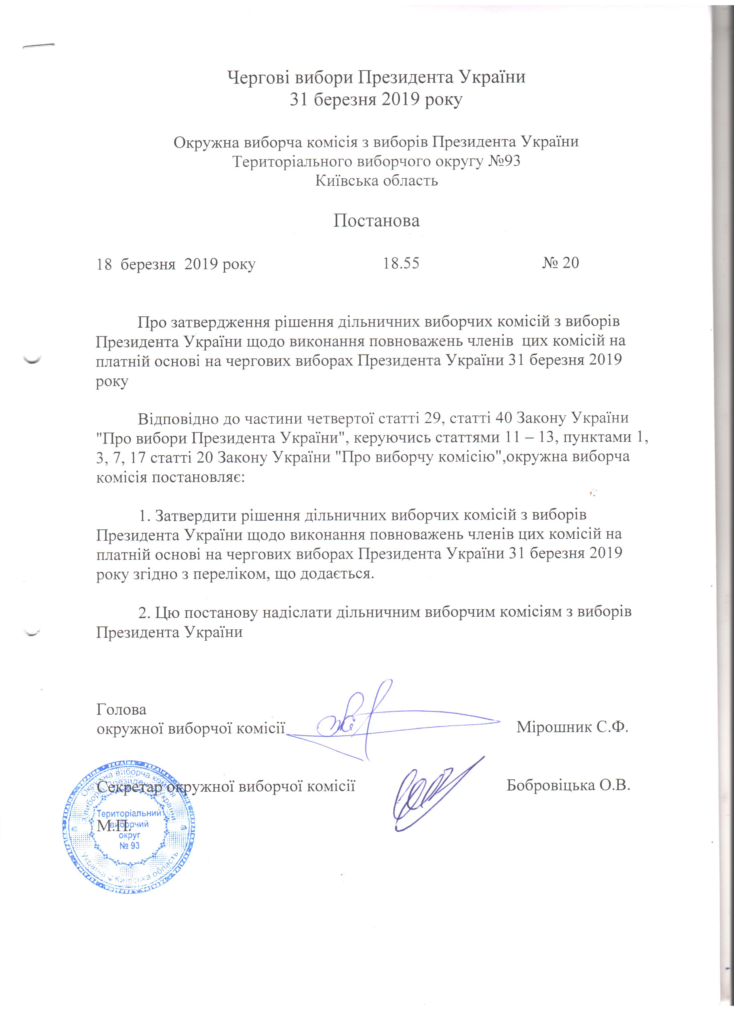 Про внесення доповнень до постанови № 1 від 19 лютого 2019 року "Про виконання членами окружної виборчої комісії з виборів Президента України територіального виборчого округу № 93 свої повноважень на платні основі" |