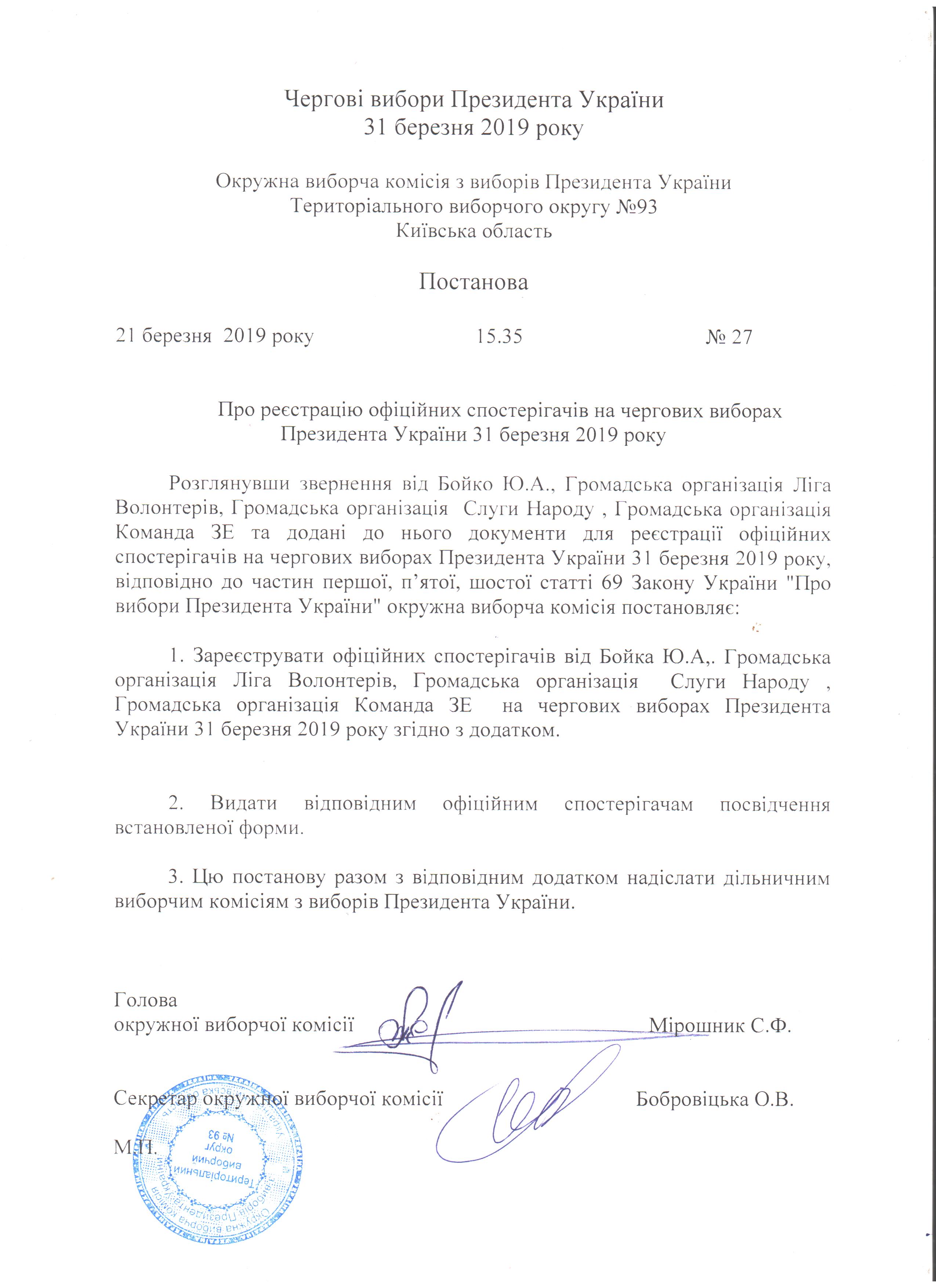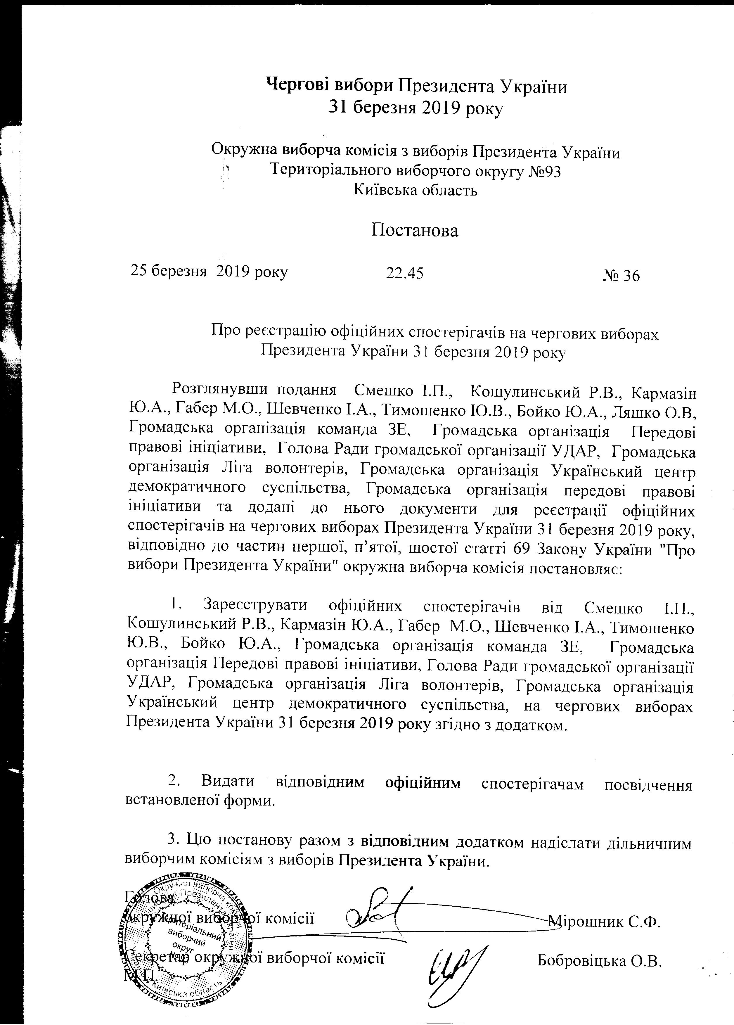 Про реєстрацію офіційних спостерігачів від Всеукраїнської громадської організації "Громадська мережа "ОПОРА" ОВК виборчого округу № 93 |